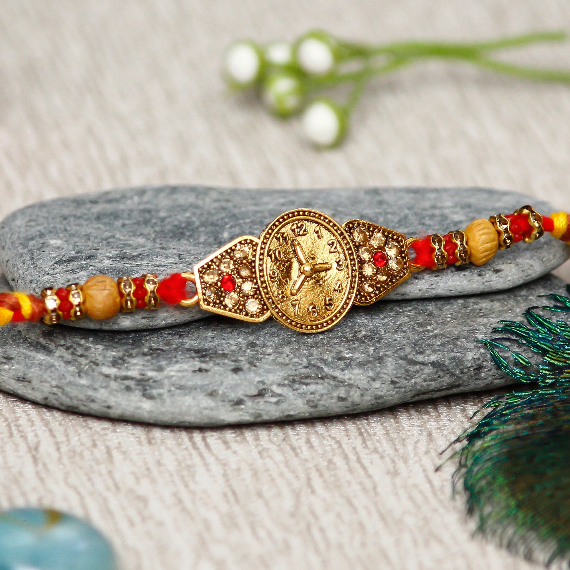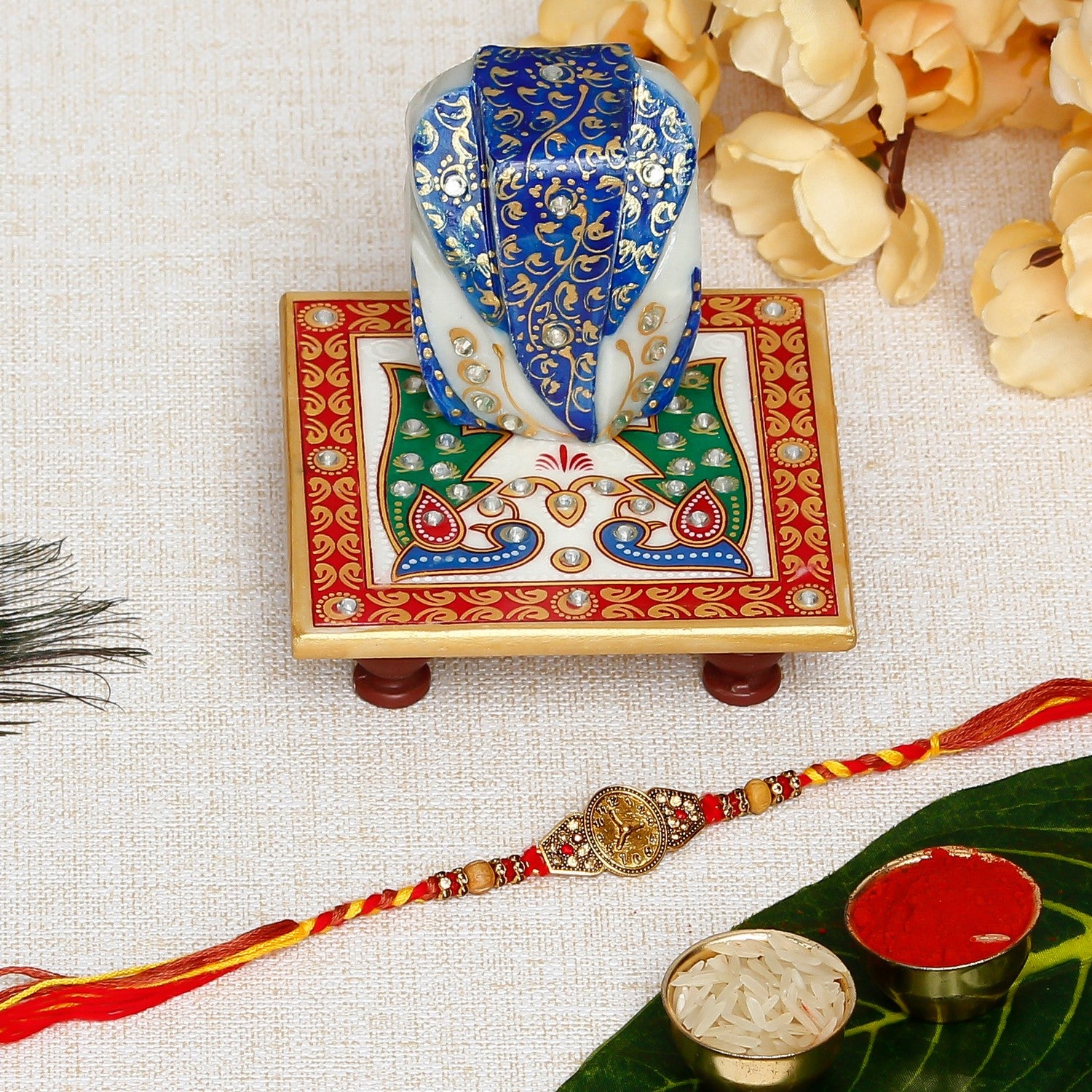 Designer Watch Pattern Rakhi with Lord Ganesha on Marble Chowki and Roli Chawal Pack - eCraftIndia Online