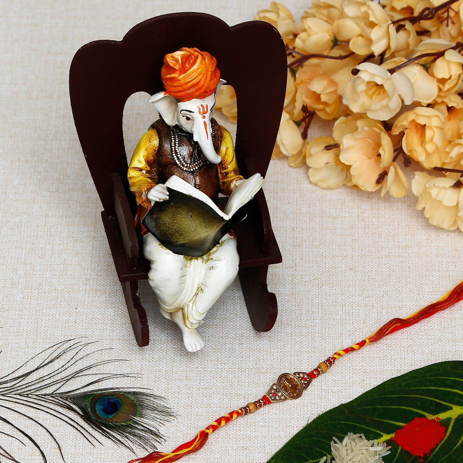 Designer Watch Pattern Rakhi with Lord Ganesha reading Book on Wooden Chair and Roli Chawal Pack - eCraftIndia Online
