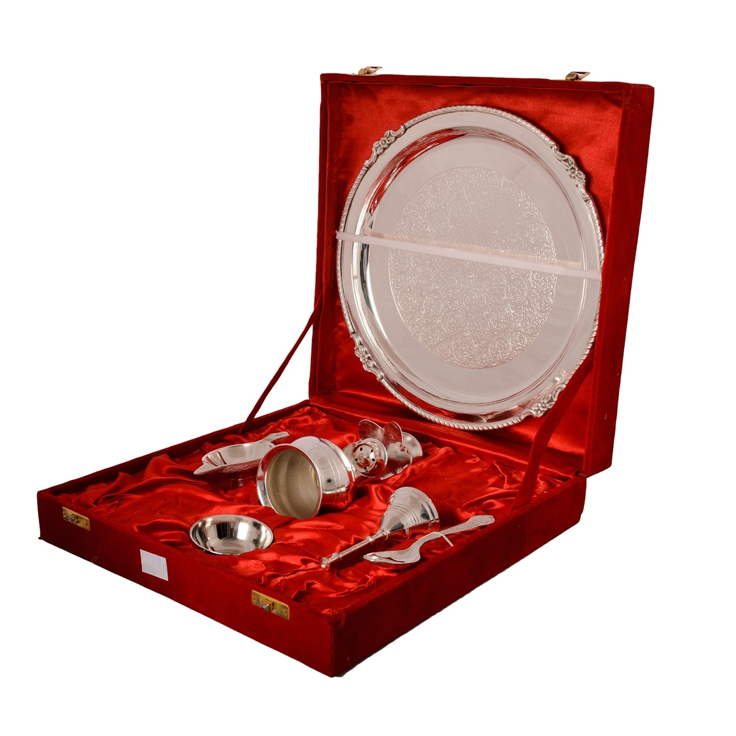 Product Description - German silver products have been a great gifting option for ages now. Our German Silver Elegant Pooja Thali with Velvet Box that comes in silver color is another best gifting option when it comes to various religious events for your friends and family. This German silver glass set comes with a royal velvet box to ensure that the shine doesn't go away. These German silver products are handcrafted using various inherited techniques by the skilled artisans at the dwelling of eCraftIndia. You can find many such German silver products on our online portal.