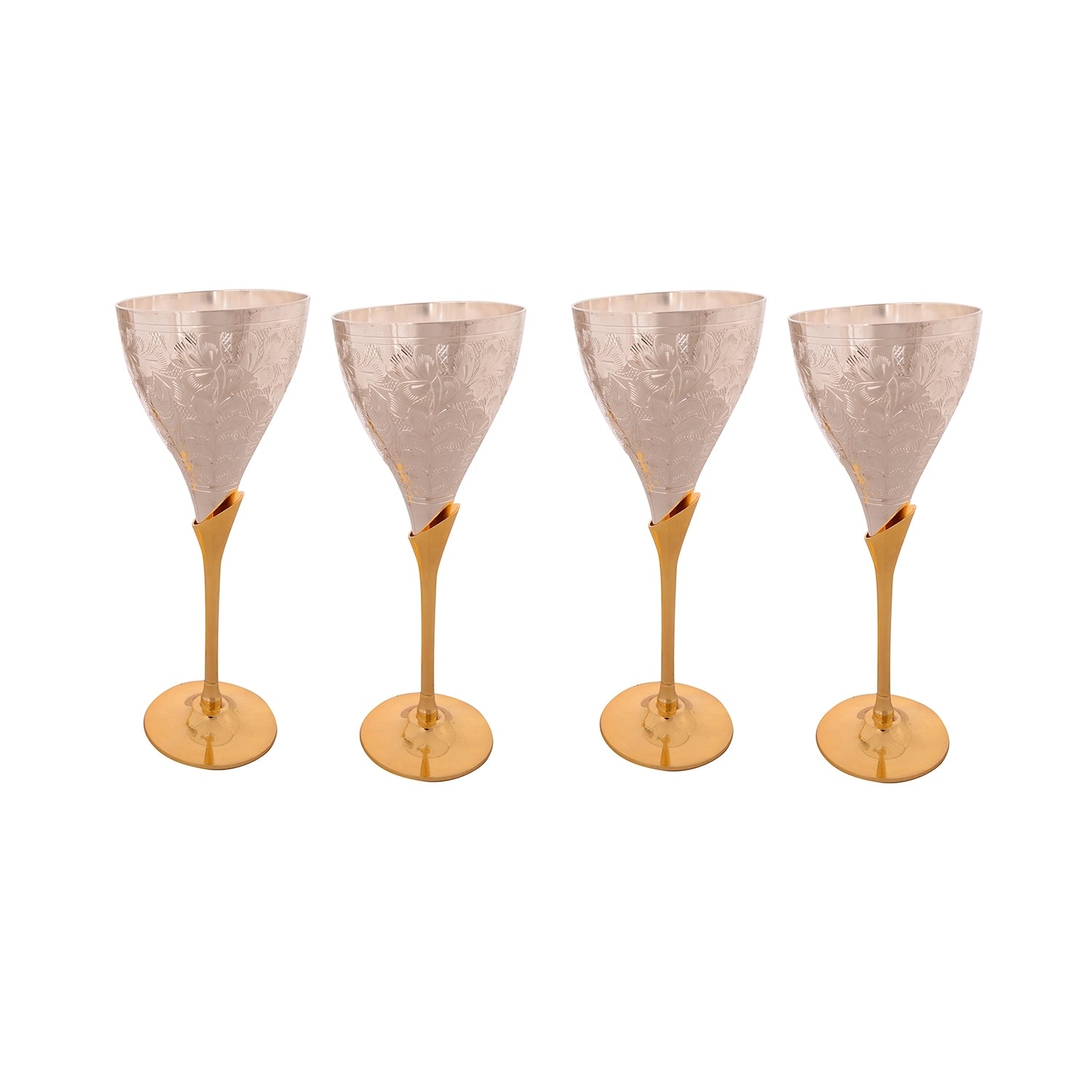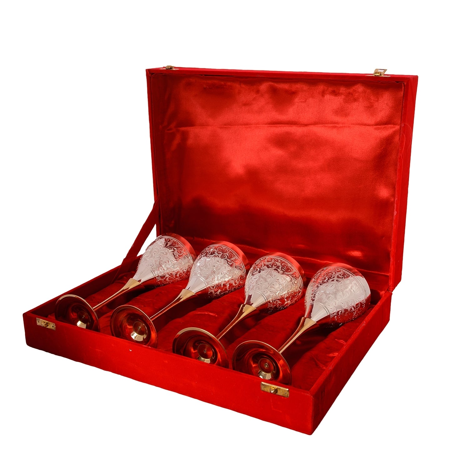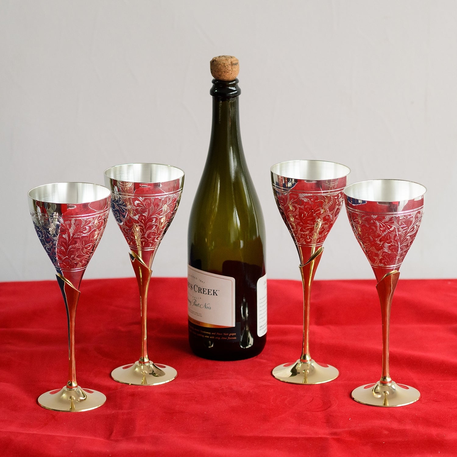 Product Description - German silver products have been a great gifting option for ages now. Our Gold & Silver German Silver Elegant Wine Glass Set of 4 with Velvet Box which comes in gold and silver color is another best gifting option when it comes to various religious events for your friends and family. This German silver glass set comes with a royal velvet box to ensure that the shine doesn't go away. These German silver products are handcrafted using various inherited techniques by skilled artisans at the dwelling of eCraftIndia. You can find many such German silver products on our online portal. The velvet box that these glasses come in helps to preserve the shine of the silver and also makes the best gifting option for family & friends around various celebrations & festivities.