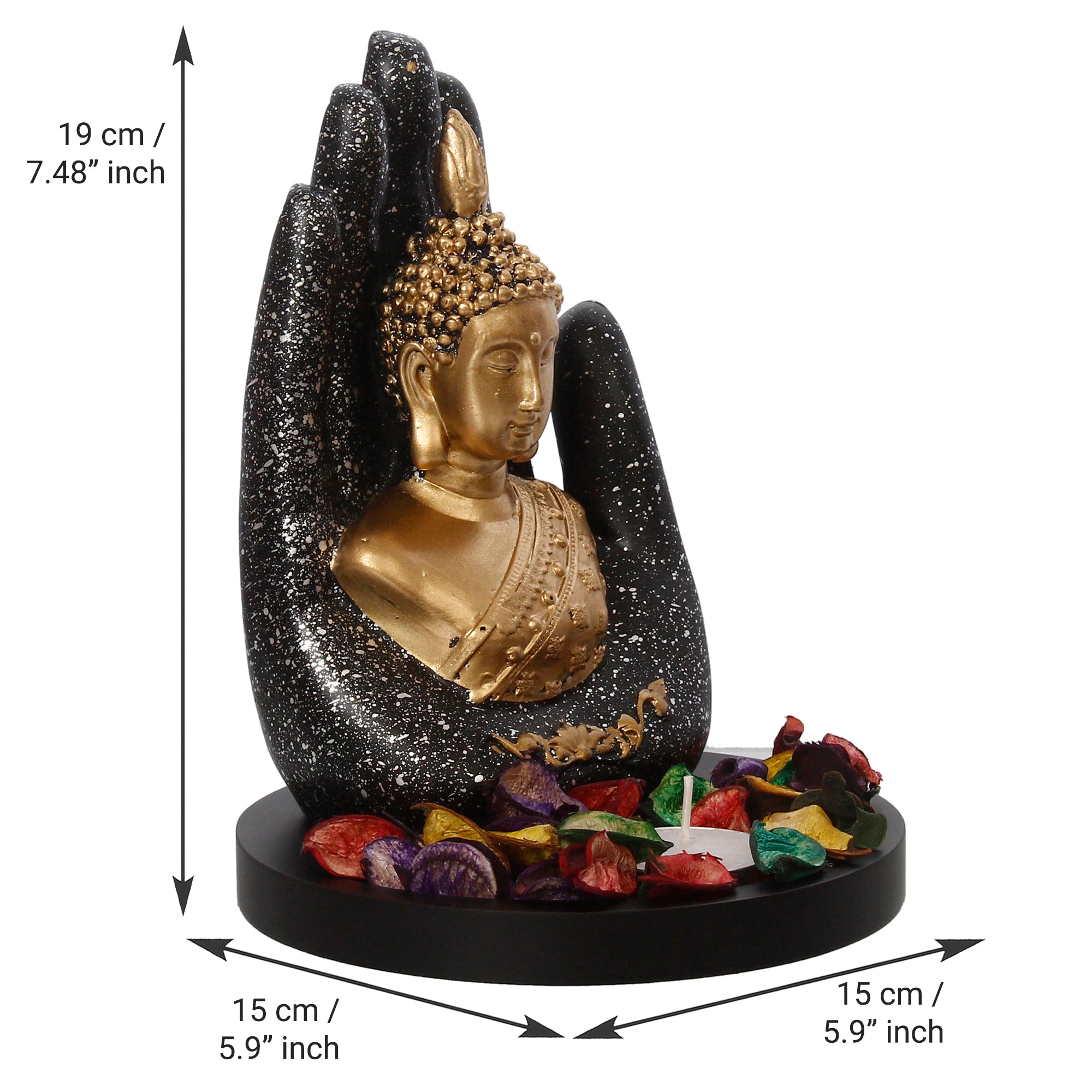 Product Description - Whenever you think of Buddha, an image that comes to your mind is his palm up, blessing anyone who comes across him. Now, imagine having a décor piece where the Buddha himself is seated within a palm on a wooden base! That is what you get when you choose this handcrafted item from the house of eCraftIndia. Lord Buddha is said to bring peace into your homes. This Buddha idol comes with fragranced petals and tealight which again is the best form of spirituality. This idol & figurine is handcrafted in Golden & Black color using various inherited methods by the artisans at eCraftIndia. This also stands out as a great gifting option for your family and friends at religious events. You can bring spirituality into your home by even bringing in the other unique idols & figurines that you will find on our online portal.