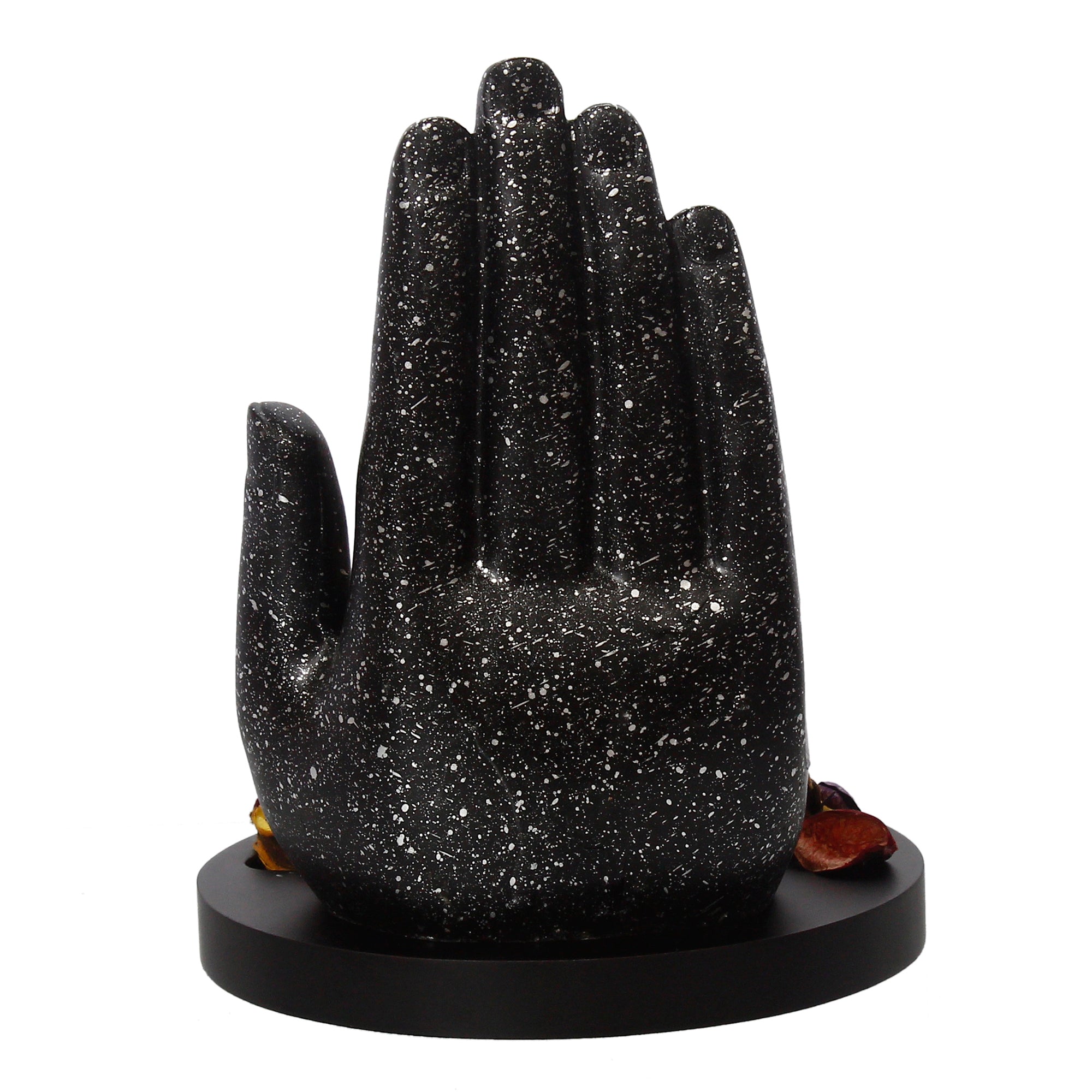 Package Content - One Golden Silver Handcrafted Palm Buddha with Wooden Base, Fragranced Petals and Tealight