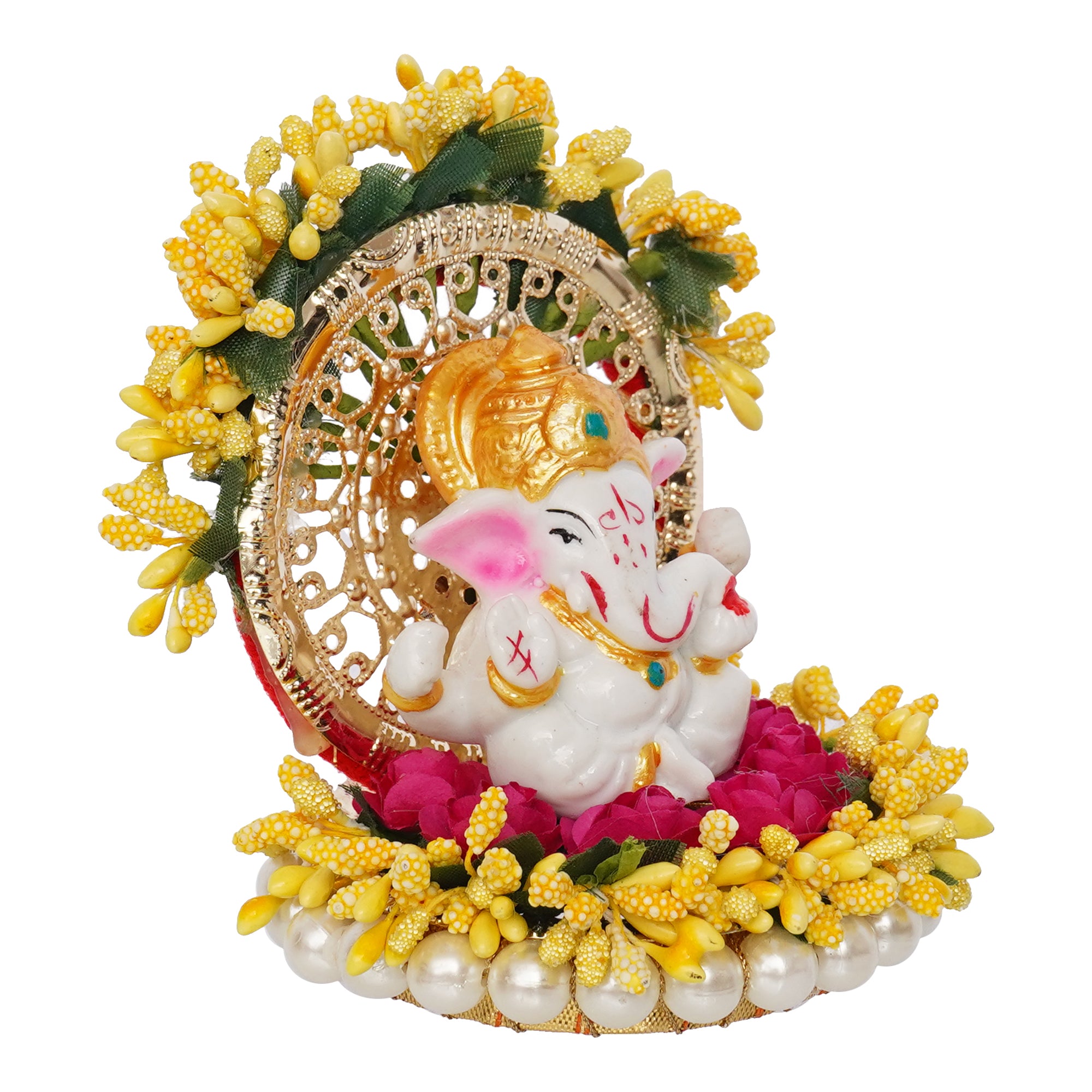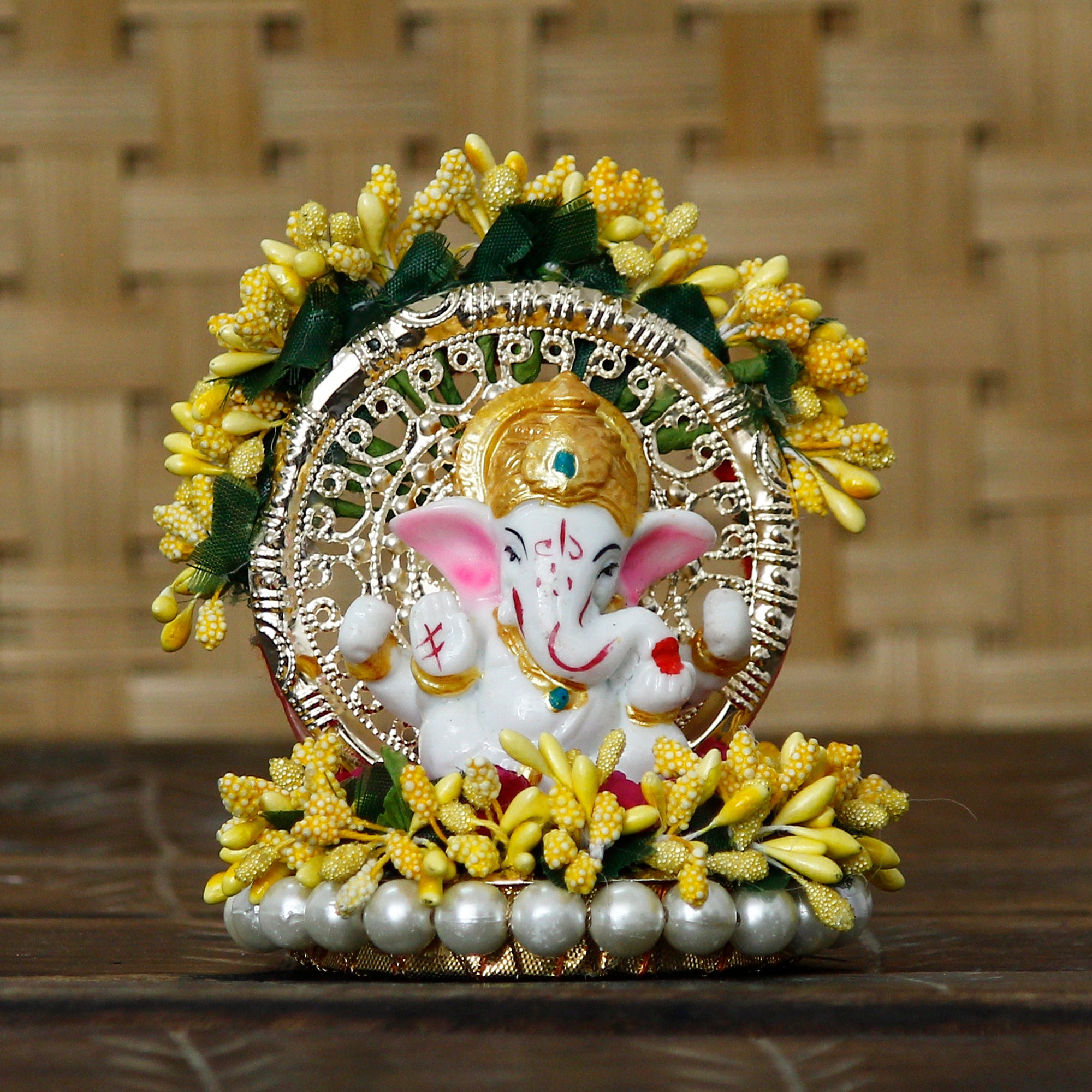 Package Content - One Lord Ganesha Idol on Decorative Handcrafted Yellow Floral Plate for Home and Car