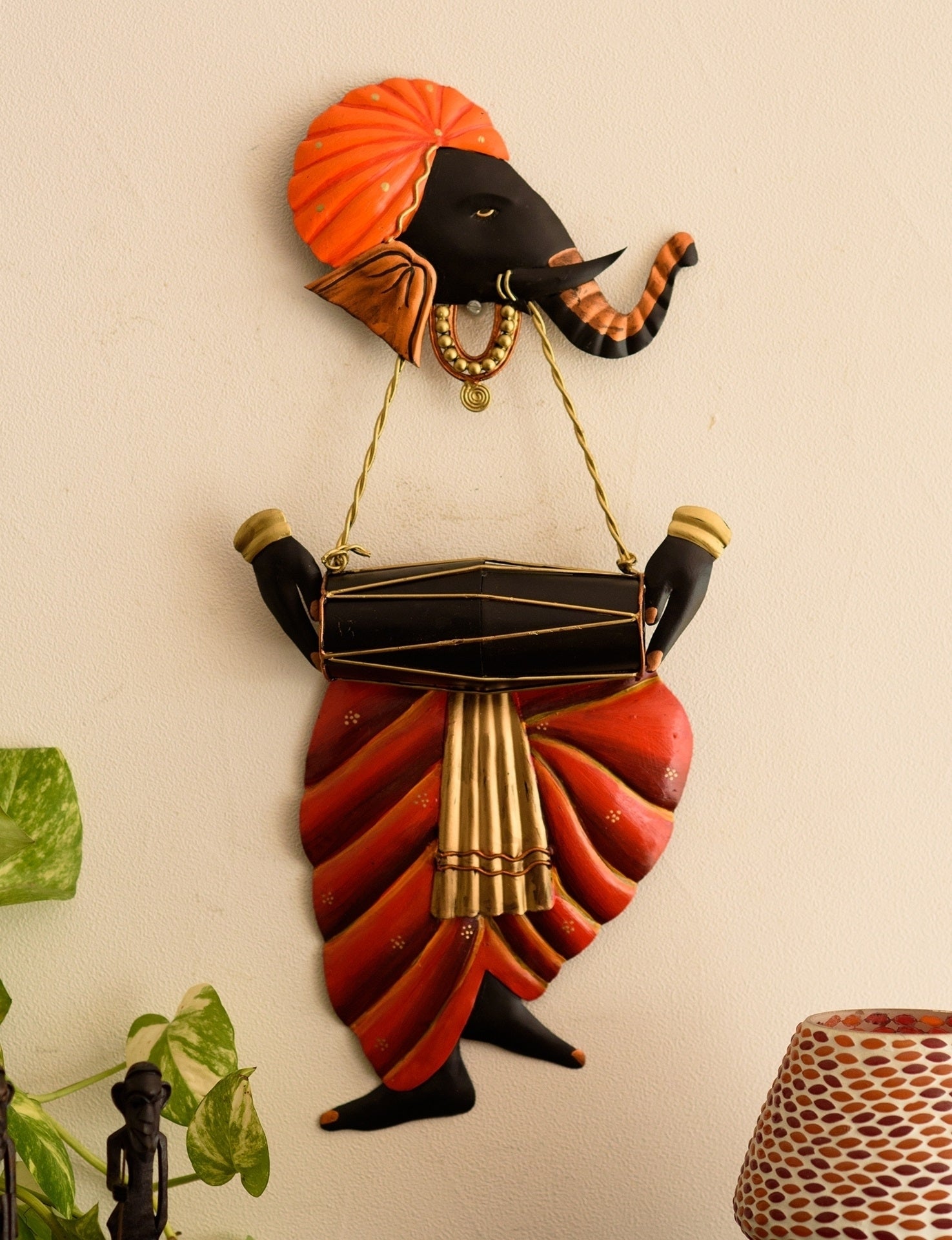Product Description - Lord Ganesha has a close tie with music– it is said that all the rhythms in the universe are channeled through him, which is why there are always images and figurines depicting him with a musical instrument. You would have seen figurines where you see Ganesha playing a tabla or shehnai, but how many times would you have seen him playing the dholak? With our Orange & Black wrought iron Lord Ganesha playing dholak wall hanging, you can see his semi-form playing the dholak with aplomb – although there is no torso to this Ganesha, the detailing is intricate and impressive! Exquisitely designed and intricately crafted, it makes for a perfect gifting option for friends & family. You can find many more wall hangings in different patterns on our online portal in various colors that suit your home or office interior.