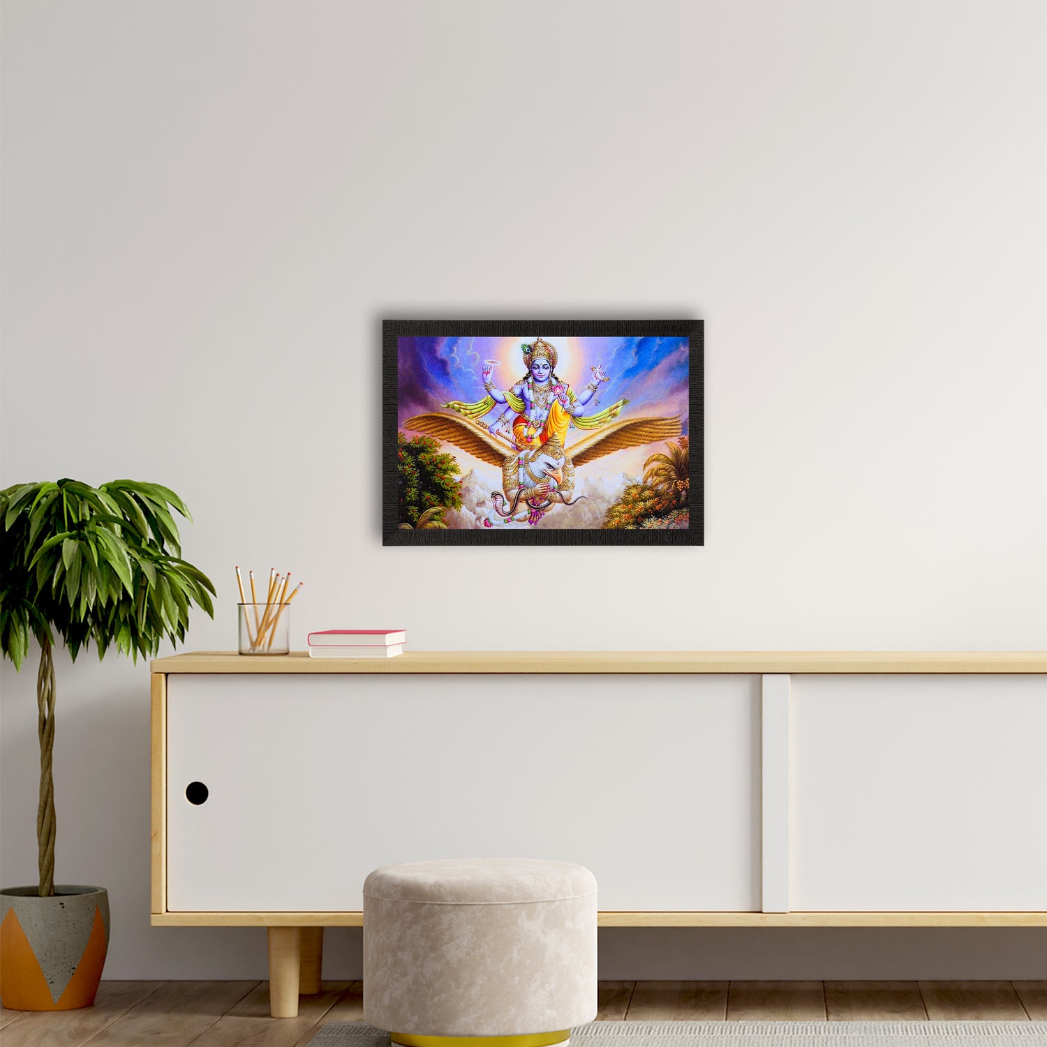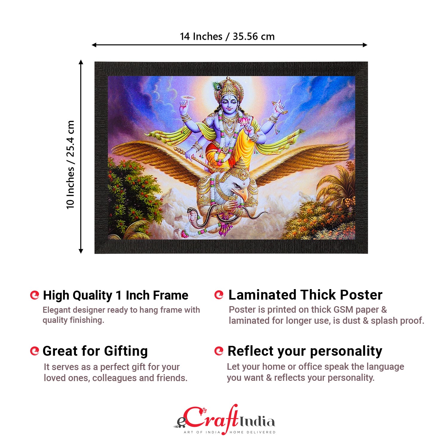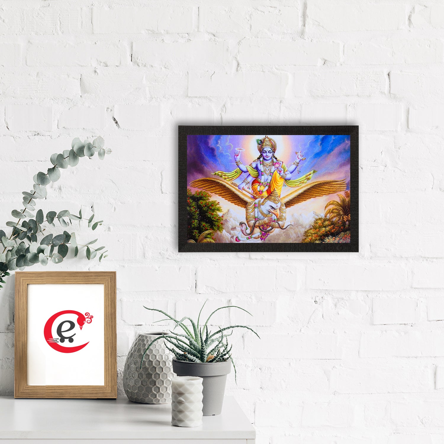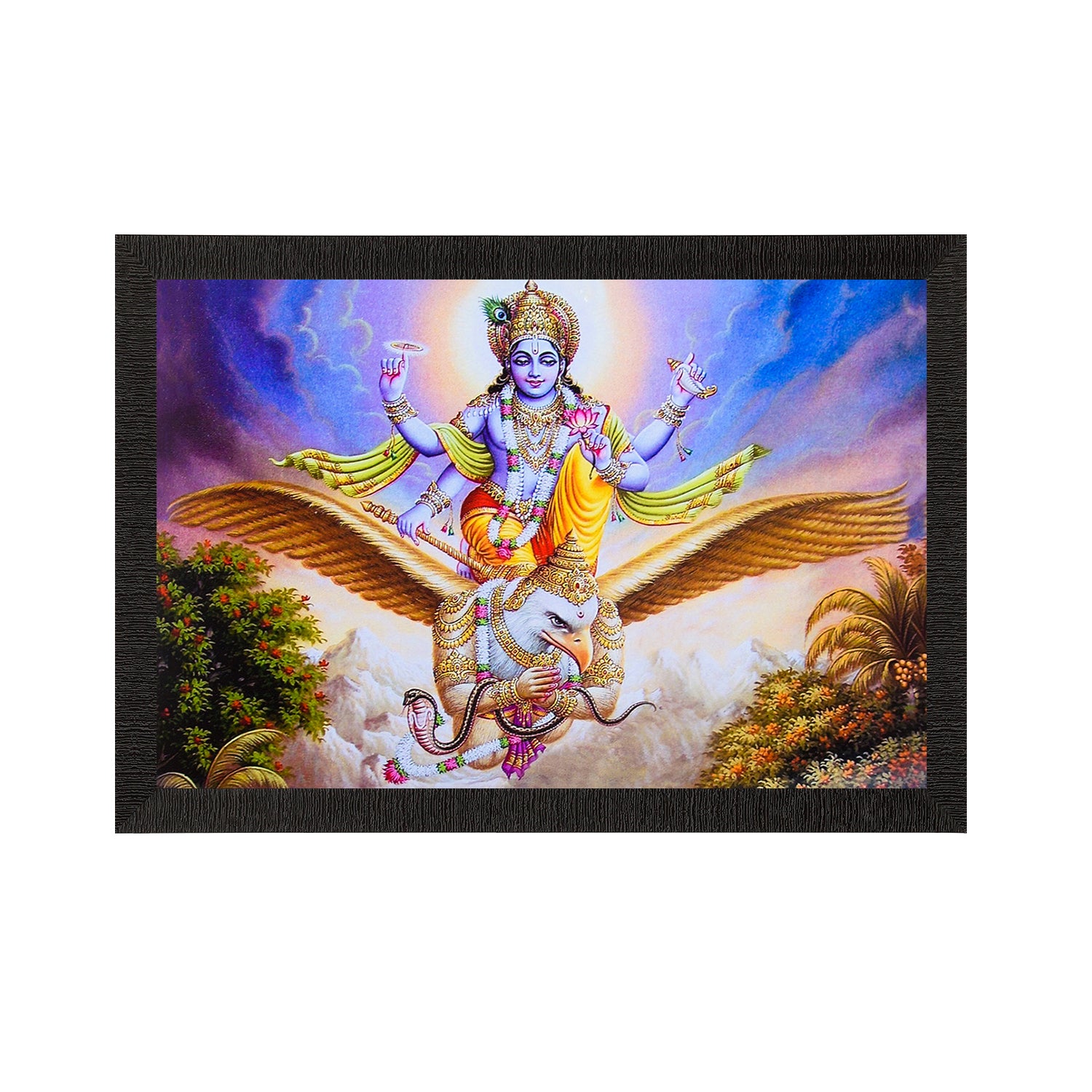 Product Description - Lord Vishnu, the god of preservation is known to appear in various incarnations for humanity. We all know him the most for his divine works in incarnations of Lord Krishna & Lord Ram. Our framed painting is the best depiction of Lord Vishnu on a Garuda. These stand as a great gifting option when it comes to your family & friends when it comes to several auspicious celebrations. Each design reflects the artistic qualities and time one has taken to design this painting. These frames don't include glass so it is very lightweight and wet cloth can be used to clean them. Our Lord Vishnu UV matt textured framed paintings are available in types as well that will help you incorporate the wall religiously.