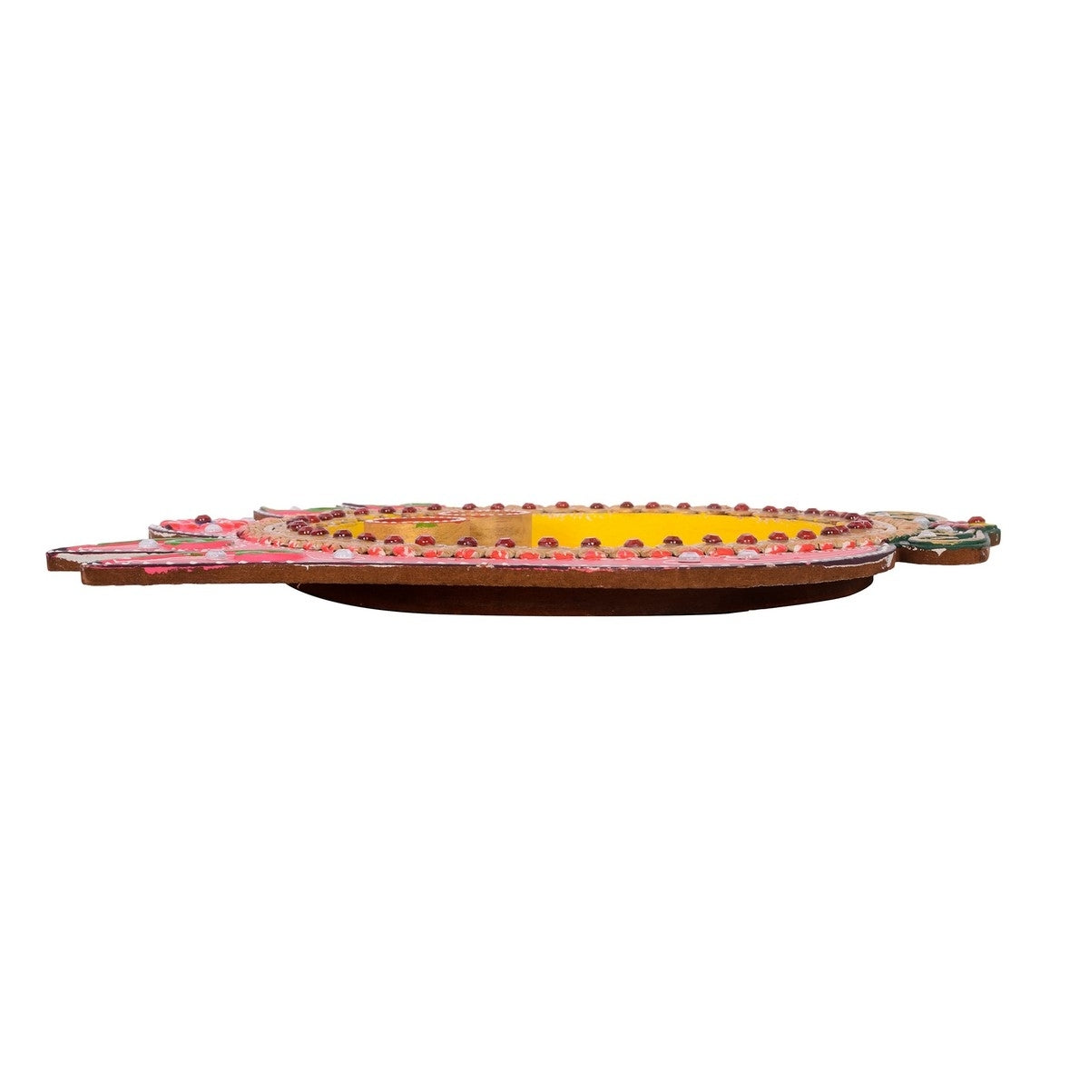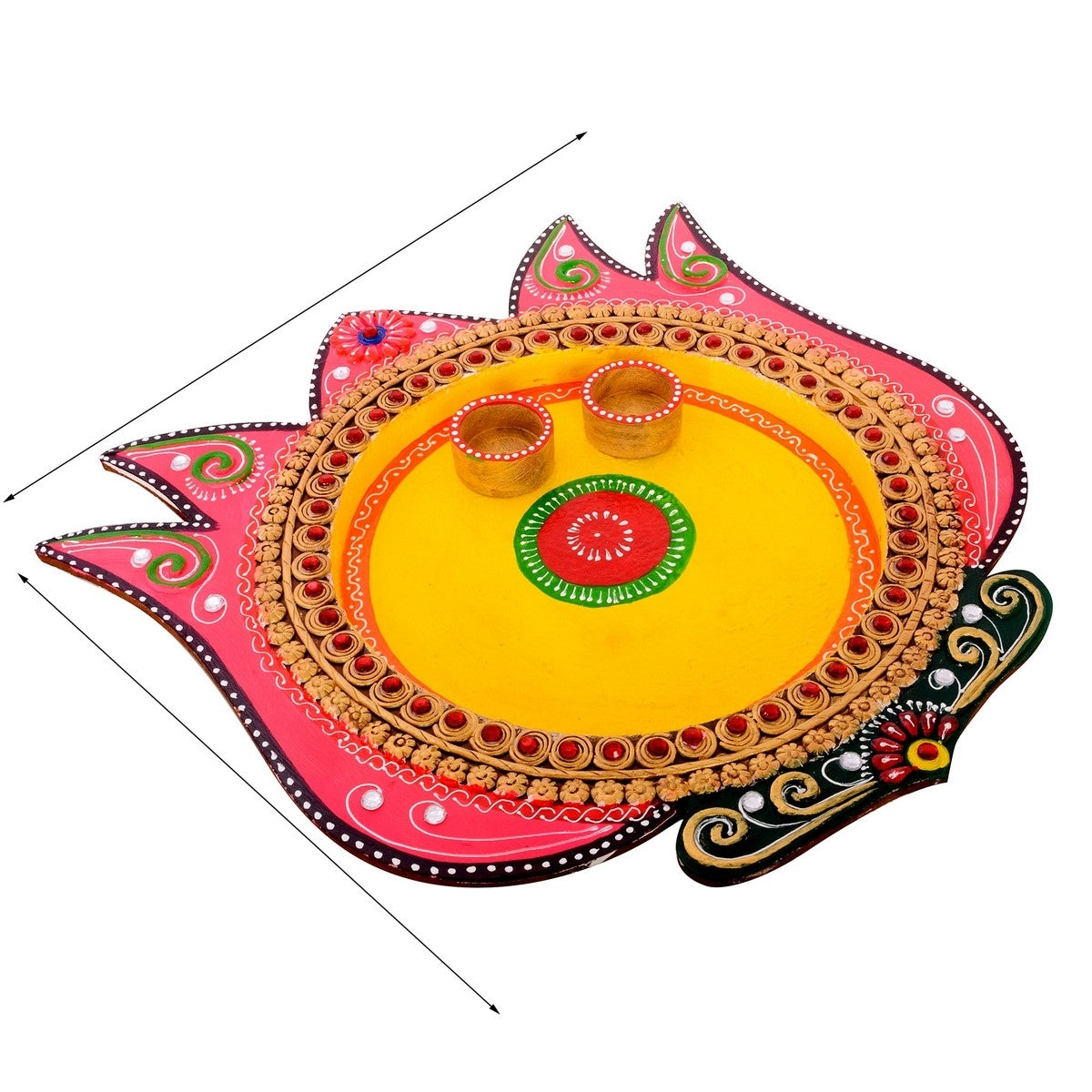 Product Description - offer prayers in style with this majestic Papier-Mache Lotus Design Multiutility Pooja Thali. A embellished border adds to its grace whereas a yellow color in the center makes it auspicious. Complemented with a roli-tikka container it will surely make celebrations memorable. Expert workmanship on this papier-mache pooja plate awards it a dazzling look with Red and Pink enamelwork. For its incredible appeal, it serves as an ideal gift for your loved ones, family and friends. This Pooja Thali is diligently handcrafted by skilled artisans from the house of eCraftIndia using various traditional techniques.