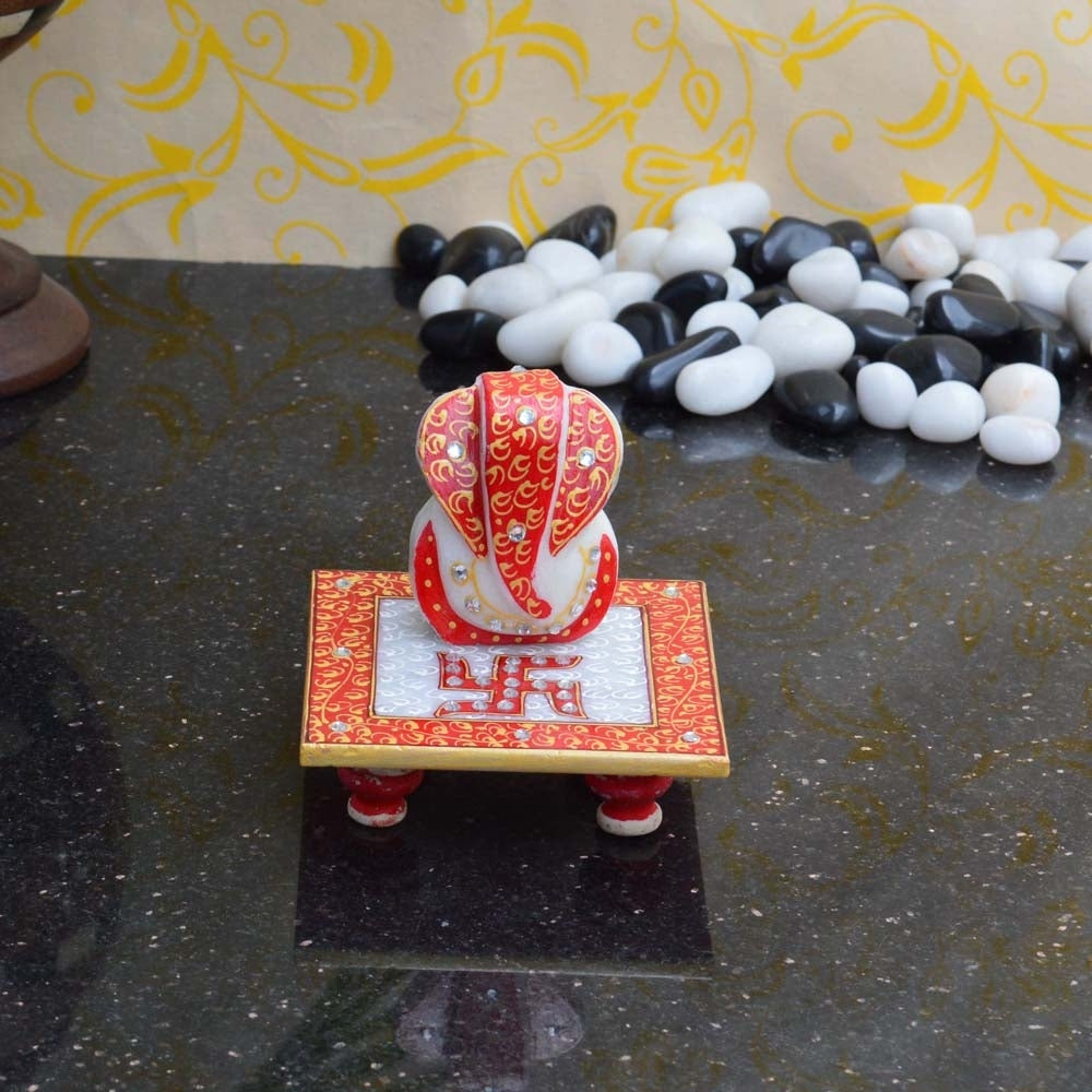 Product Description - Bring Riddhi Siddhi to your home with the blessings of the Lord Ganesha statue on Marble Chowki. Lord Ganesha is seated on a marble chowki having Swastik that is beautifully enameled with Red color and studded with white crystals. Ganesha chowki surely brings blessing and happiness to your home. For its incredible appeal, it serves as a great gift for your loved ones. This Marble Chowki is diligently handcrafted by skilled artisans from the house of eCraftIndia using various traditional techniques.