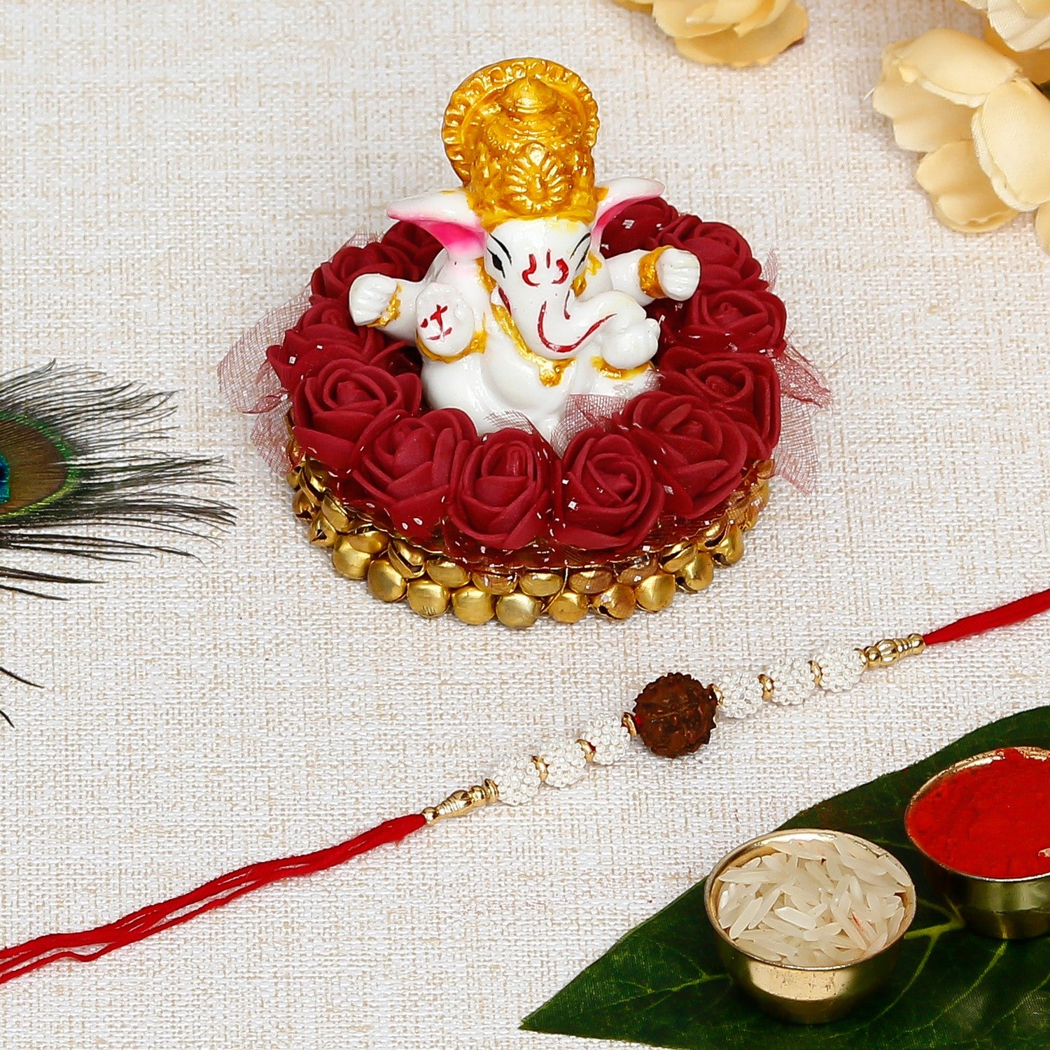 Rudraksh Rakhi with Lord Ganesha Idol on Decorative Plate for Car & Home and Roli Chawal Pack - eCraftIndia Online