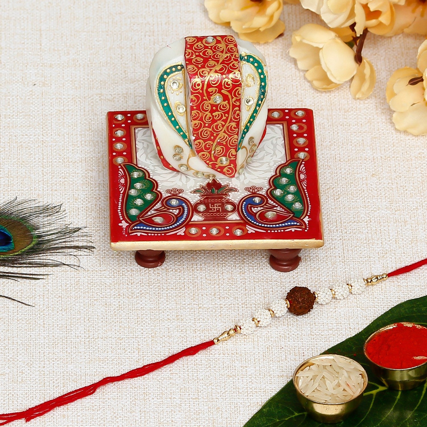 Rudraksh Rakhi with Lord Ganesha on Marble Chowki and Roli Chawal Pack - eCraftIndia Online