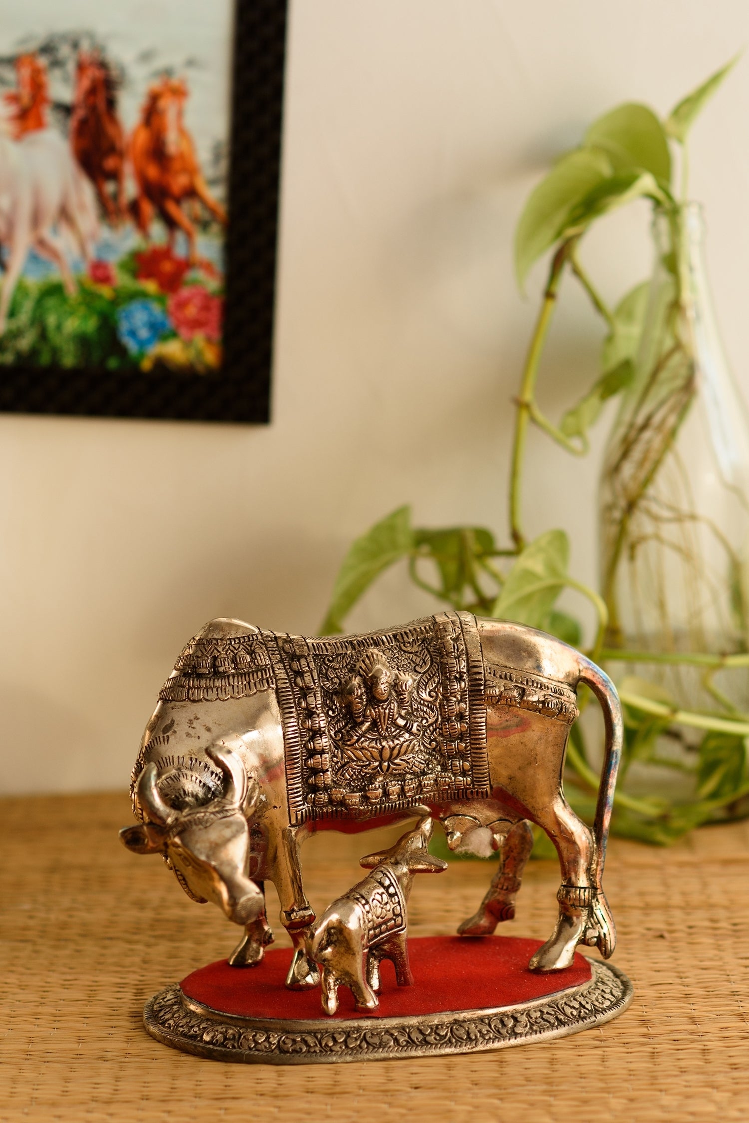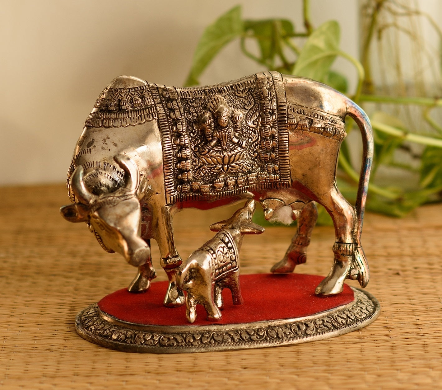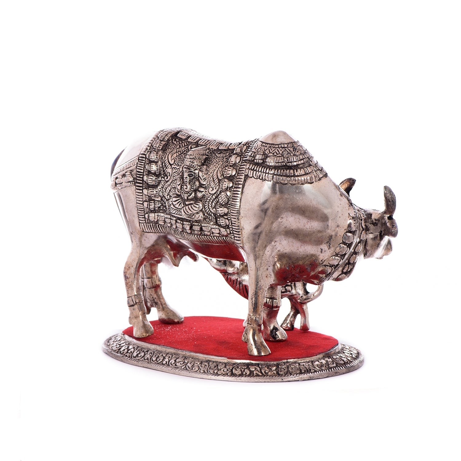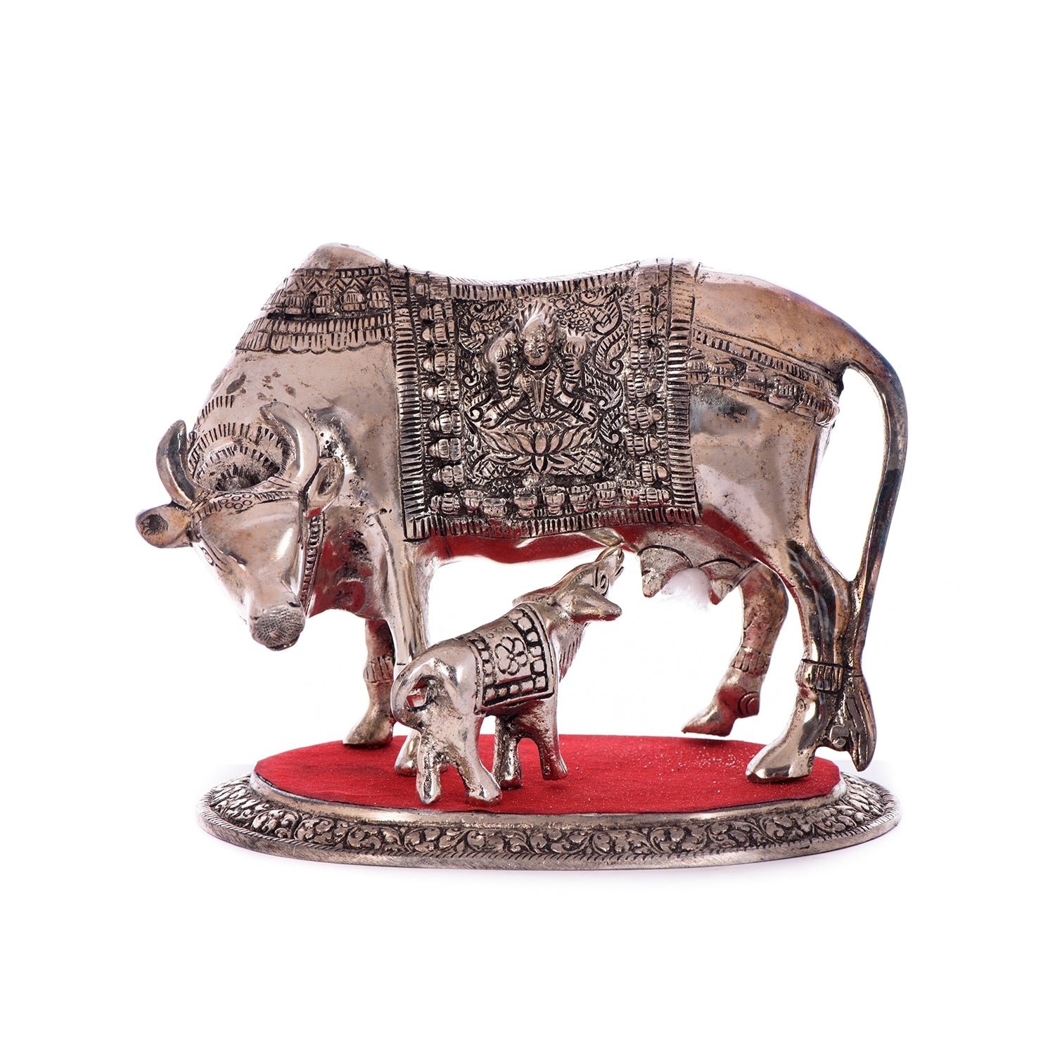Product Description - Beautiful creation of kamdhenu cow & calf is a perfect symbol of the undying aura of the holy saint that encompasses numerous devotees round the globe. This statue aptly conveys the emotions of people who consider cow (gomatha) as a motherly figure. Kamdhenu cow & calf statues are widely used for decoration purposes in homes and offices. It serves as a great gift, especially around religious celebrations and festivities. This white metal handicraft has been made by skilled artisans from the house of eCraftIndia using various traditional techniques.