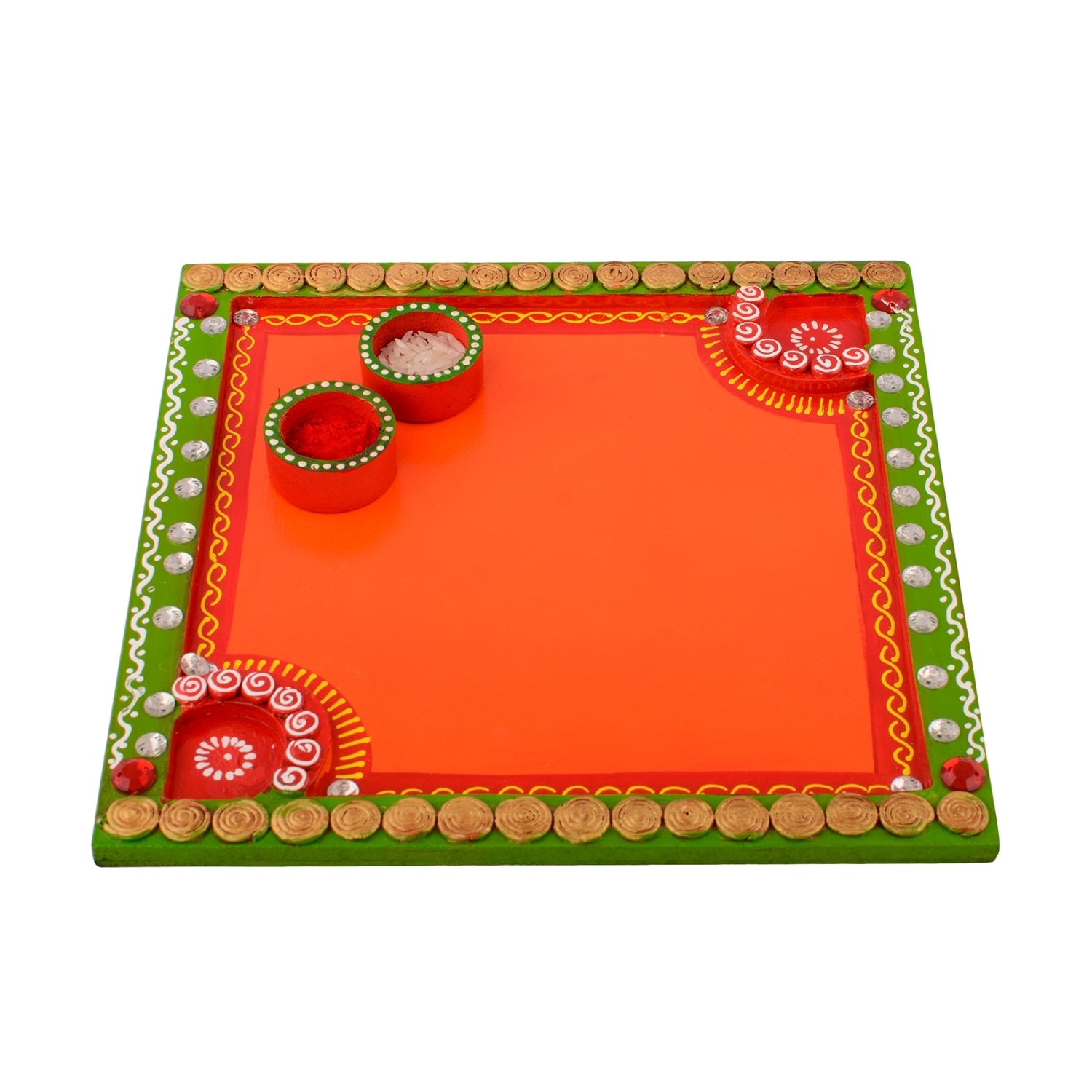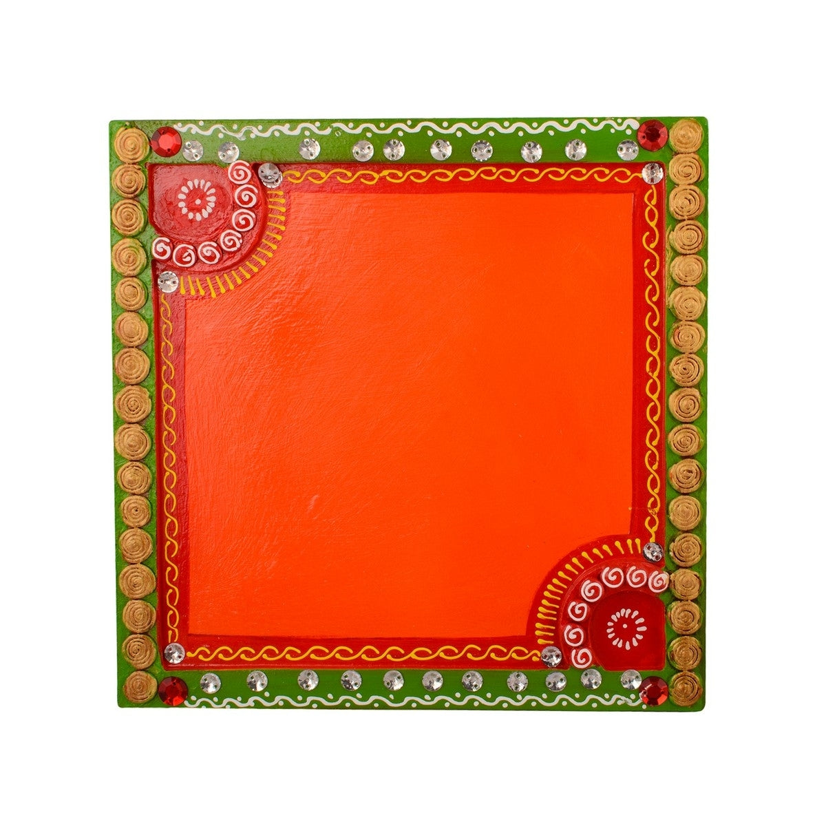 Package Content - One Piece Wooden Papier Mache Embossed Square Shape Pooja Thali