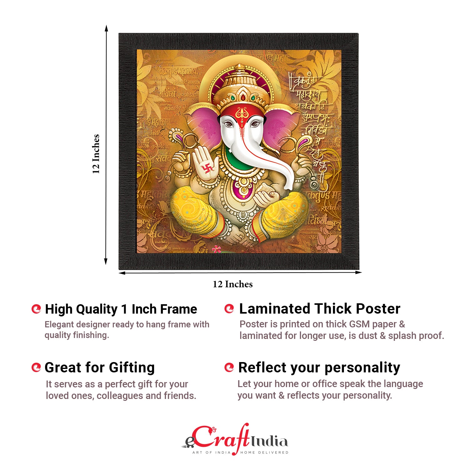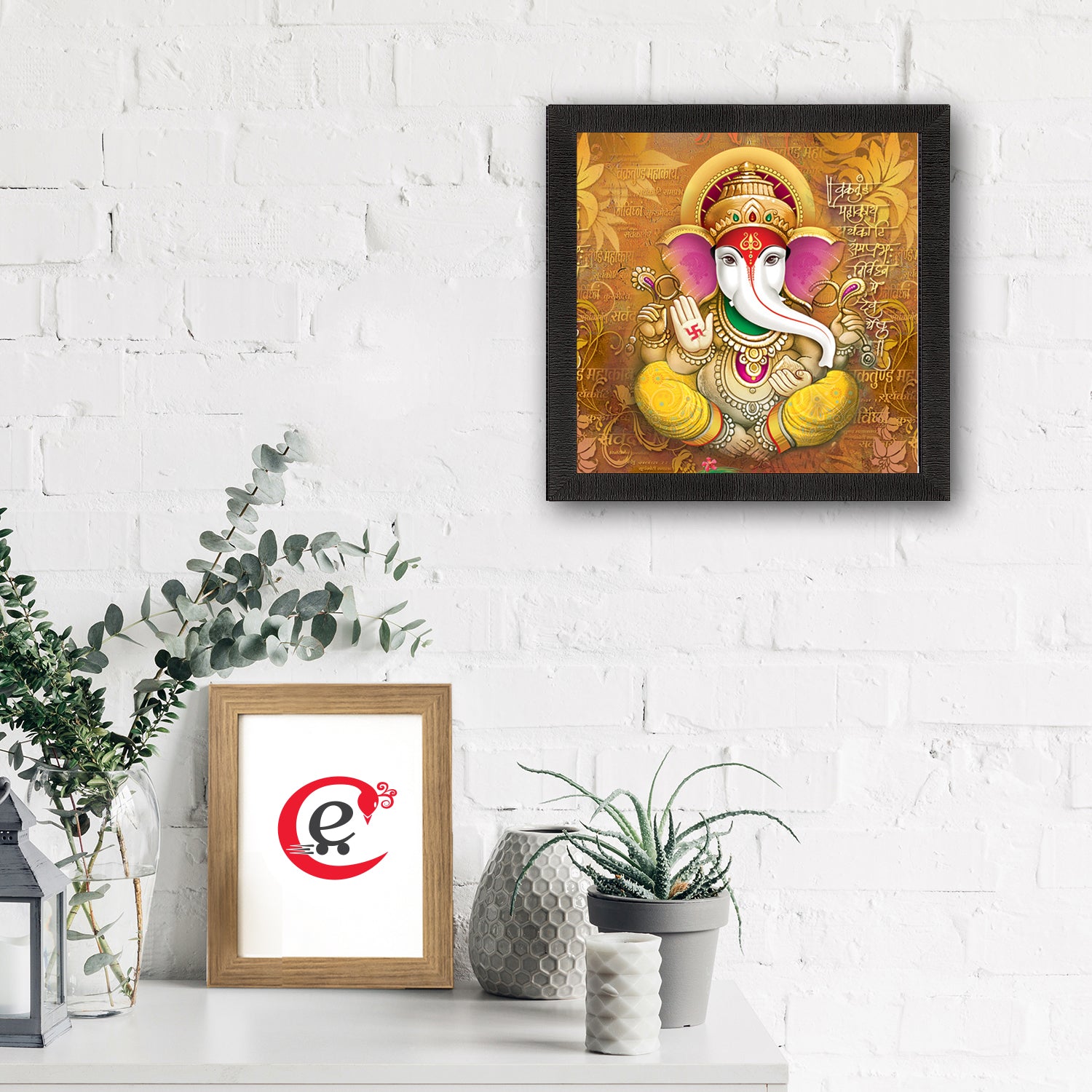 Product Description - Lord Ganesha is said to be the remover of obstacles and is revered at every new beginning, isn't he? It is also believed that gifting Lord Ganesha to your loved one on an auspicious celebration brings good luck. Be it Lord Ganesha's idol or wall art, paintings further hold and play a significant role. All our paintings come in various hues as well as different add-ons such as Om, Swastik, etc that are surely going to enhance your wall decoration. Our Ganesha framed paintings are available in sets as well that will help you incorporate the entire wall space creatively. Each design reflects the artistic qualities and time one has taken to design this painting. These frames don't include glass so it is very lightweight and wet cloth can be used to clean them. Exquisitely printed and framed, it is also a perfect gifting option for your colleagues, loved ones, and family members.