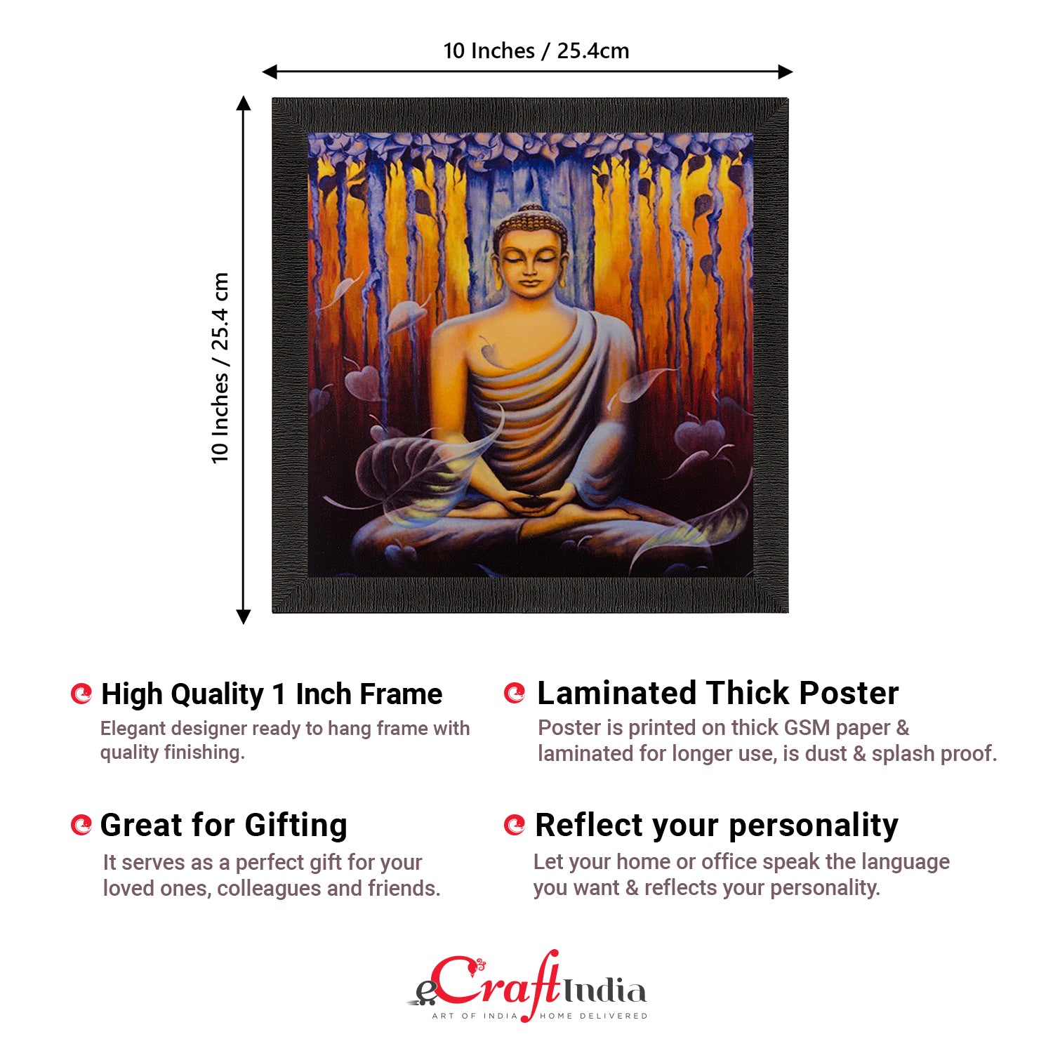 Product Description - Lord Buddha is said to hold a culture of well-being when it comes to art forms. The symbol of peace & good vibes, Lord Buddha brings good luck as well into our space be it in the form of a painting or an idol. Therefore, these framed wall paintings make a great gift option for your family & friends, especially for the ones that believe in harmony & calmness. Our Lord Buddha UV matt textured framed paintings are available in sets as well that will help you incorporate the entire wall space creatively. Each design reflects the artistic qualities and time one has taken to design this painting. These frames don't include glass so it is very lightweight and wet cloth can be used to clean them. Exquisitely printed and framed, it is also a perfect gifting option for your colleagues, loved ones, and family members.