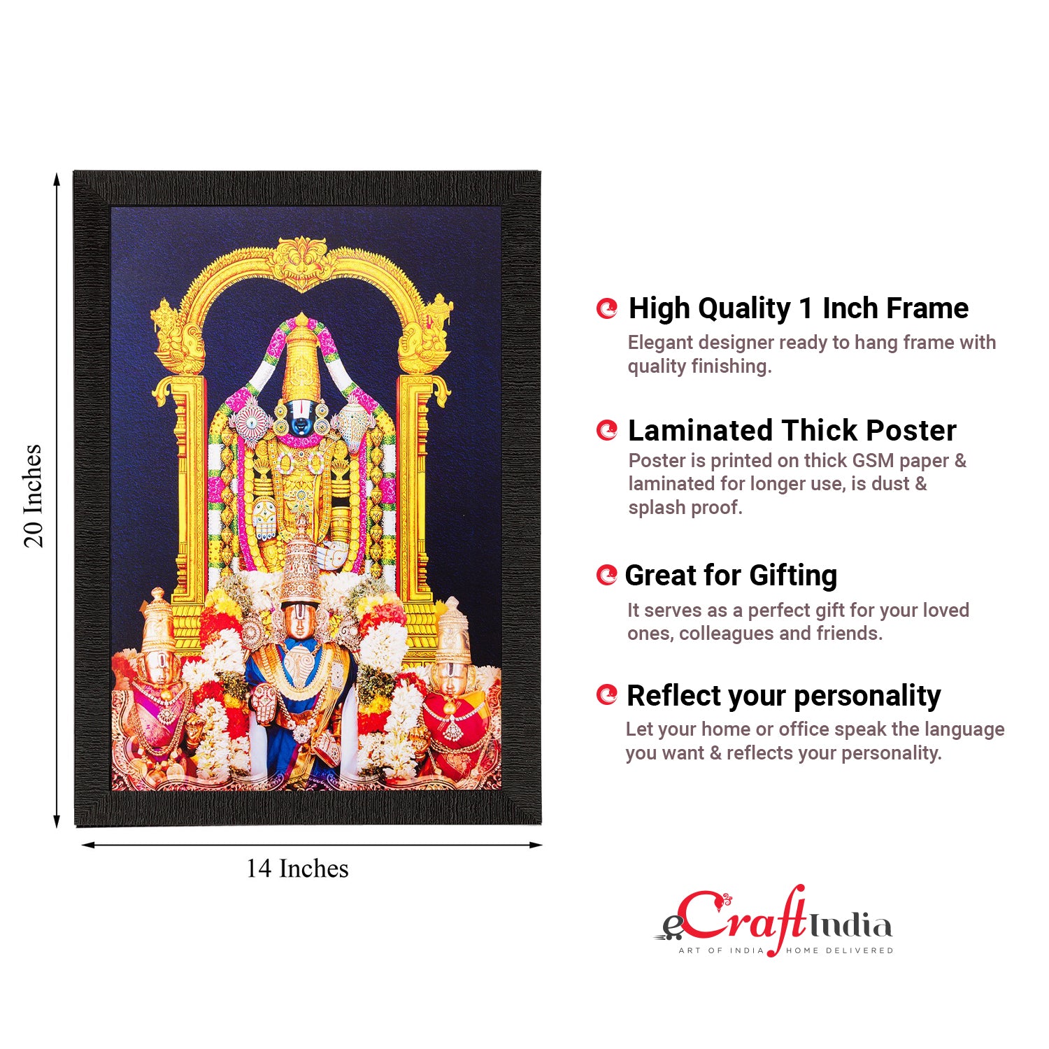 Product Description - Lord Balaji also understood as Venkateswara is known as the childhood form of Lord Hanuman and is revered in several parts of India. Our framed paintings depict spirituality creatively. These stand as a great gifting option when it comes to your family & friends when it comes to several auspicious celebrations. Our Lord Balaji UV matt textured framed paintings are available in types as well that will help you incorporate the wall religiously. Each design reflects the artistic qualities and time one has taken to design this painting. These frames don't include glass so it is very lightweight and wet cloth can be used to clean them.