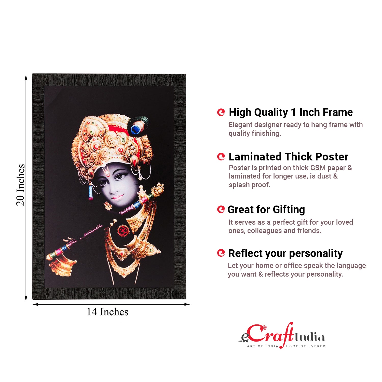 Product Description - Lord Krishna worshipped as the 8th avatar of Lord Vishnu is also known as the supreme god. He is known to bring compassion, tenderness & love into our spaces. Hence, these framed wall paintings make a great gift option for your family & friends, or your most desired couple that is bound to bring in love & good vibes always. Our Lord Krishna UV matt textured framed paintings are available in sets as well that will help you incorporate the entire wall space creatively. Each design reflects the artistic qualities and time one has taken to design this painting. These frames don't include glass so it is very lightweight and wet cloth can be used to clean them. Exquisitely printed and framed, it is also a perfect gifting option for your colleagues, loved ones, and family members.