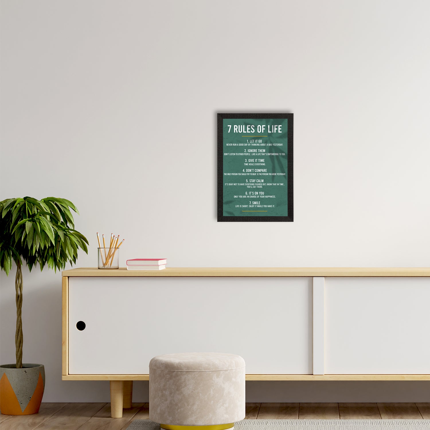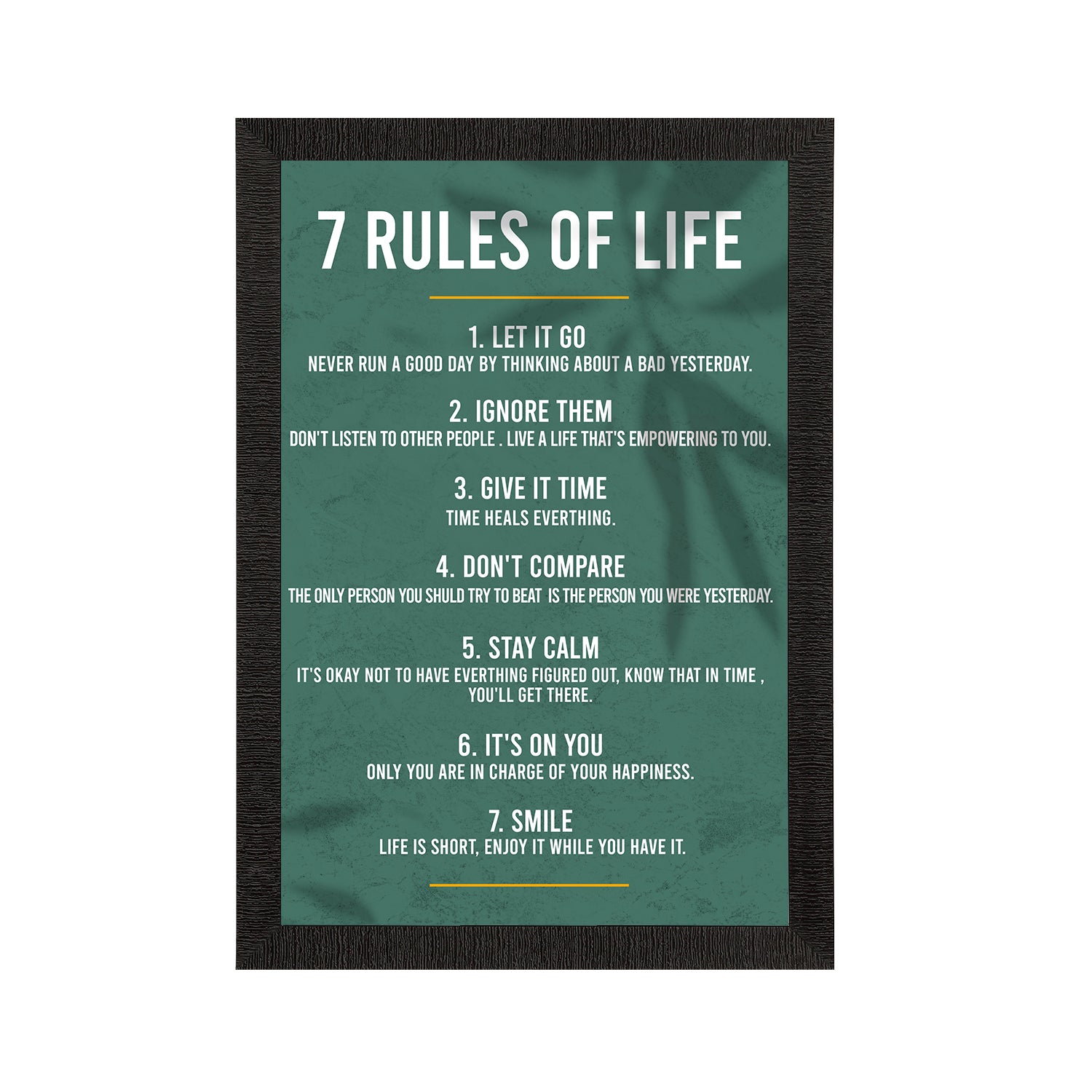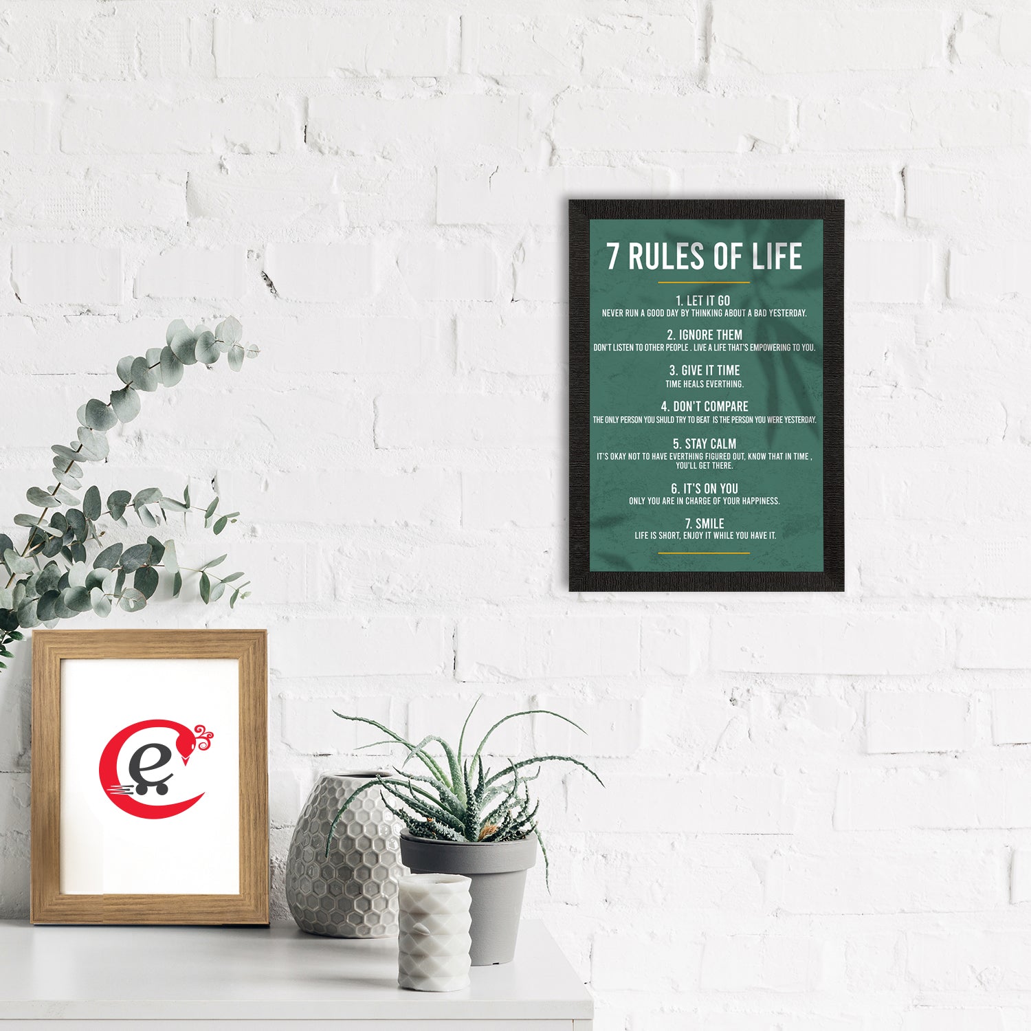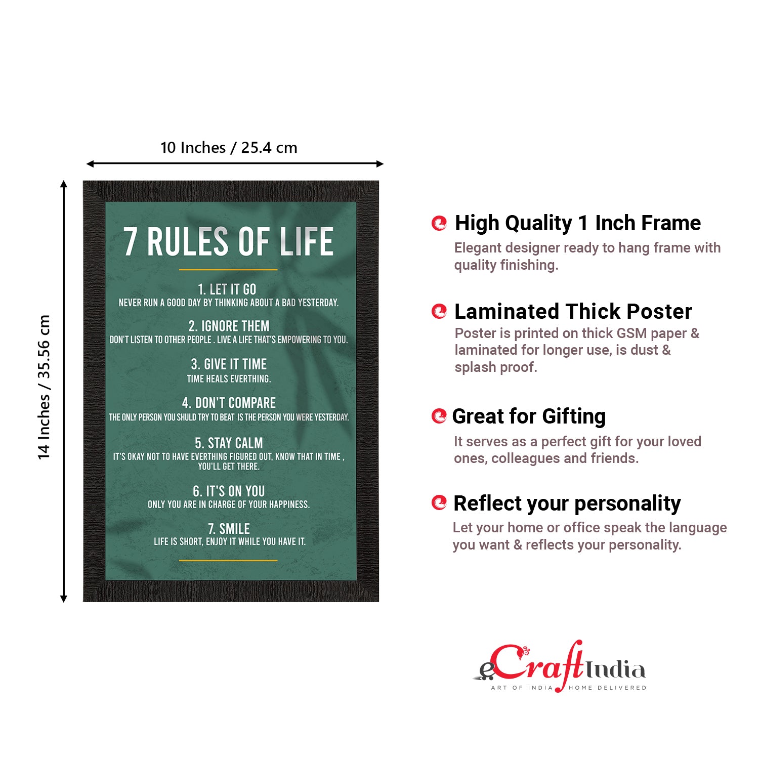 Product Description - Decorate your home & office walls with this artistic design eCraftIndia "7 Rules of Life " Motivational Quote Satin Matt Texture UV Art Painting. Each design reflects the artistic qualities and time one has taken to design this painting. Exquisitely printed and framed, it is also a perfect gifting option for your colleagues, loved ones and family members. These frames don't include glass so it is very light weight and wet cloth can be used to clean it.