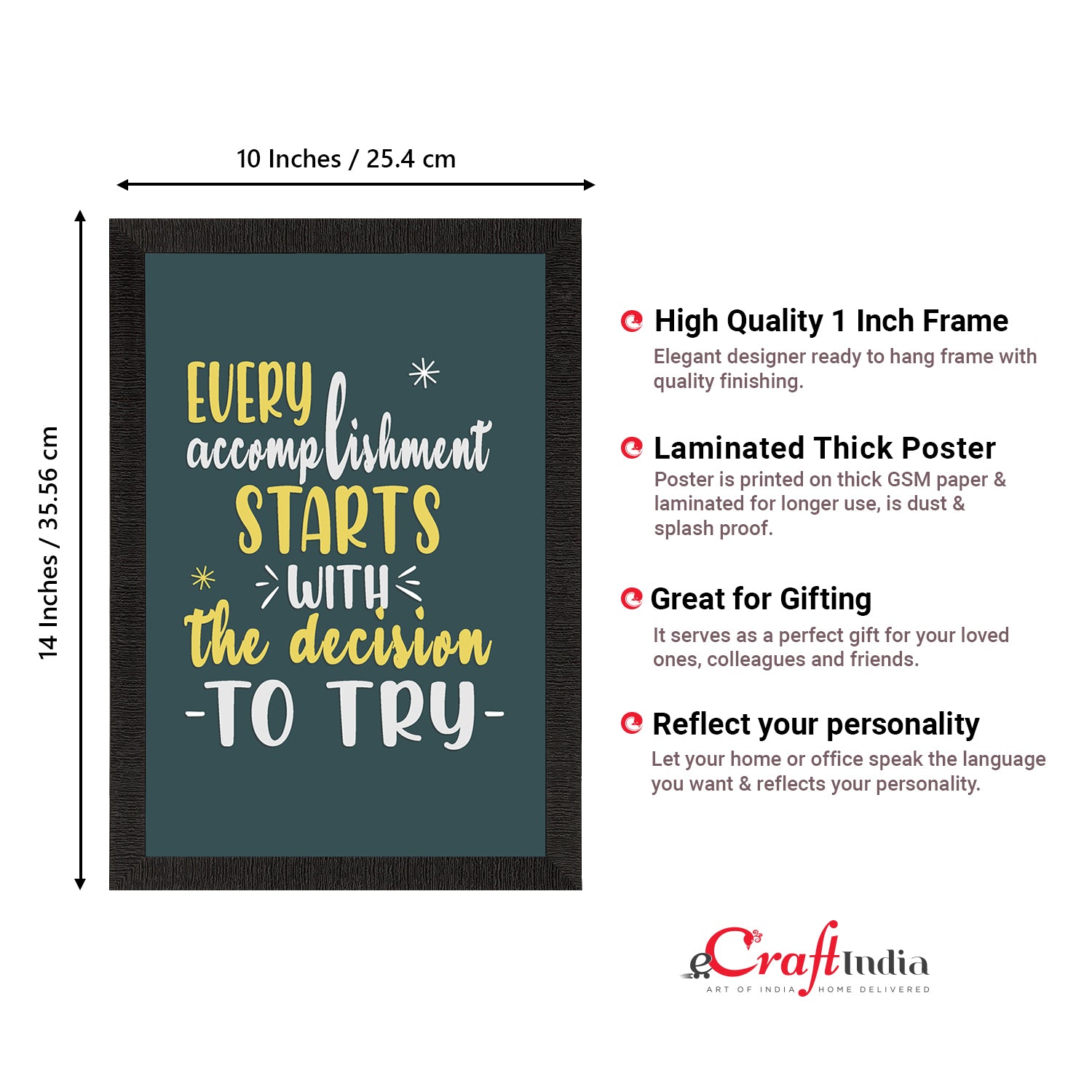 Product Description - Decorate your home & office walls with eCraftIndia "Every Accomplishment" Motivational Quote Satin Matt Texture UV Art Painting. Each design reflects the artistic qualities and time one has taken to design these posters. Exquisitely printed on high quality paper, it is also a perfect gifting option. These posters comes with high quality Glue Drops. Glue Drops are non-messy double-sided adhesives. These can be used for sticking posters on wall if required.
