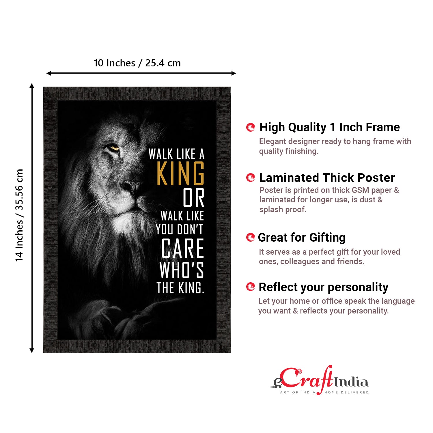 Product Description - Decorate your home & office walls with eCraftIndia "Walk like a King" Motivational Quote Satin Matt Texture UV Art Painting. Each design reflects the artistic qualities and time one has taken to design these posters. Exquisitely printed on high quality paper, it is also a perfect gifting option. These posters comes with high quality Glue Drops. Glue Drops are non-messy double-sided adhesives. These can be used for sticking posters on wall if required.