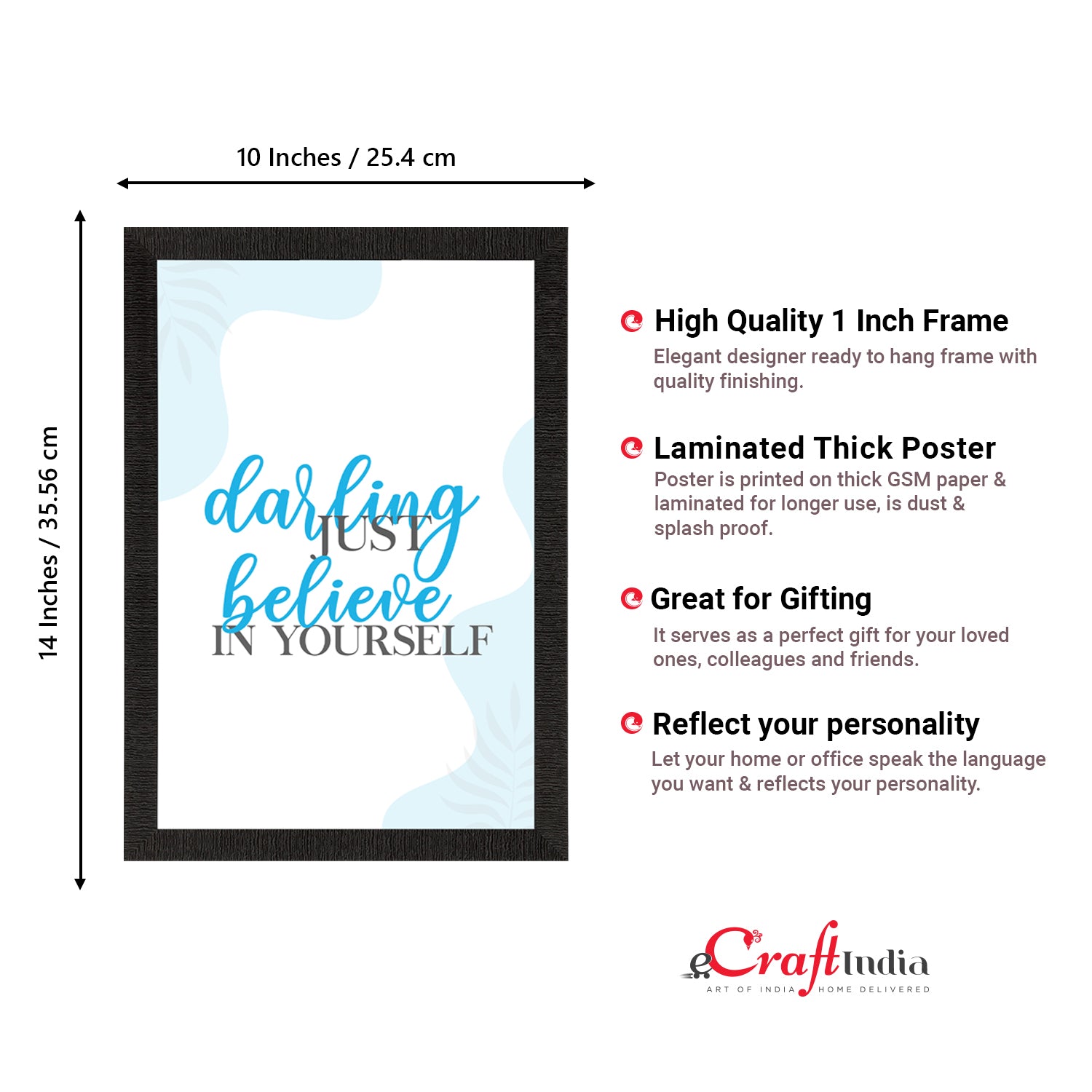 Product Description - Decorate your home & office walls with eCraftIndia "Darling just believe in Motivational Quote Satin Matt Texture UV Art Painting. Each design reflects the artistic qualities and time one has taken to design these posters. Exquisitely printed on high quality paper, it is also a perfect gifting option. These posters comes with high quality Glue Drops. Glue Drops are non-messy double-sided adhesives. These can be used for sticking posters on wall if required.