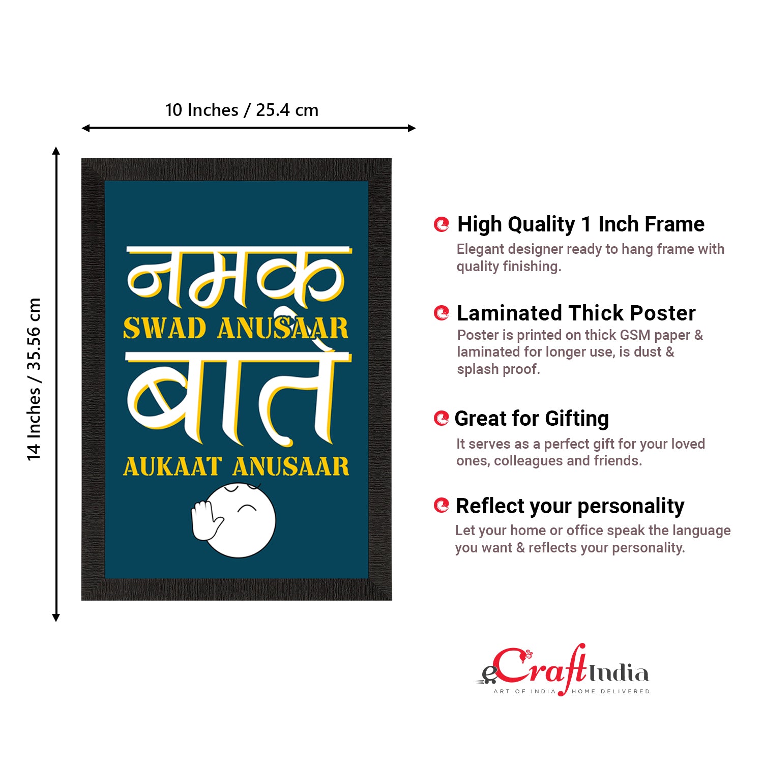 Product Description - Decorate your home & office walls with eCraftIndia "Namak Sawad Anusaar Batein Aukaat Anusaar" Quirky Quote Satin Matt Texture UV Art Painting. Each design reflects the artistic qualities and time one has taken to design these posters. Exquisitely printed on high quality paper, it is also a perfect gifting option. These posters comes with high quality Glue Drops. Glue Drops are non-messy double-sided adhesives. These can be used for sticking posters on wall if required.