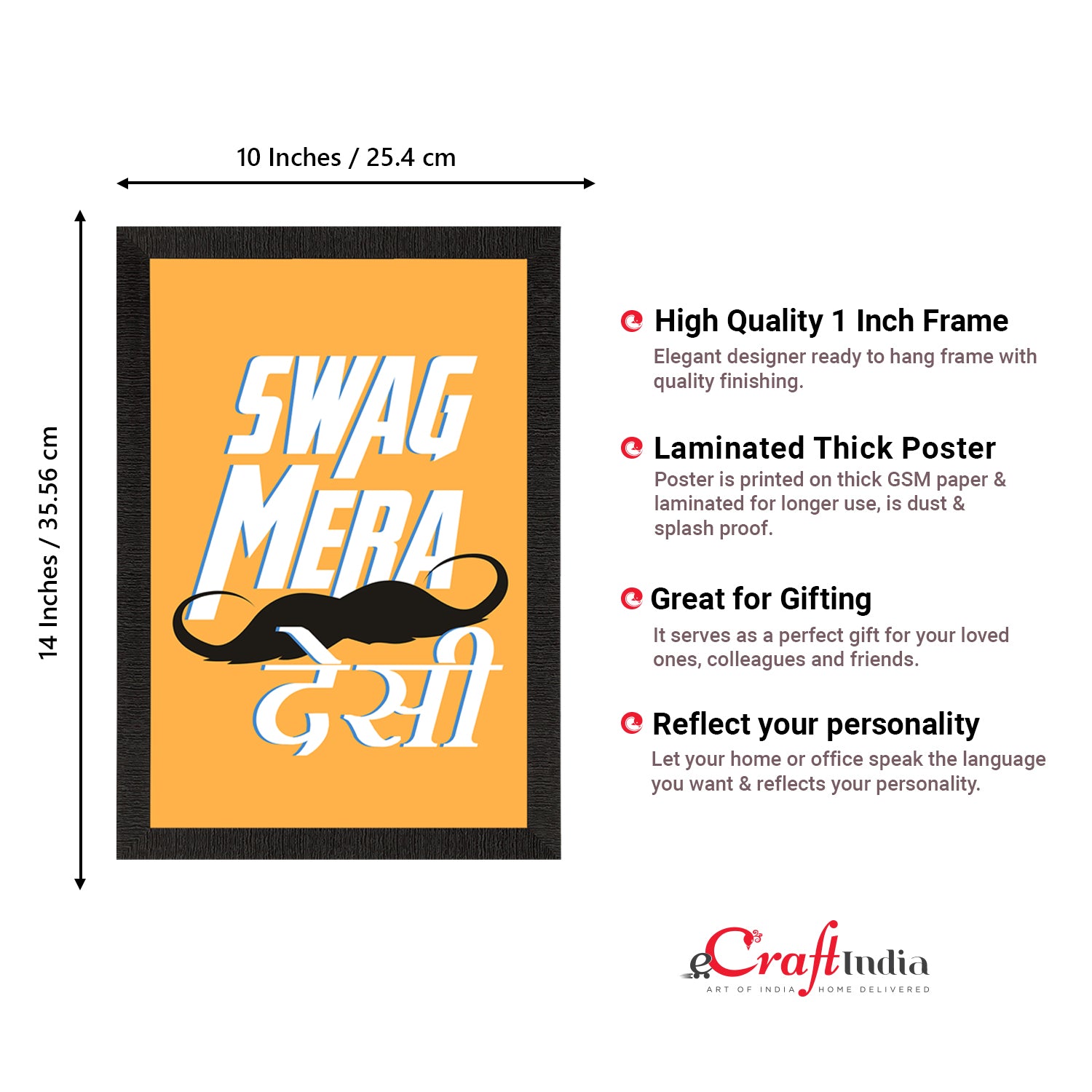 Product Description - Decorate your home & office walls with eCraftIndia "Swag Mera Desi" Quirky Quote Satin Matt Texture UV Art Painting. Each design reflects the artistic qualities and time one has taken to design these posters. Exquisitely printed on high quality paper, it is also a perfect gifting option. These posters comes with high quality Glue Drops. Glue Drops are non-messy double-sided adhesives. These can be used for sticking posters on wall if required.