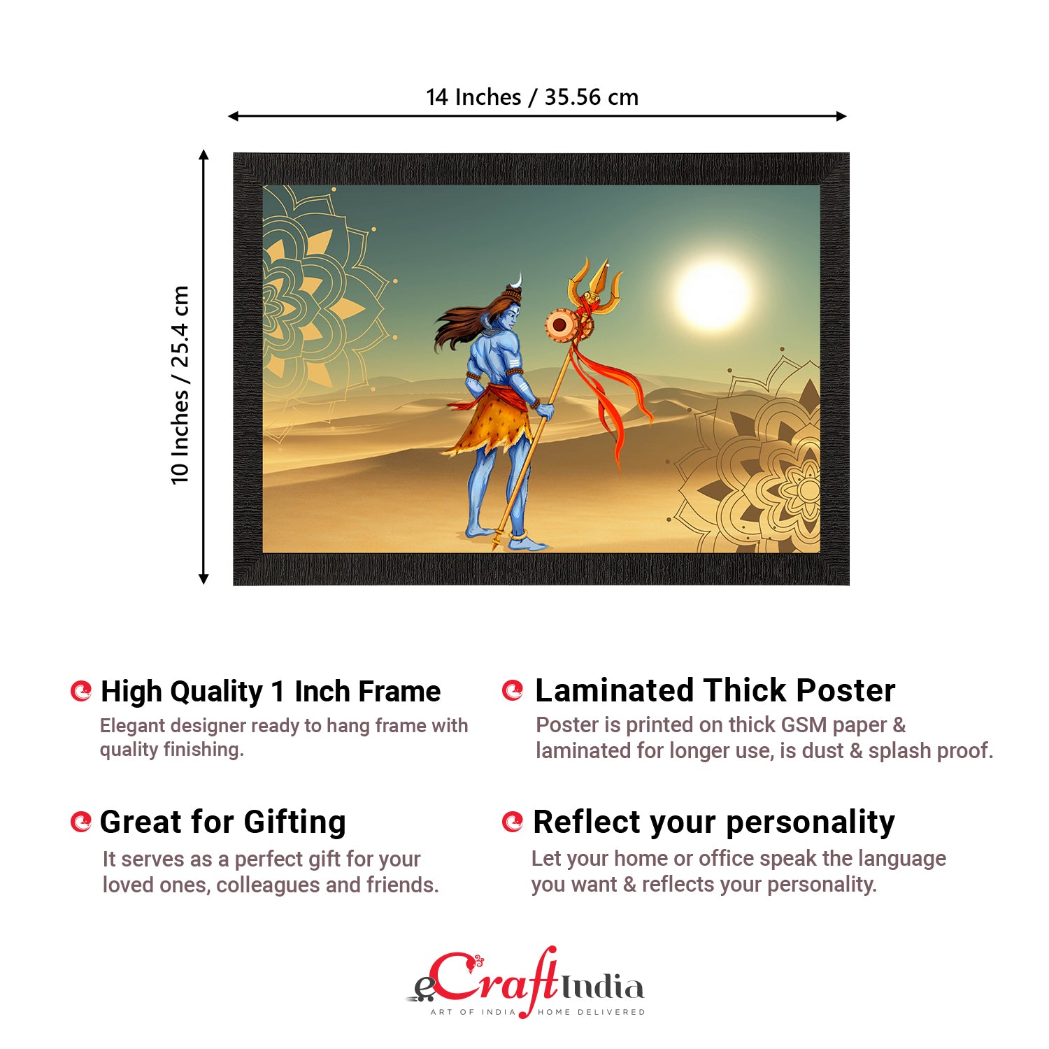 Product Description - Decorate your home & office walls with these artistic design Satin Matt Texture Framed UV Art Painting from eCraftIndia. Each design reflects the artistic qualities and time one has taken to design this painting. Exquisitely printed and framed, it is also a perfect gifting option for your colleagues, loved ones and family members. These frames don't include glass so it is very light weight and wet cloth can be used to clean it.