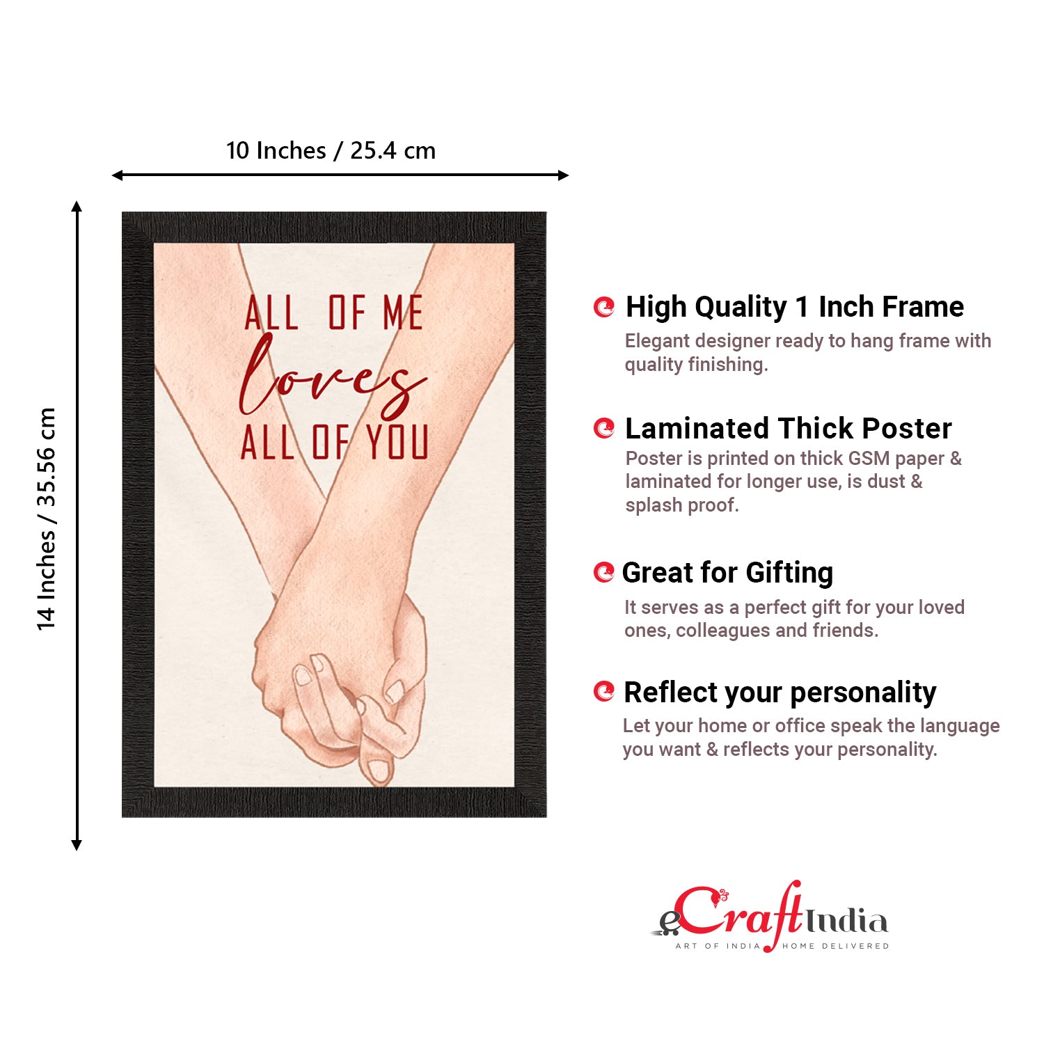 Product Description - Decorate your home & office walls with eCraftIndia "All of me Loves All of you" Love Theme Satin Matt Texture UV Art Painting. Each design reflects the artistic qualities and time one has taken to design these posters. Exquisitely printed on high quality paper, it is also a perfect gifting option. These posters comes with high quality Glue Drops. Glue Drops are non-messy double-sided adhesives. These can be used for sticking posters on wall if required.
