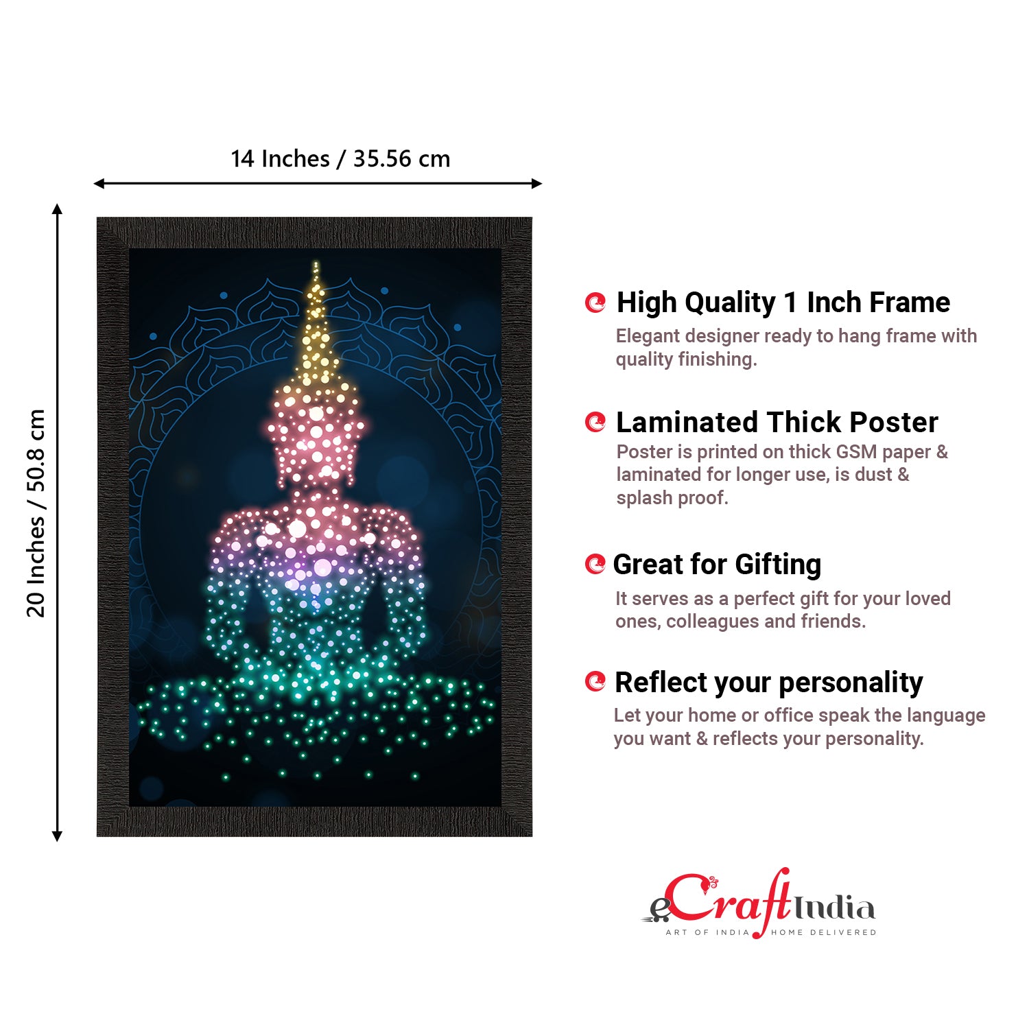 Product Description - Decorate your home & office walls with these artistic design Satin Matt Texture Framed UV Art Painting from eCraftIndia. Each design reflects the artistic qualities and time one has taken to design this painting. Exquisitely printed and framed, it is also a perfect gifting option for your colleagues, loved ones and family members. These frames don't include glass so it is very light weight and wet cloth can be used to clean it.