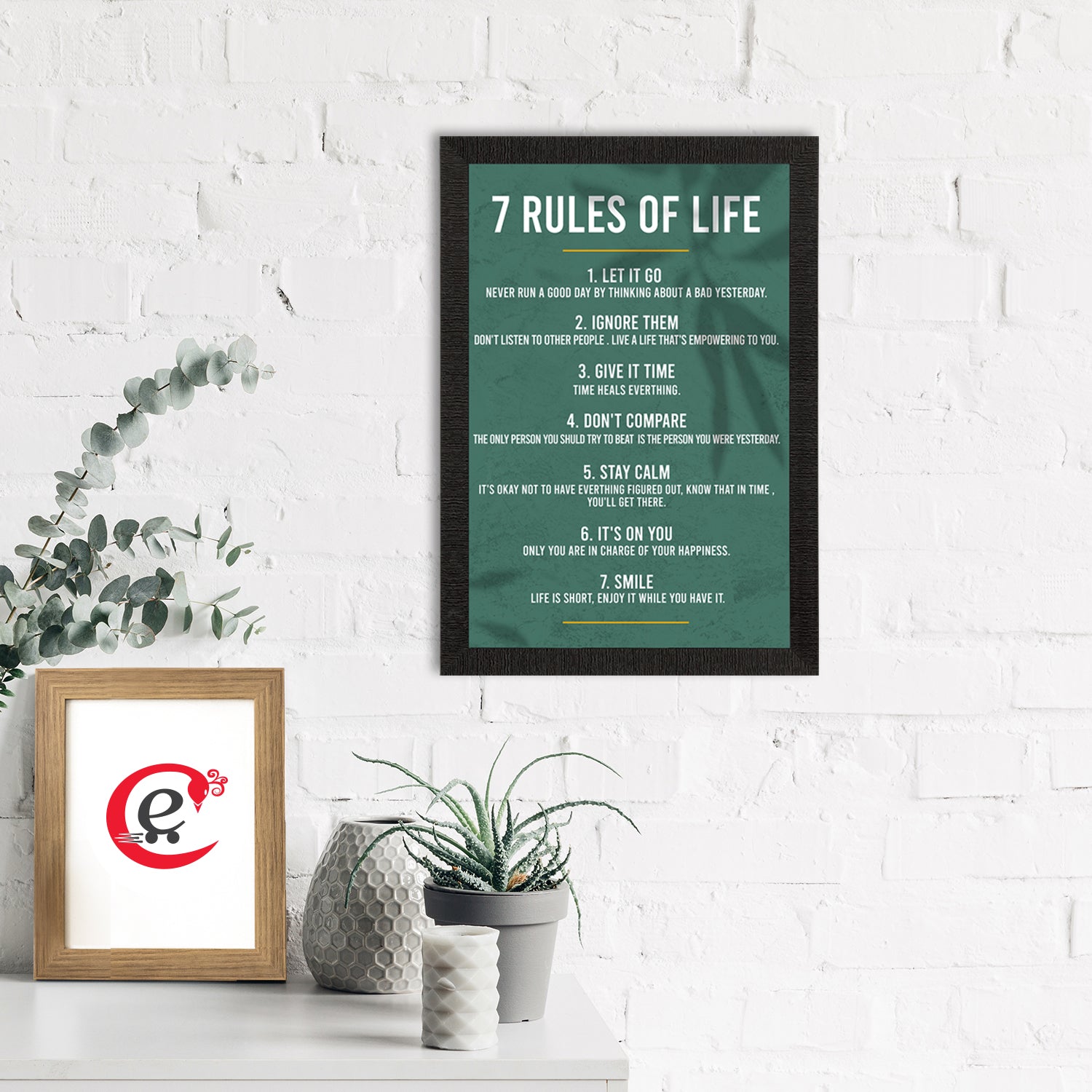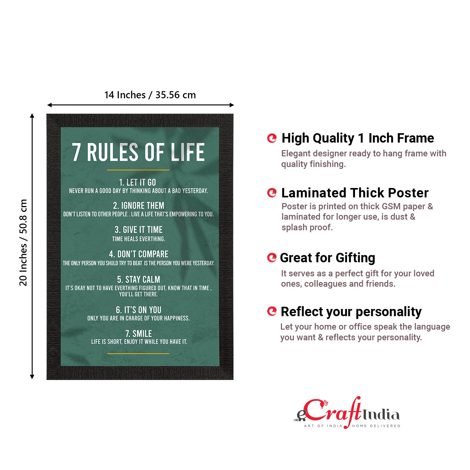 Product Description - Decorate your home & office walls with this artistic design eCraftIndia "7 Rules of Life " Motivational Quote Satin Matt Texture UV Art Painting. Each design reflects the artistic qualities and time one has taken to design this painting. Exquisitely printed and framed, it is also a perfect gifting option for your colleagues, loved ones and family members. These frames don't include glass so it is very light weight and wet cloth can be used to clean it.