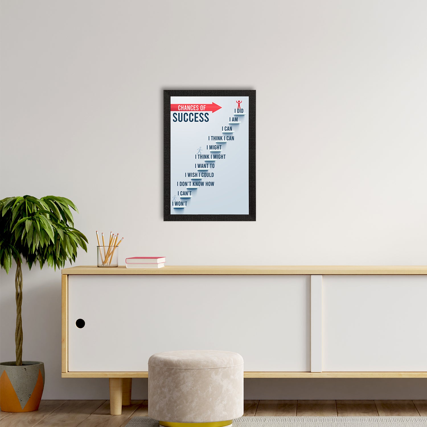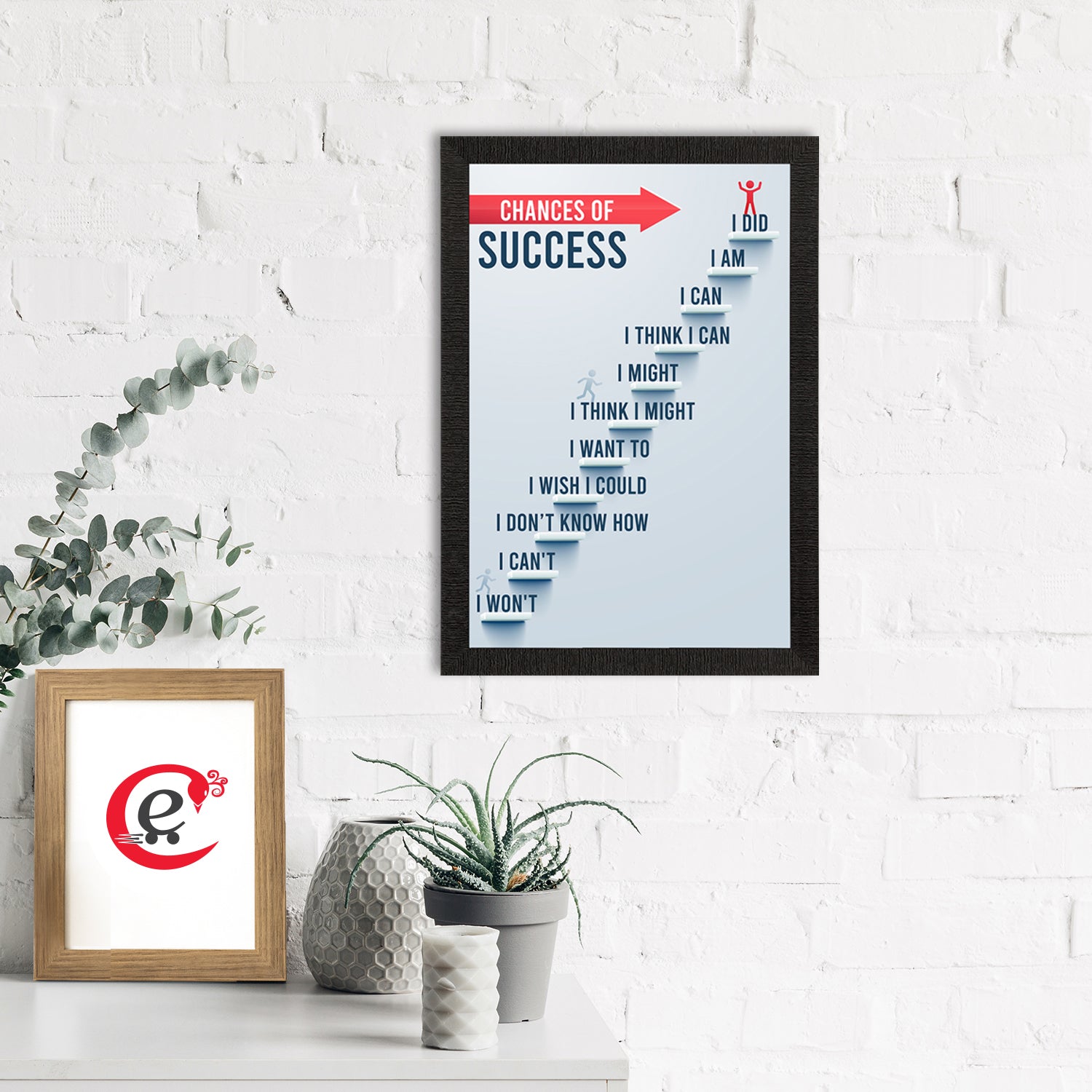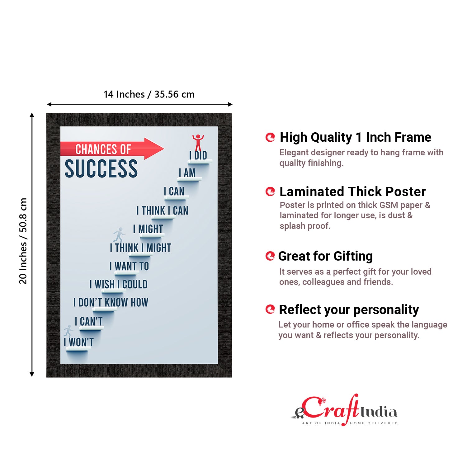 Product Description - Decorate your home & office walls with this artistic design eCraftIndia "Chances of Success" Motivational Quote Satin Matt Texture UV Art Painting. Each design reflects the artistic qualities and time one has taken to design this painting. Exquisitely printed and framed, it is also a perfect gifting option for your colleagues, loved ones and family members. These frames don't include glass so it is very light weight and wet cloth can be used to clean it.