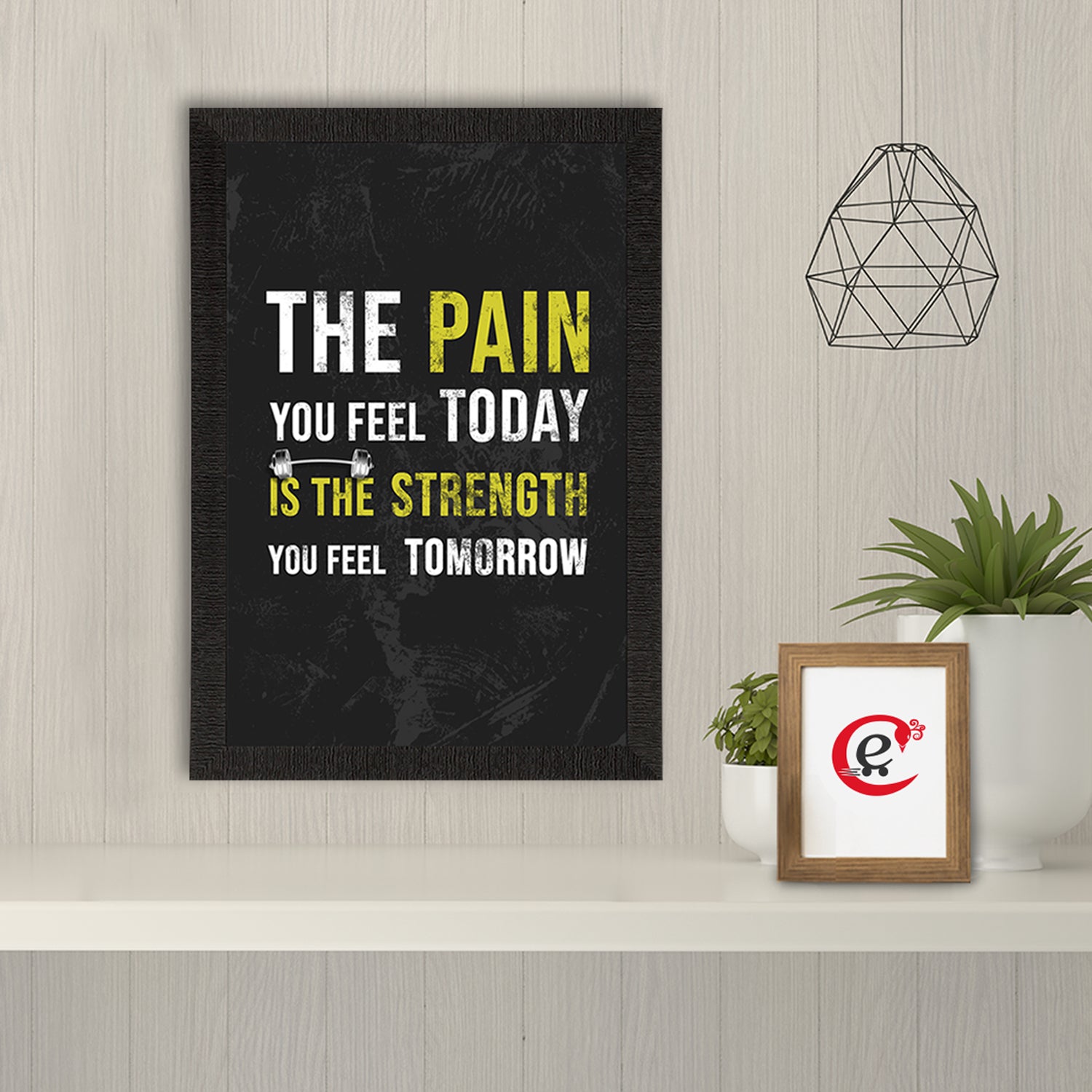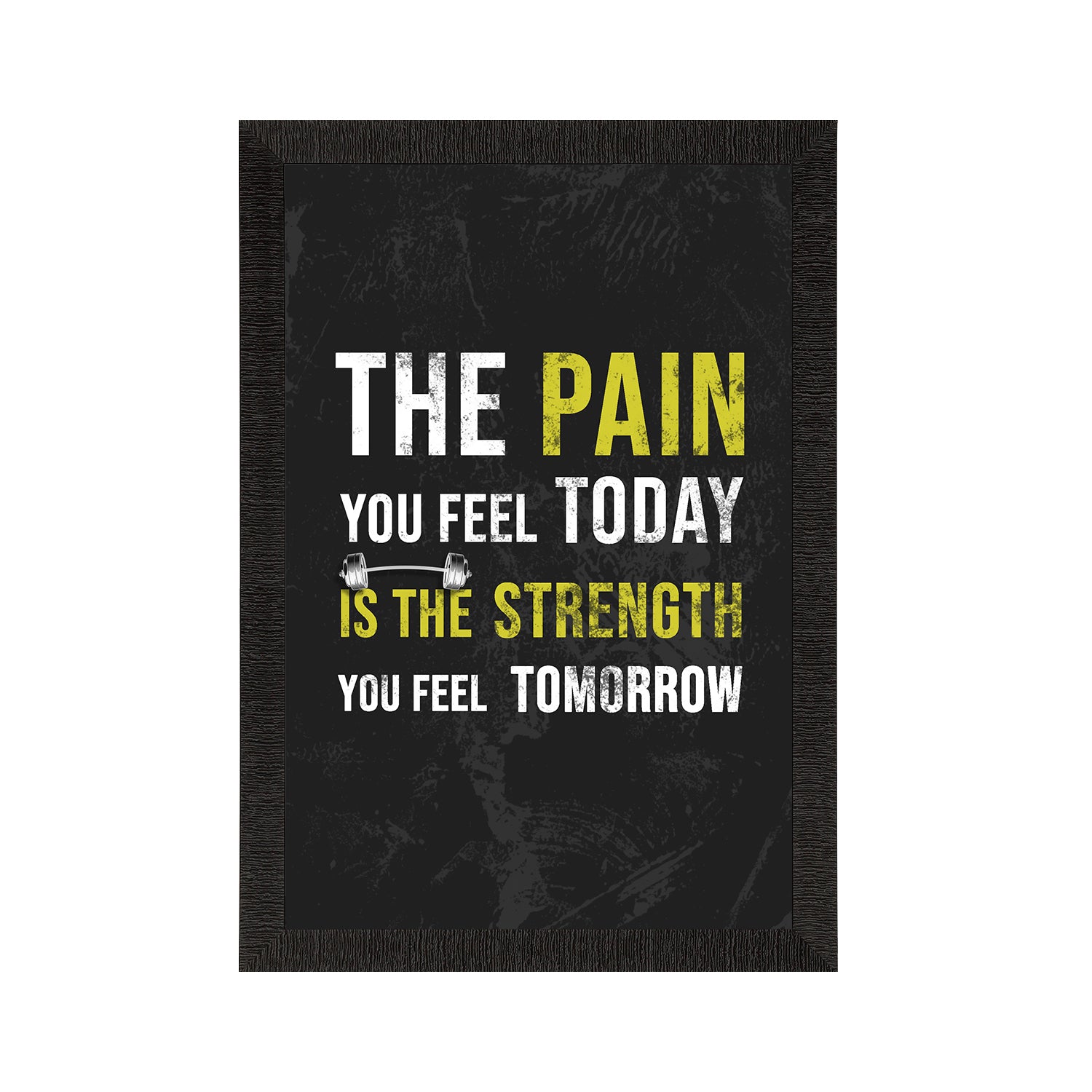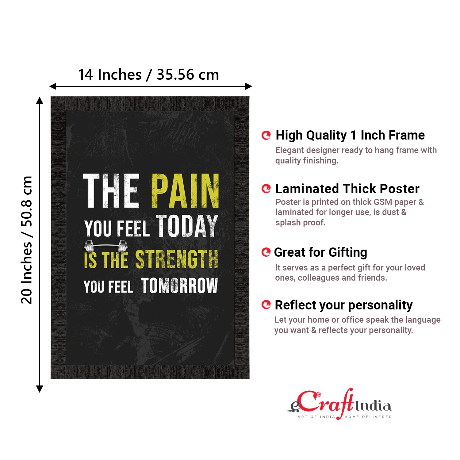 Product Description - Decorate your home & office walls with this artistic design eCraftIndia "The pain you feel today is the Strength you feel Tomorrow" Motivational Quote Satin Matt Texture UV Art Painting. Each design reflects the artistic qualities and time one has taken to design this painting. Exquisitely printed and framed, it is also a perfect gifting option for your colleagues, loved ones and family members. These frames don't include glass so it is very light weight and wet cloth can be used to clean it.