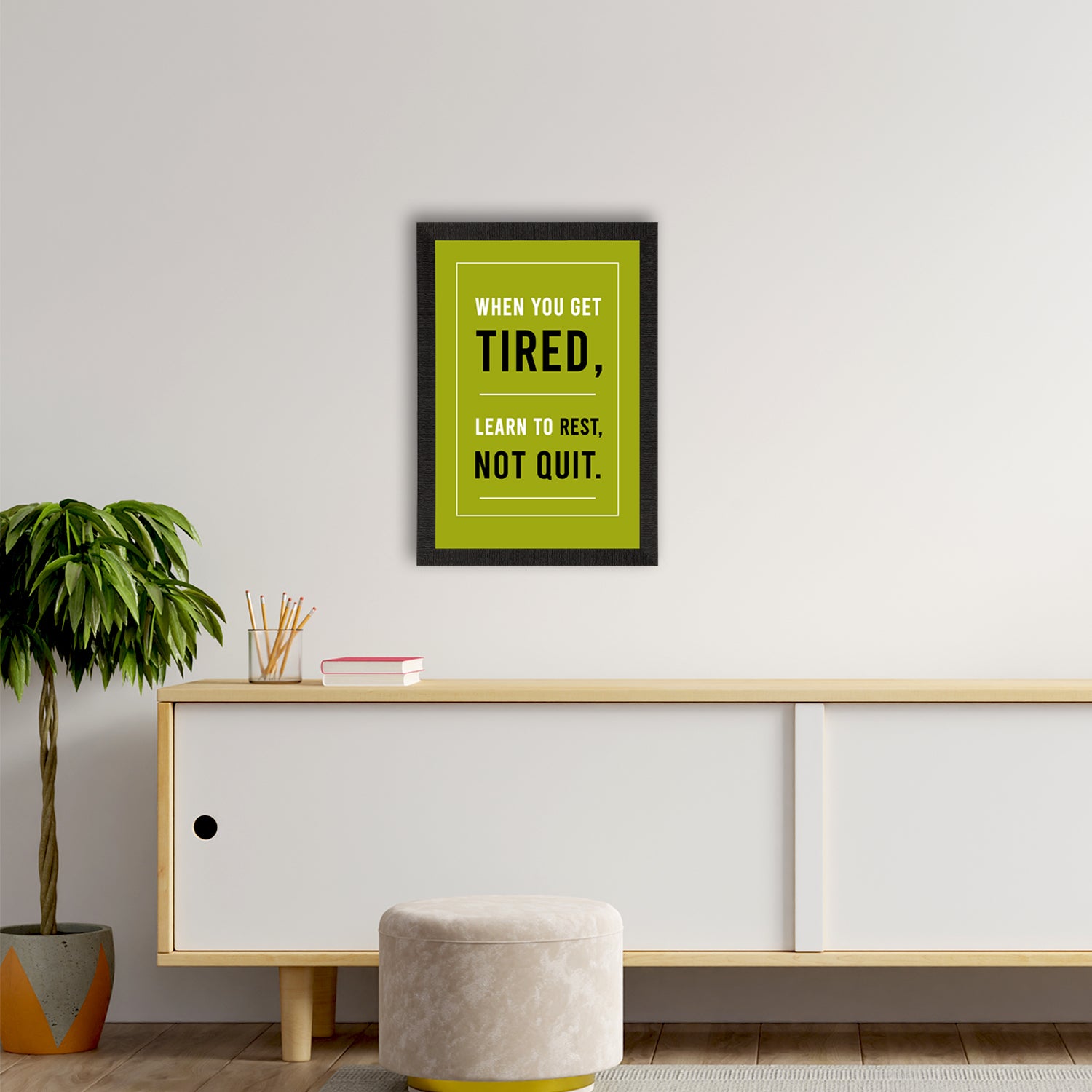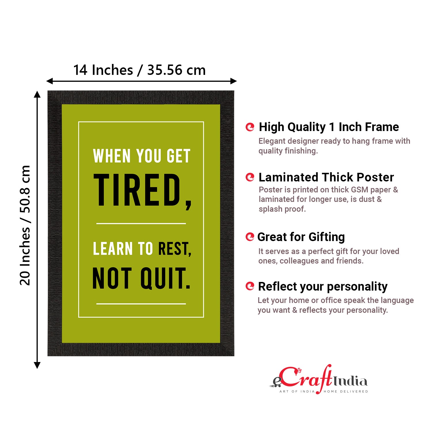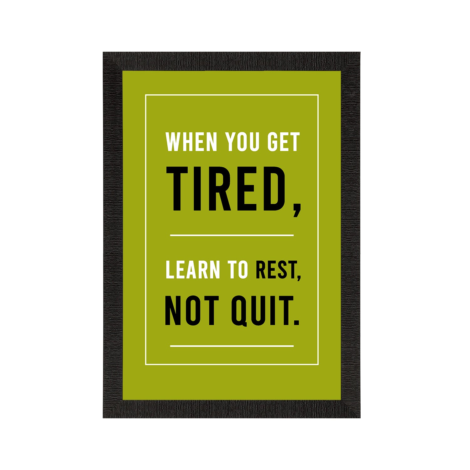 Product Description - Decorate your home & office walls with this artistic design eCraftIndia "When you get tired, Learn to rest, NOT QUIT" Motivational Quote Satin Matt Texture UV Art Painting. Each design reflects the artistic qualities and time one has taken to design this painting. Exquisitely printed and framed, it is also a perfect gifting option for your colleagues, loved ones and family members. These frames don't include glass so it is very light weight and wet cloth can be used to clean it.