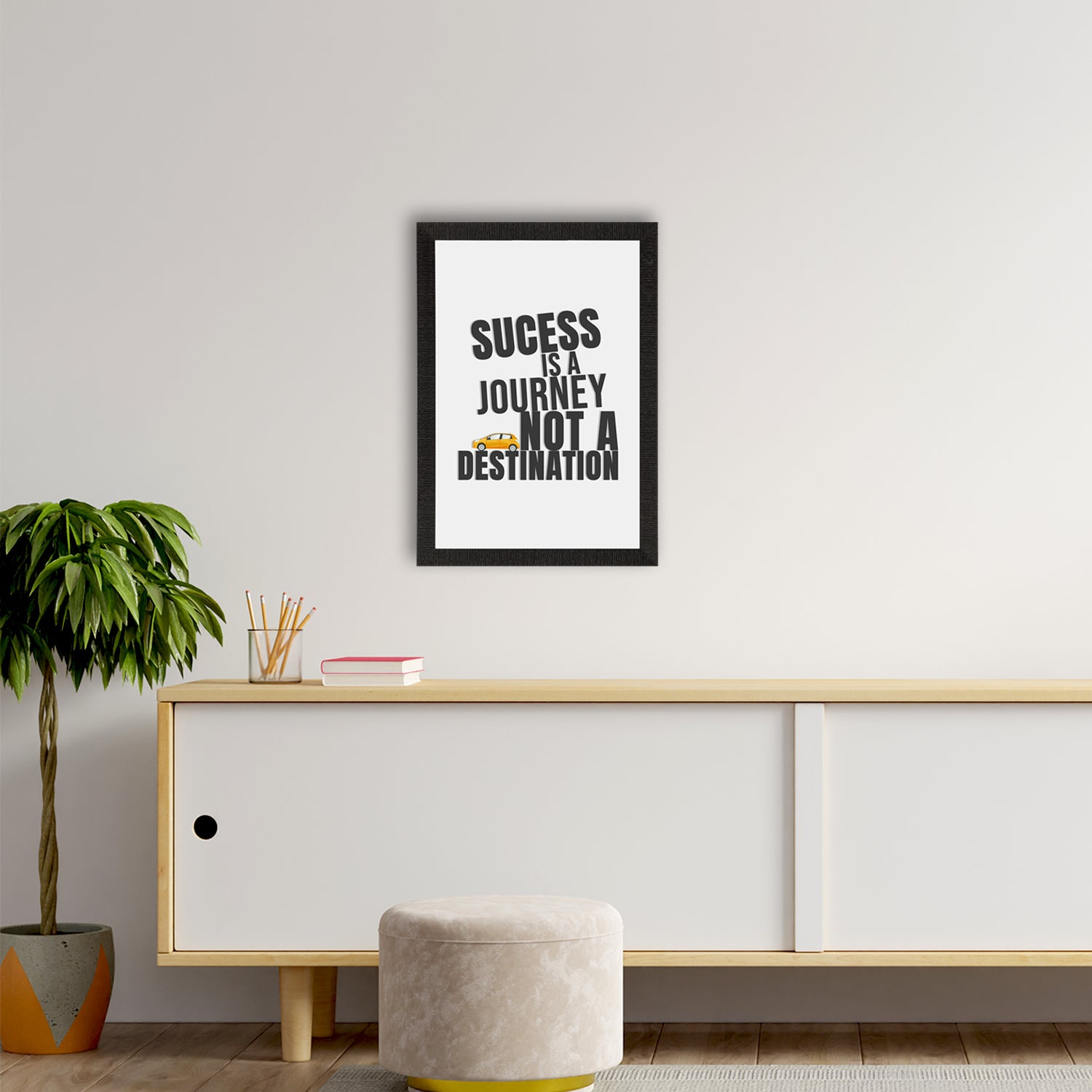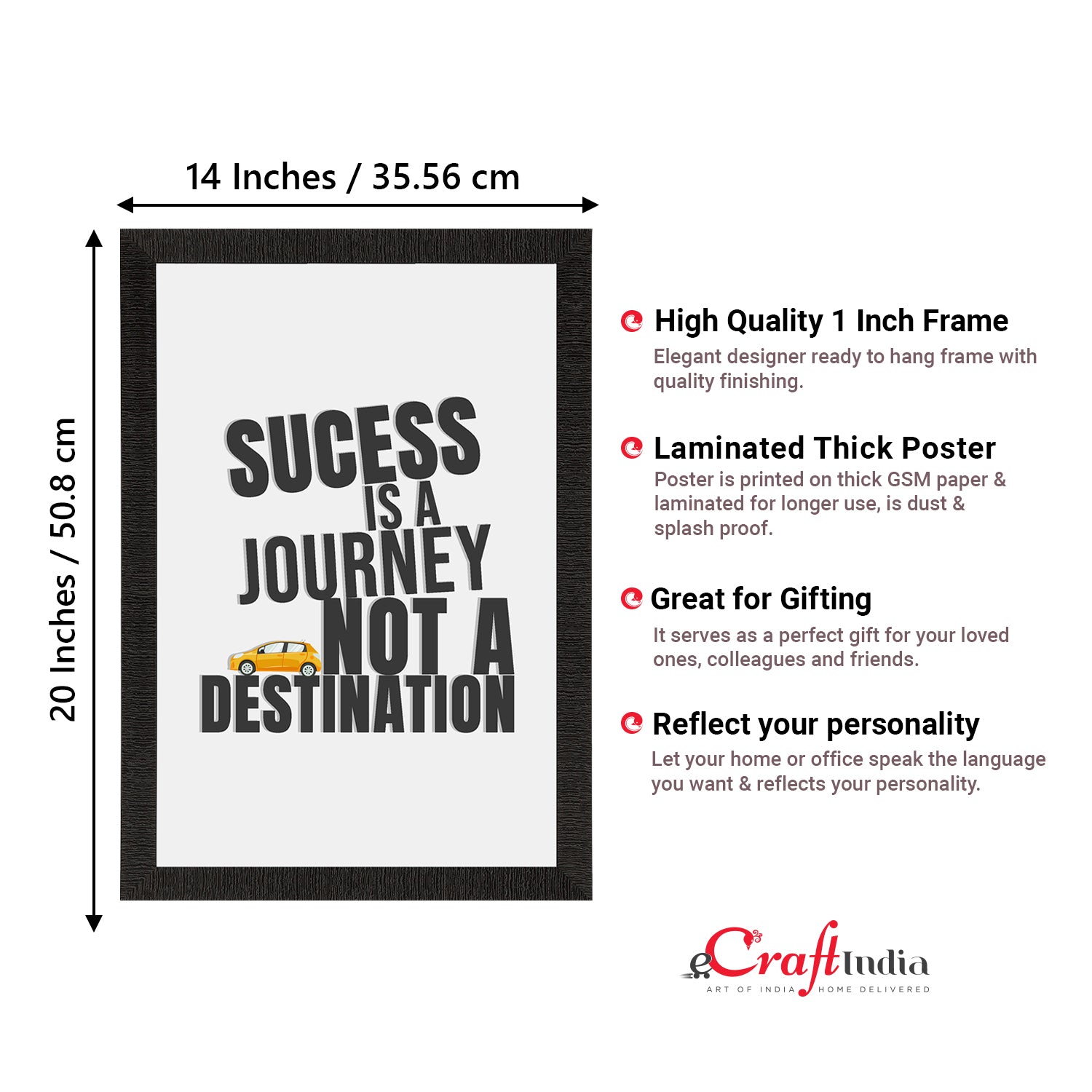 Product Description - Decorate your home & office walls with this artistic design eCraftIndia "Success is a Journey" Motivational Quote Satin Matt Texture UV Art Painting. Each design reflects the artistic qualities and time one has taken to design this painting. Exquisitely printed and framed, it is also a perfect gifting option for your colleagues, loved ones and family members. These frames don't include glass so it is very light weight and wet cloth can be used to clean it.