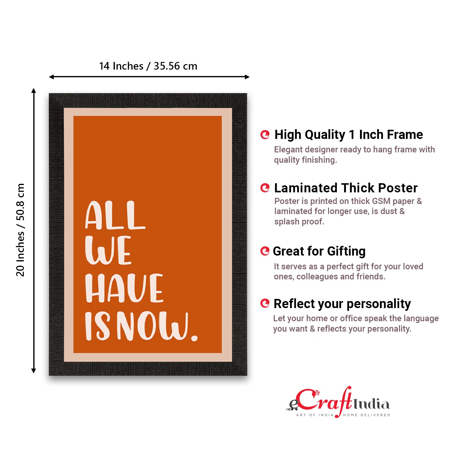 Product Description - Decorate your home & office walls with this artistic design eCraftIndia "All we have is now" Motivational Quote Satin Matt Texture UV Art Painting. Each design reflects the artistic qualities and time one has taken to design this painting. Exquisitely printed and framed, it is also a perfect gifting option for your colleagues, loved ones and family members. These frames don't include glass so it is very light weight and wet cloth can be used to clean it.
