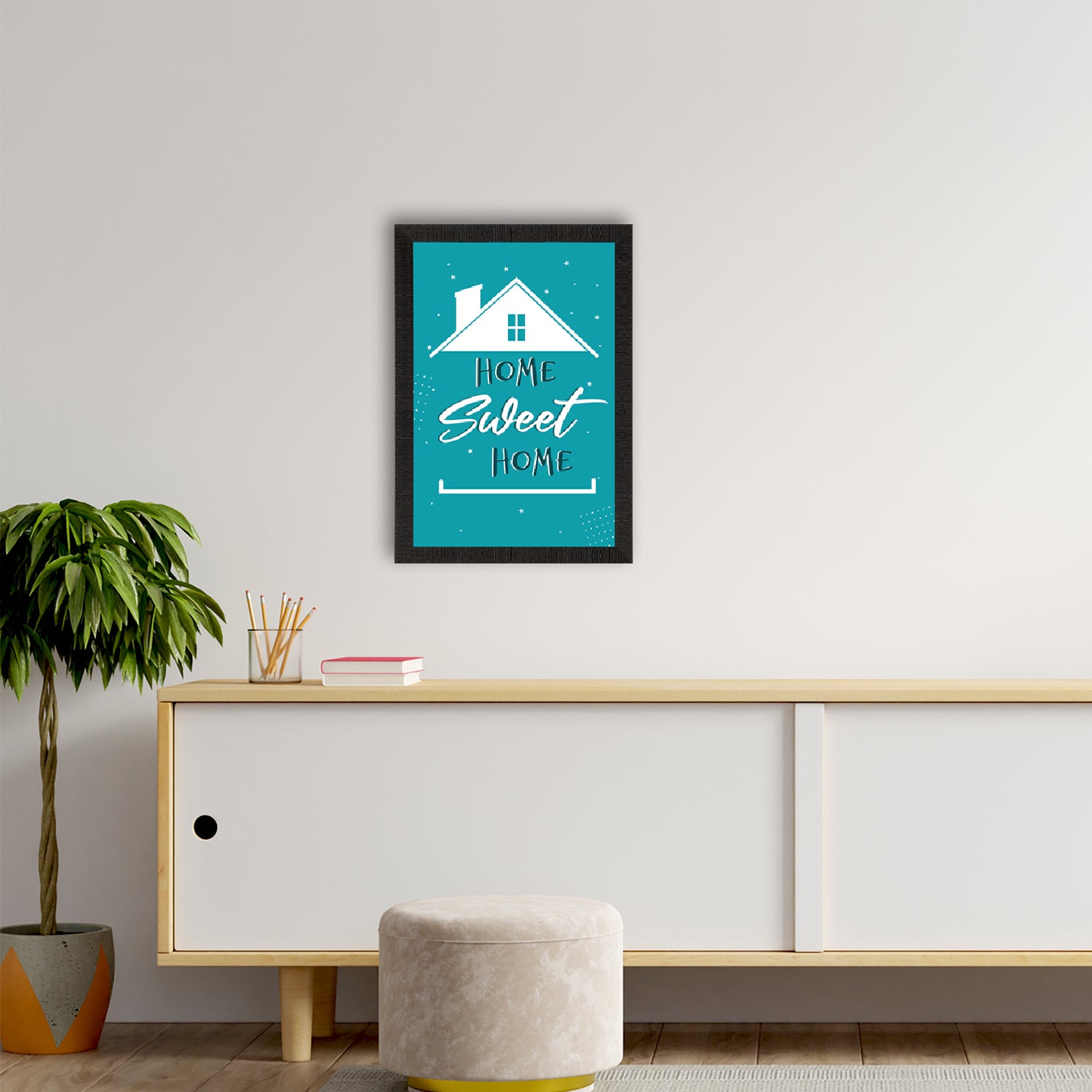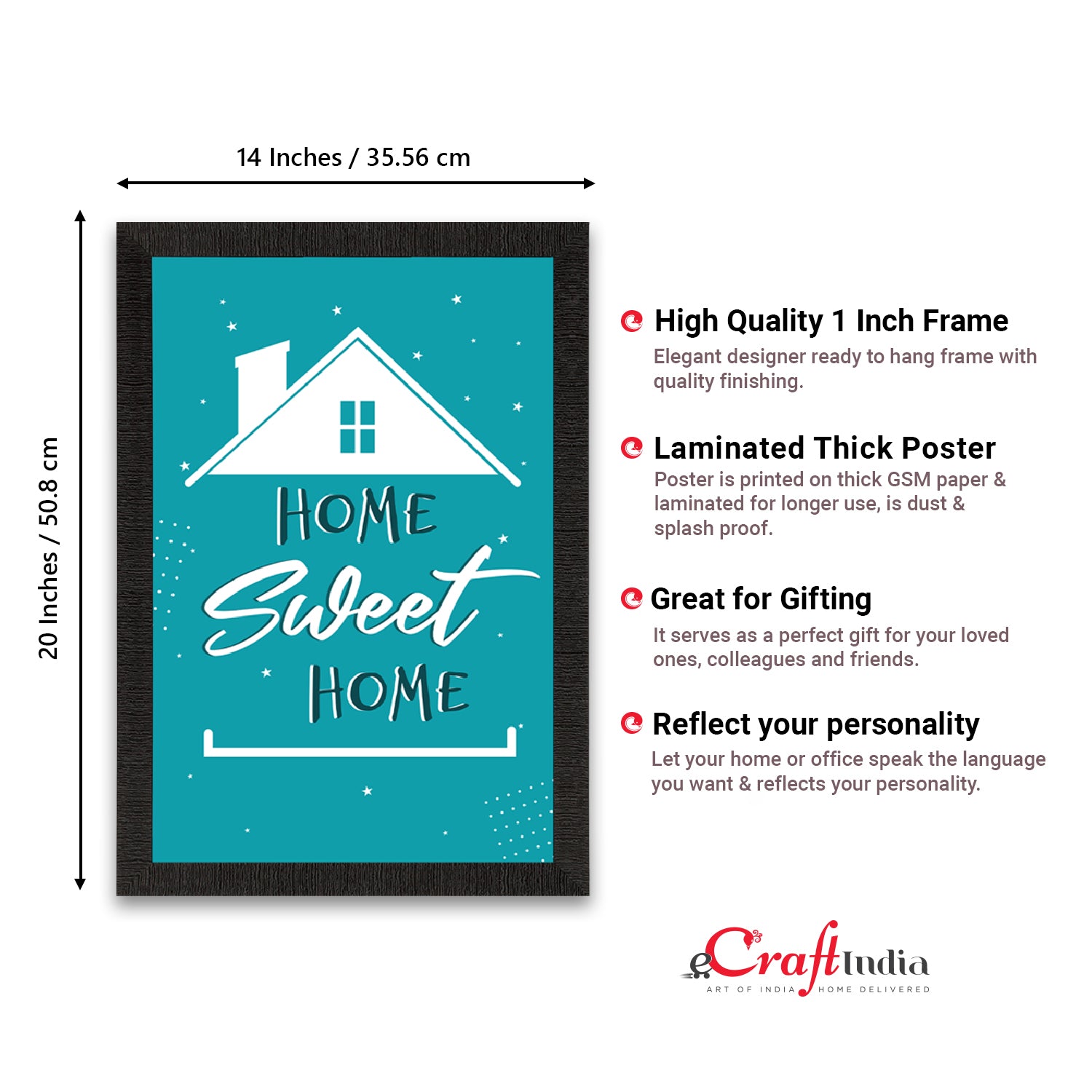 Product Description - Decorate your home & office walls with this artistic design eCraftIndia "Home Sweet Home" Motivational Quote Satin Matt Texture UV Art Painting. Each design reflects the artistic qualities and time one has taken to design this painting. Exquisitely printed and framed, it is also a perfect gifting option for your colleagues, loved ones and family members. These frames don't include glass so it is very light weight and wet cloth can be used to clean it.