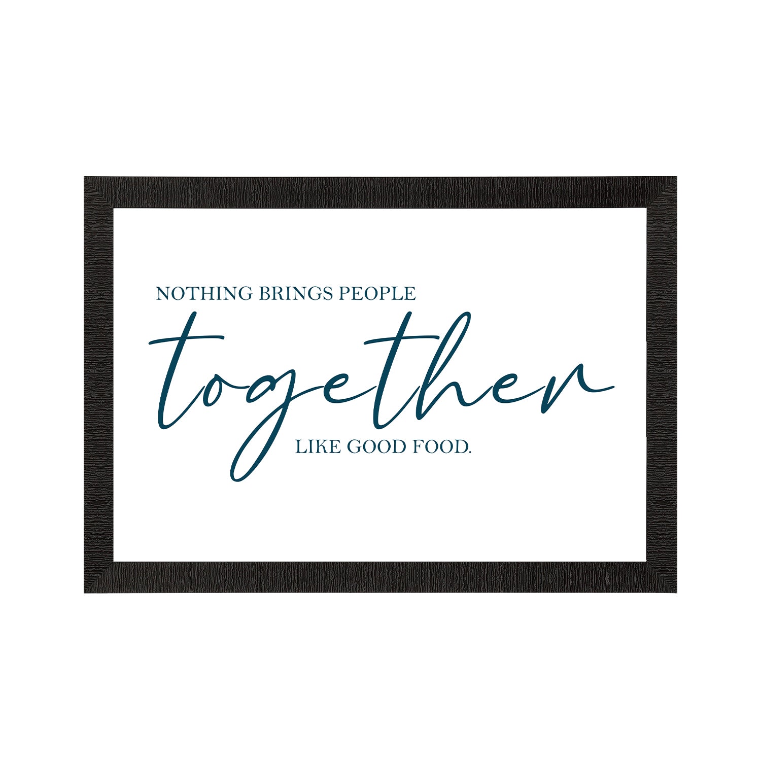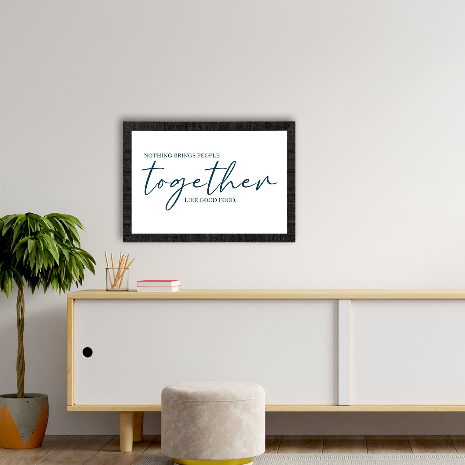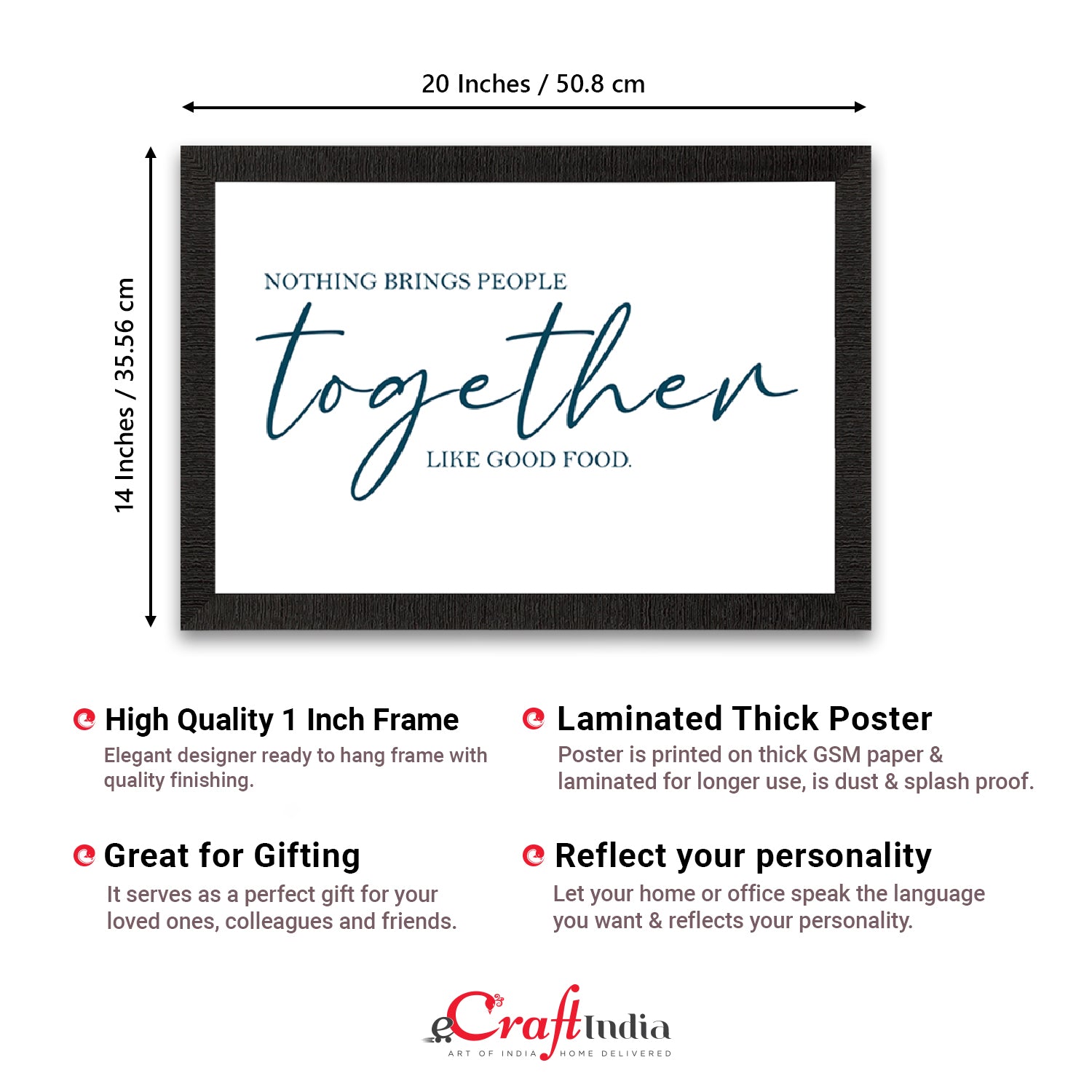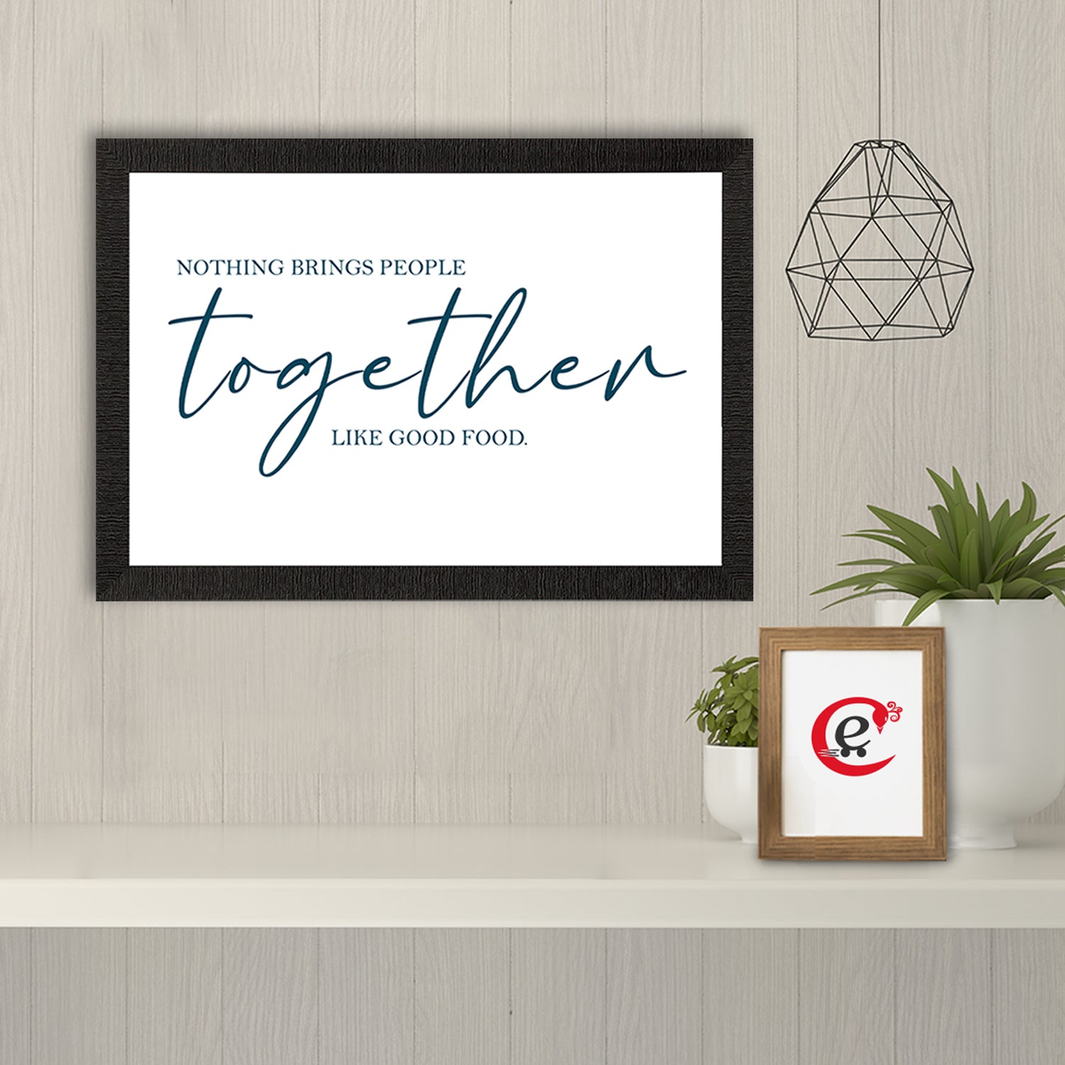 Product Description - Decorate your home & office walls with this artistic design eCraftIndia "Nothing Brings people Together like good food" Quote Satin Matt Texture UV Art Painting. Each design reflects the artistic qualities and time one has taken to design this painting. Exquisitely printed and framed, it is also a perfect gifting option for your colleagues, loved ones and family members. These frames don't include glass so it is very light weight and wet cloth can be used to clean it.