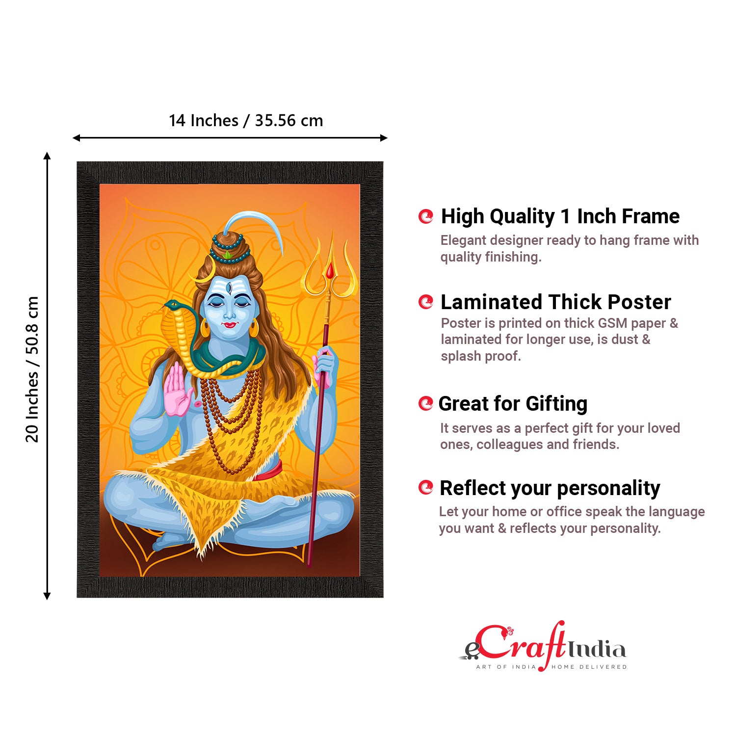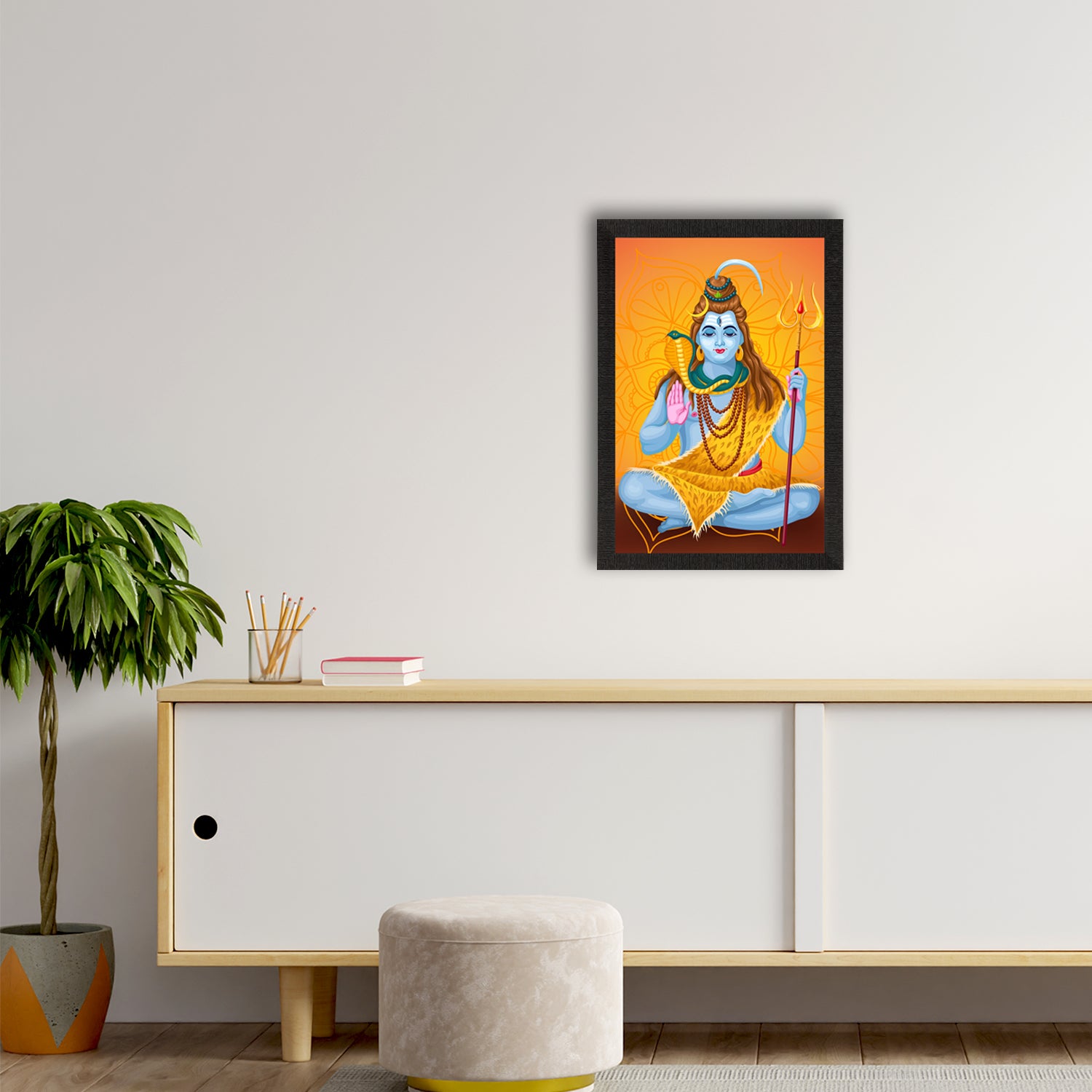Product Description - Lord Shiva, the Lord of cattle & the destroyer of the universe symbolizes different powers & forms. Lord Shiva is said to depict eternal energy & responsiveness & all of these traits can be seen in our Lord Shiva framed paintings. Therefore, these framed wall paintings make a great gift option for your family & friends. Our Lord Shiva UV matt textured framed paintings are available in sets as well that will help you incorporate the entire wall space creatively. Each design reflects the artistic qualities and time one has taken to design this painting. These frames don't include glass so it is very lightweight and wet cloth can be used to clean them. Exquisitely printed and framed, it is also a perfect gifting option for your colleagues, loved ones, and family members.