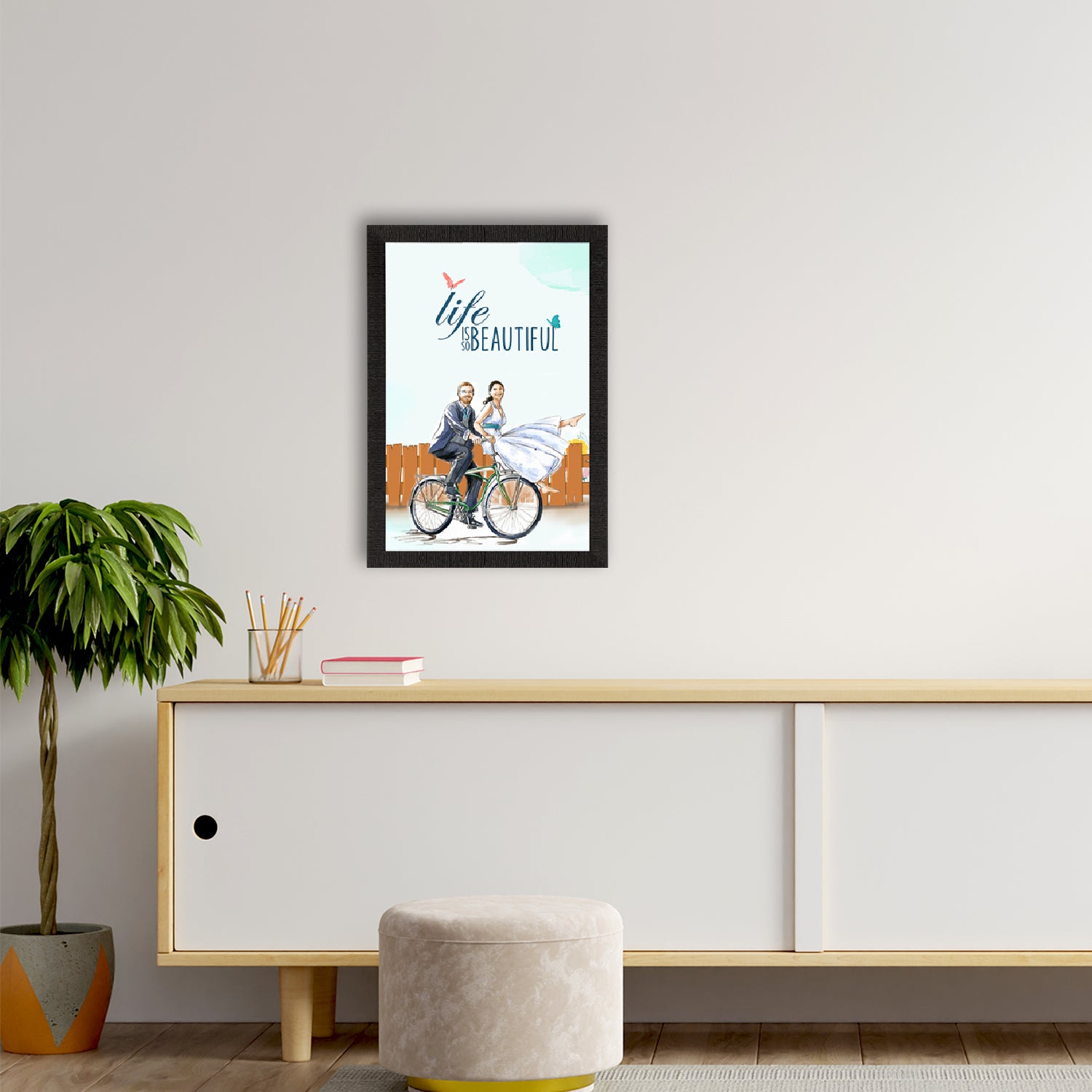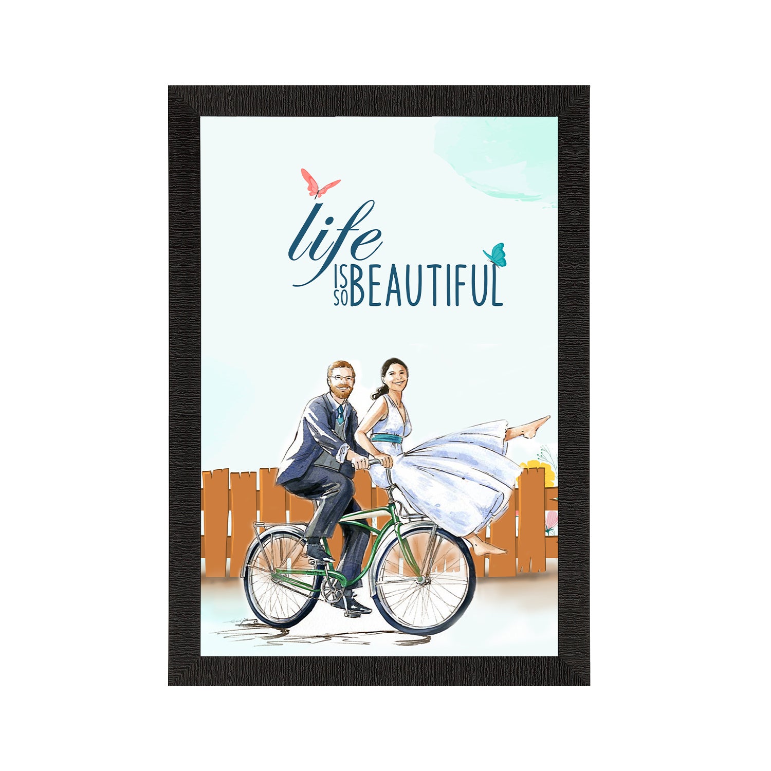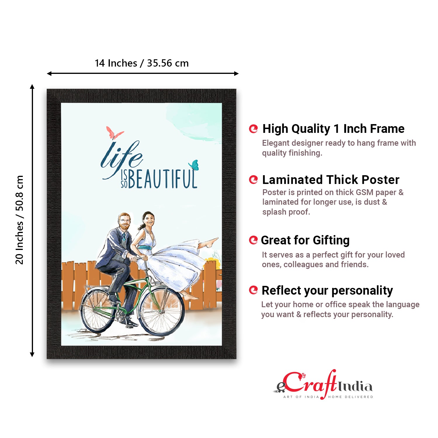 Product Description - Decorate your home & office walls with this artistic design eCraftIndia "Life is so Beautiful" Quirky Quote Satin Matt Texture UV Art Painting. Each design reflects the artistic qualities and time one has taken to design this painting. Exquisitely printed and framed, it is also a perfect gifting option for your colleagues, loved ones and family members. These frames don't include glass so it is very light weight and wet cloth can be used to clean it.