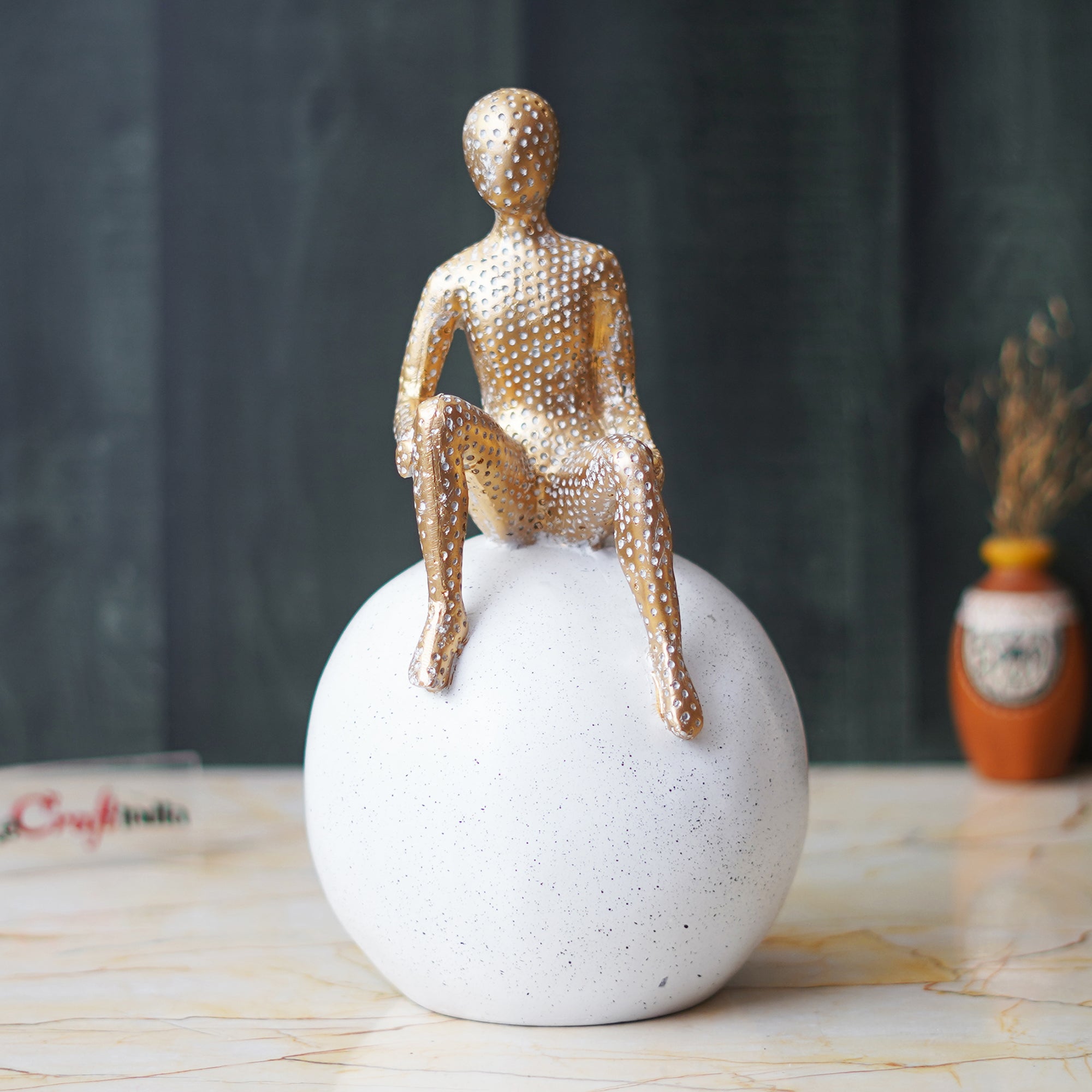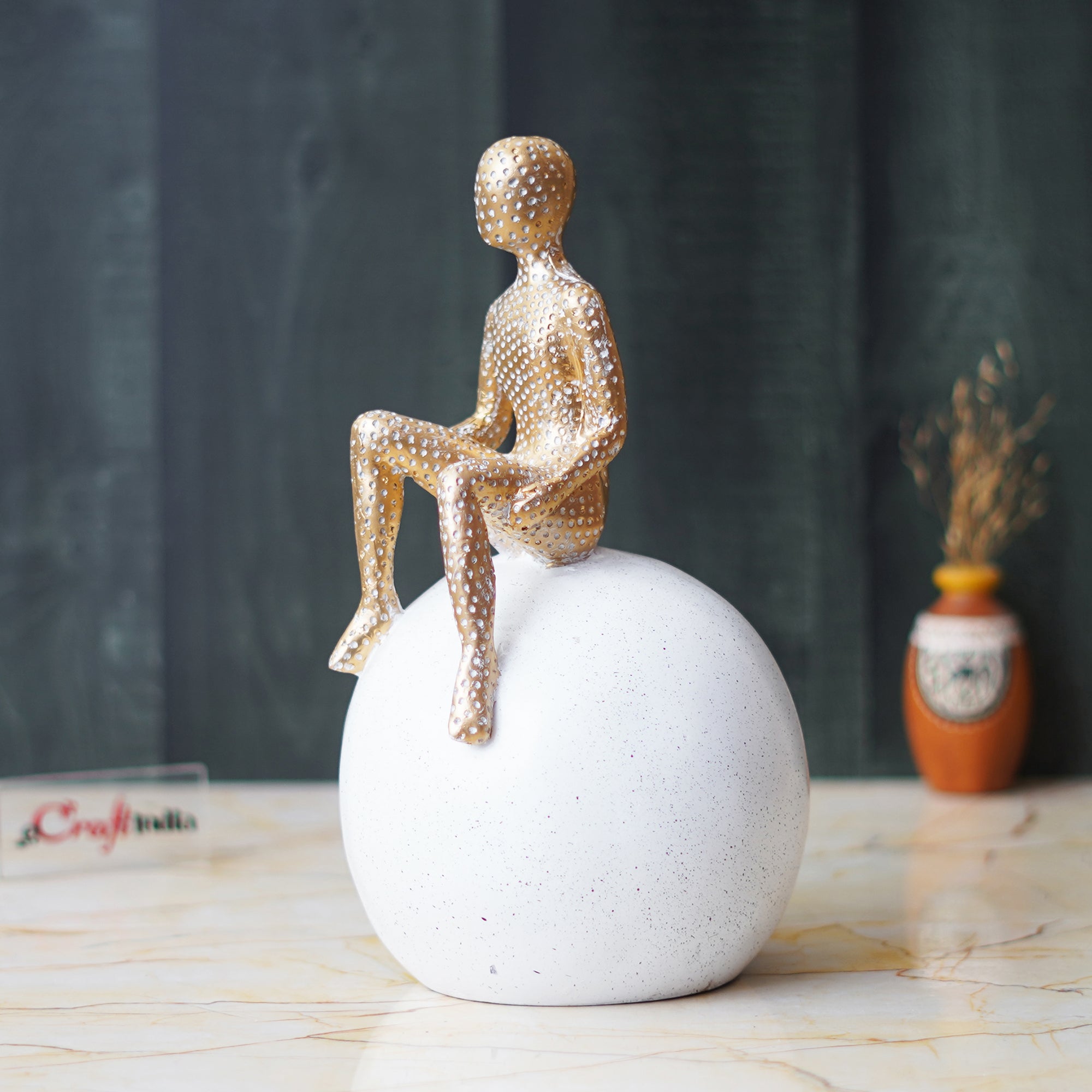 Product Description - Experience the charm of childhood with our captivating golden boy statue sitting on a white ball, crafted to add whimsy and joy to any space. Handcrafted with care from durable materials, this delightful showpiece promises longevity and charm, becoming a cherished addition to your decor. Whether as a birthday, housewarming gift, or to celebrate a special achievement, this statue radiates positivity and innocence. Place it in children's rooms, playrooms, or study areas to inspire creativity and imagination. Explore our collection of human figurines online and bring the enchantment of childhood into your home with this timeless treasure.