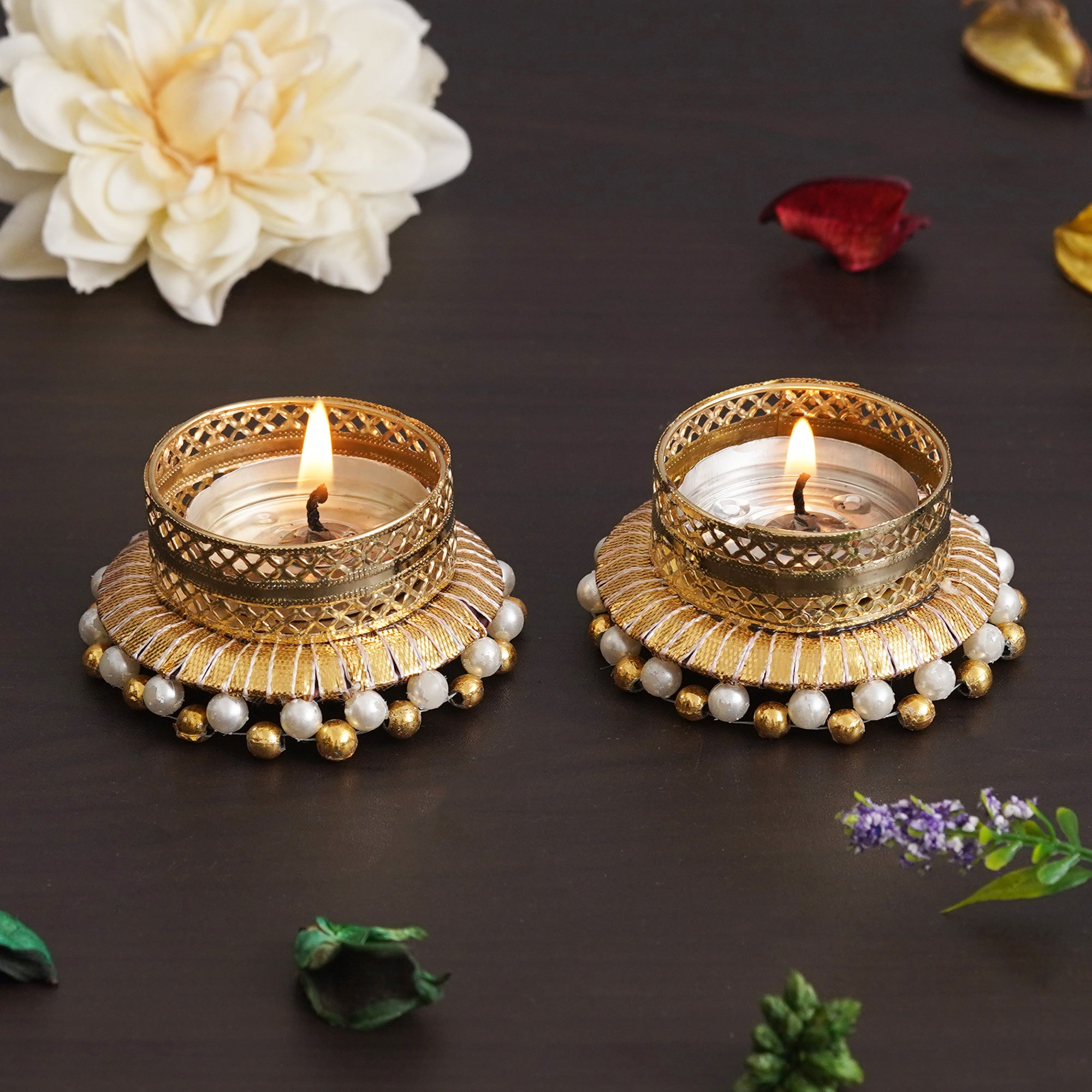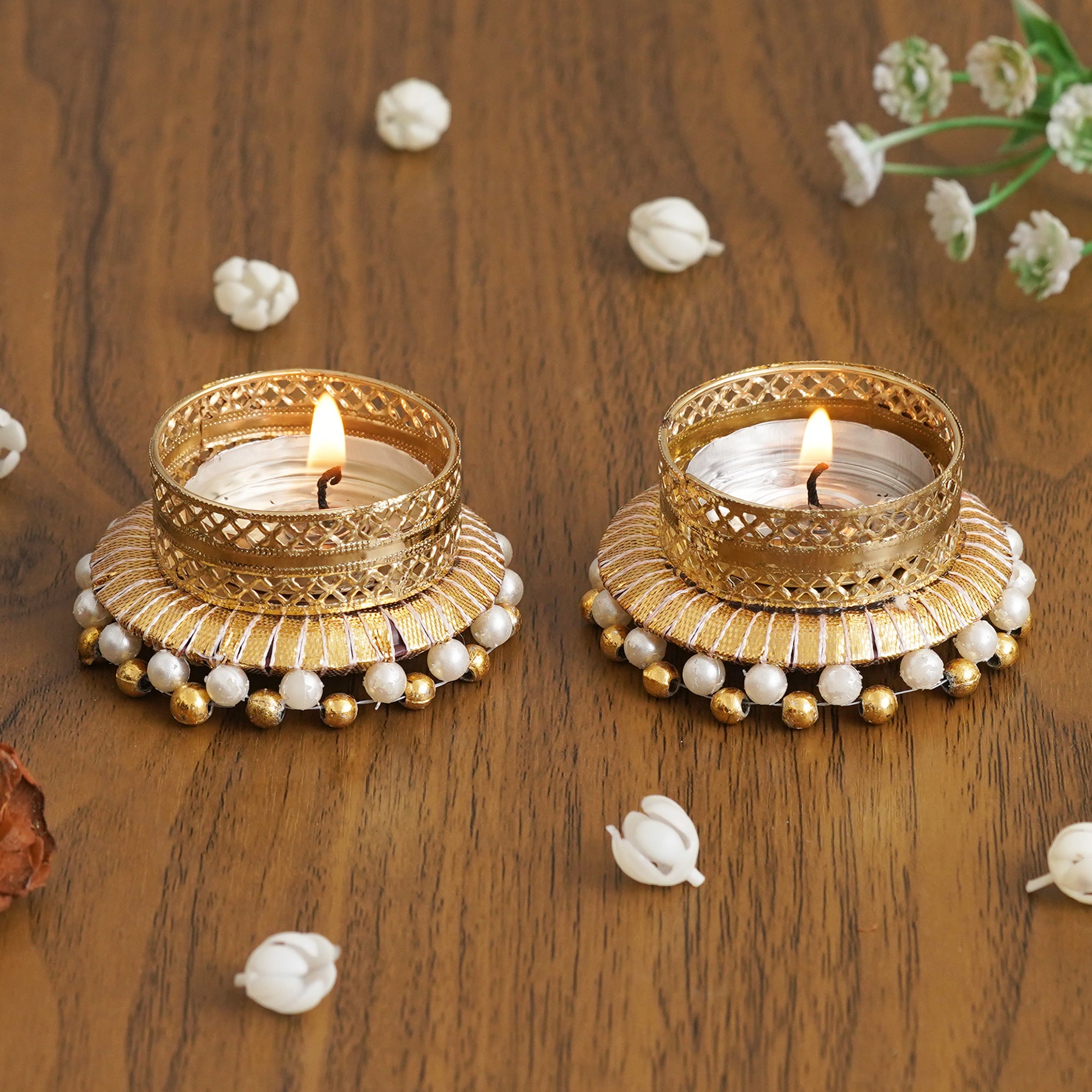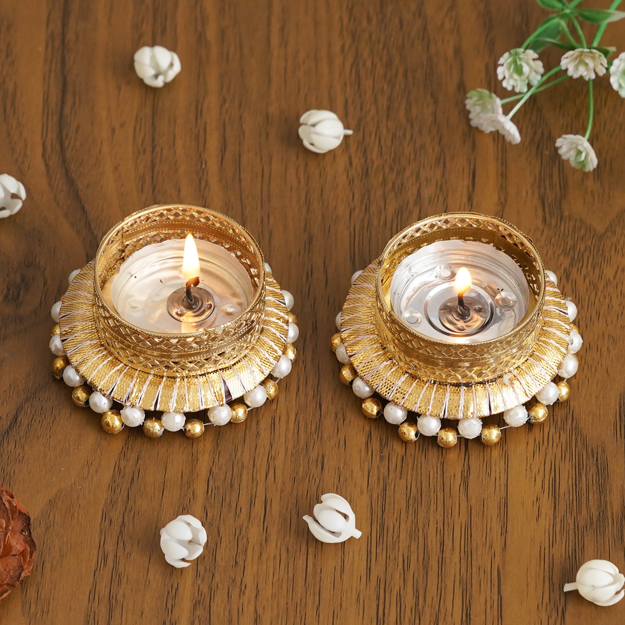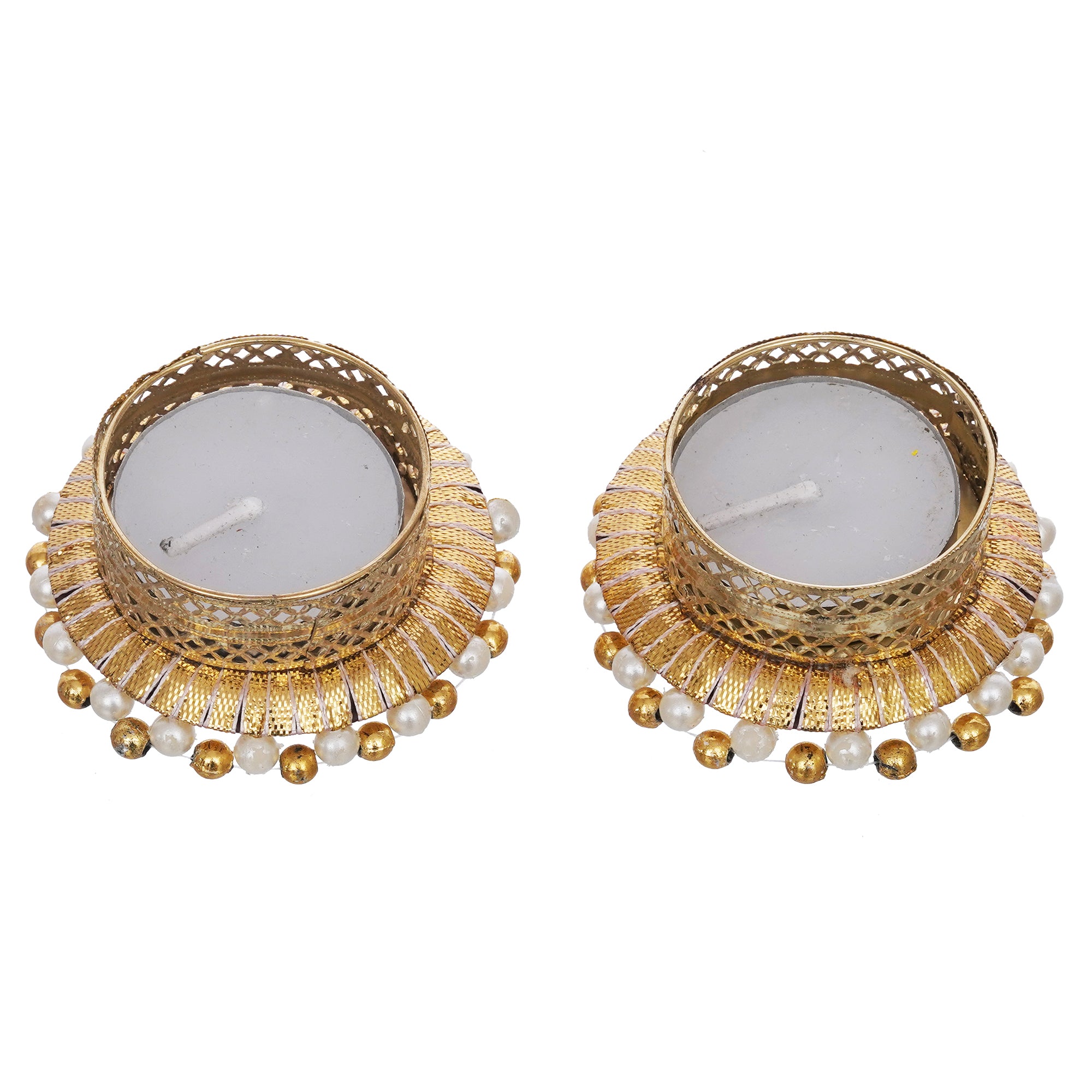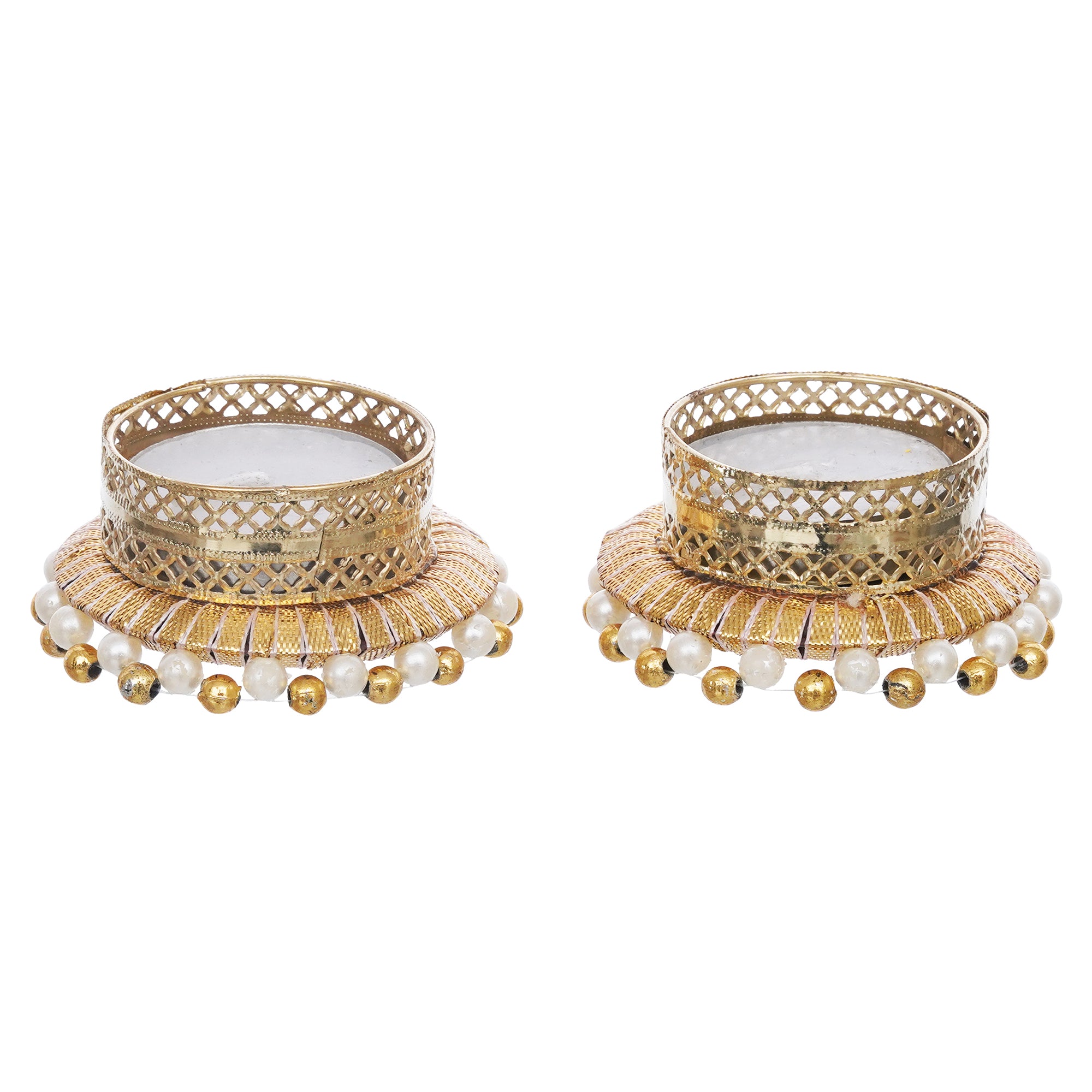 Package Content - One Set of 2 Golden & White Round Shaped Beaded Decorative Tea Light Candle Holders