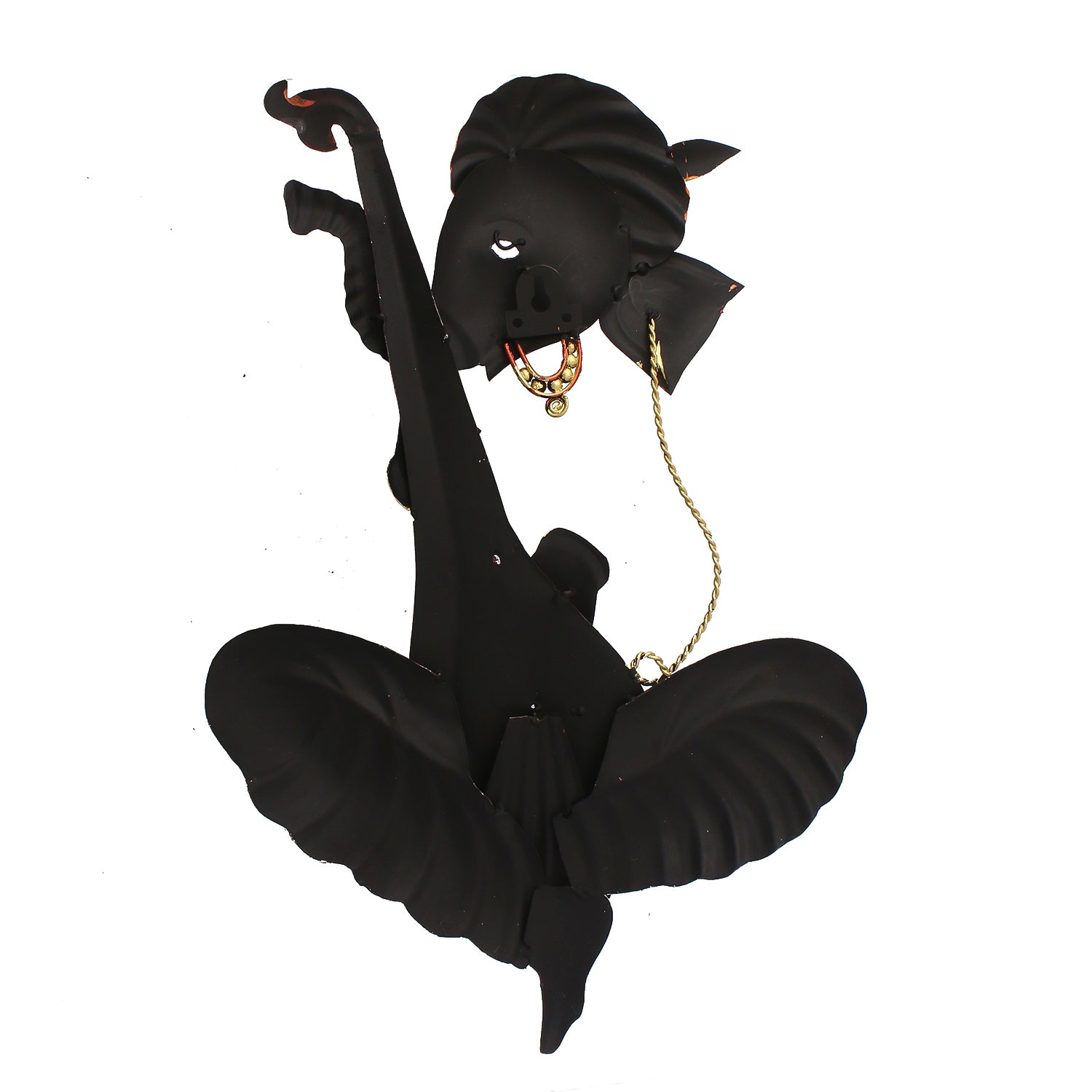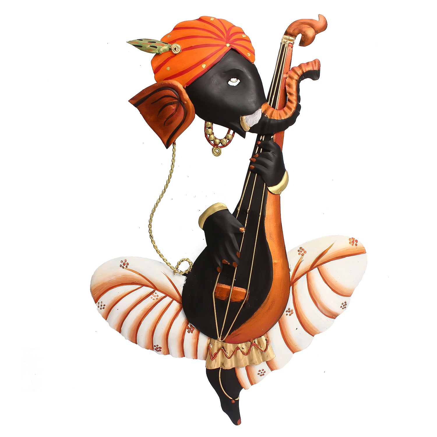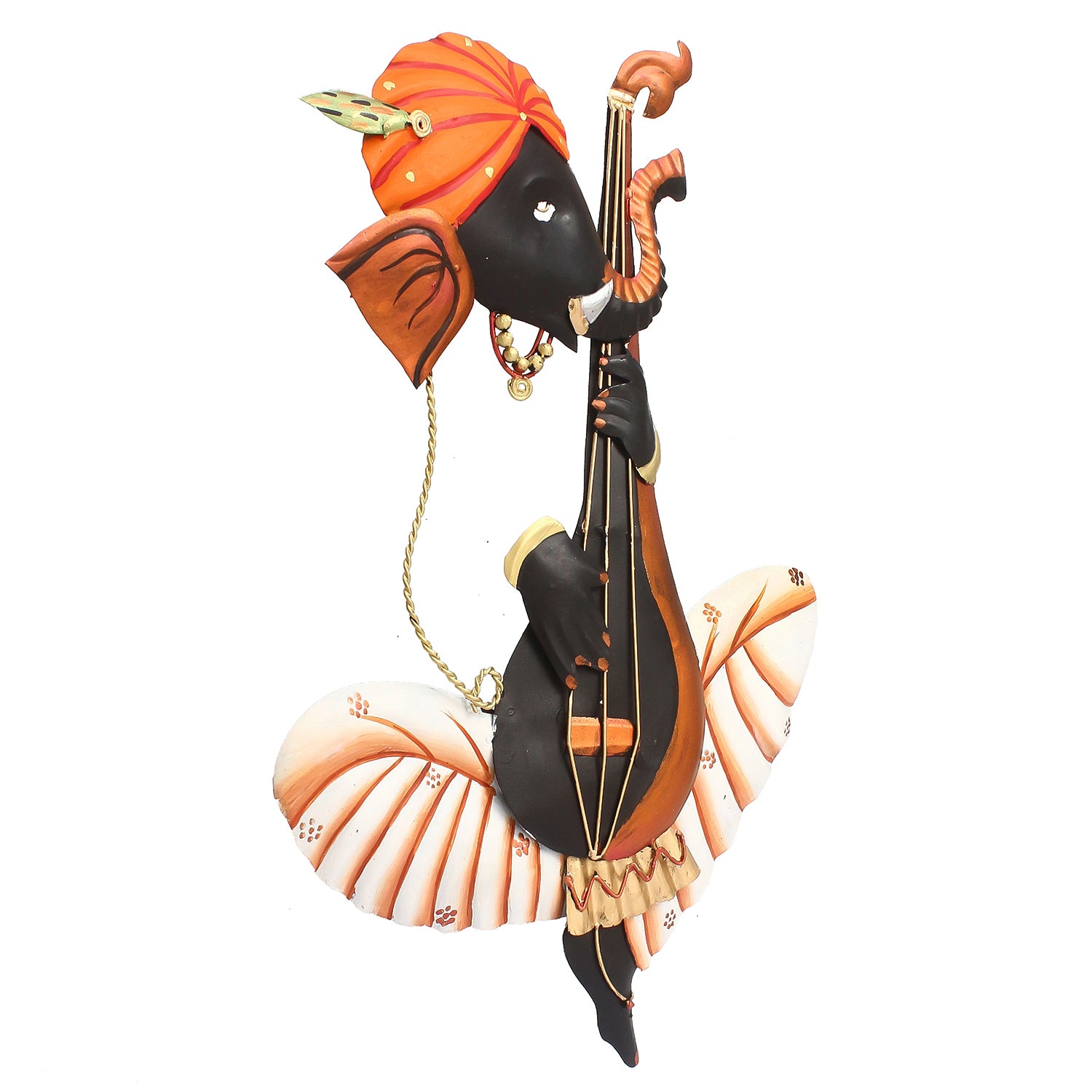 Product Description - Lord Ganesha has a close tie with music– it is said that all the rhythms in the universe are channeled through him, which is why there are always images and figurines depicting him with a musical instrument. You would have seen figurines where you see Ganesha playing a tabla or shehnai, but how many times would you have seen him playing the veena? With our Orange, Silver & Black iron Lord Ganesha playing veena wall hanging, you can see his semi-form playing the dholak with aplomb– although there is no torso to this Ganesha, the detailing is intricate and impressive! Exquisitely designed and intricately crafted, it makes for a perfect gifting option for friends & family. You can find many more wall hangings in different patterns on our online portal in various colors that suit your home or office interior.