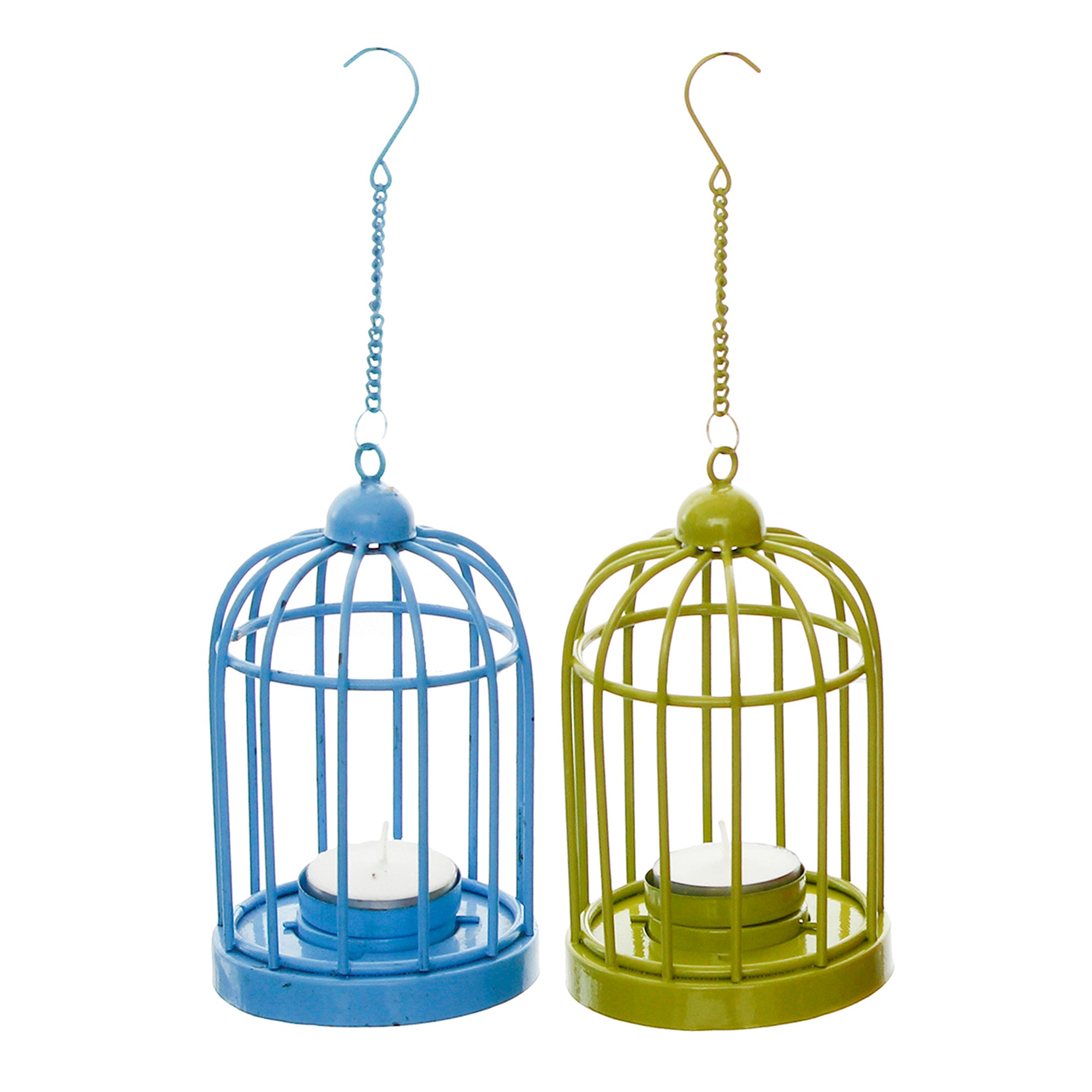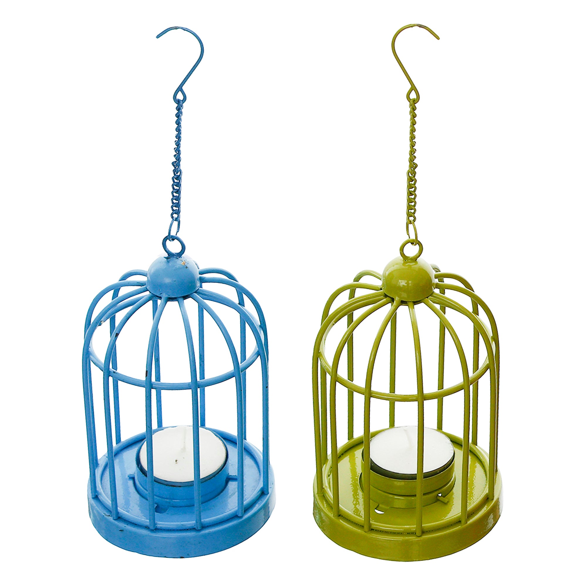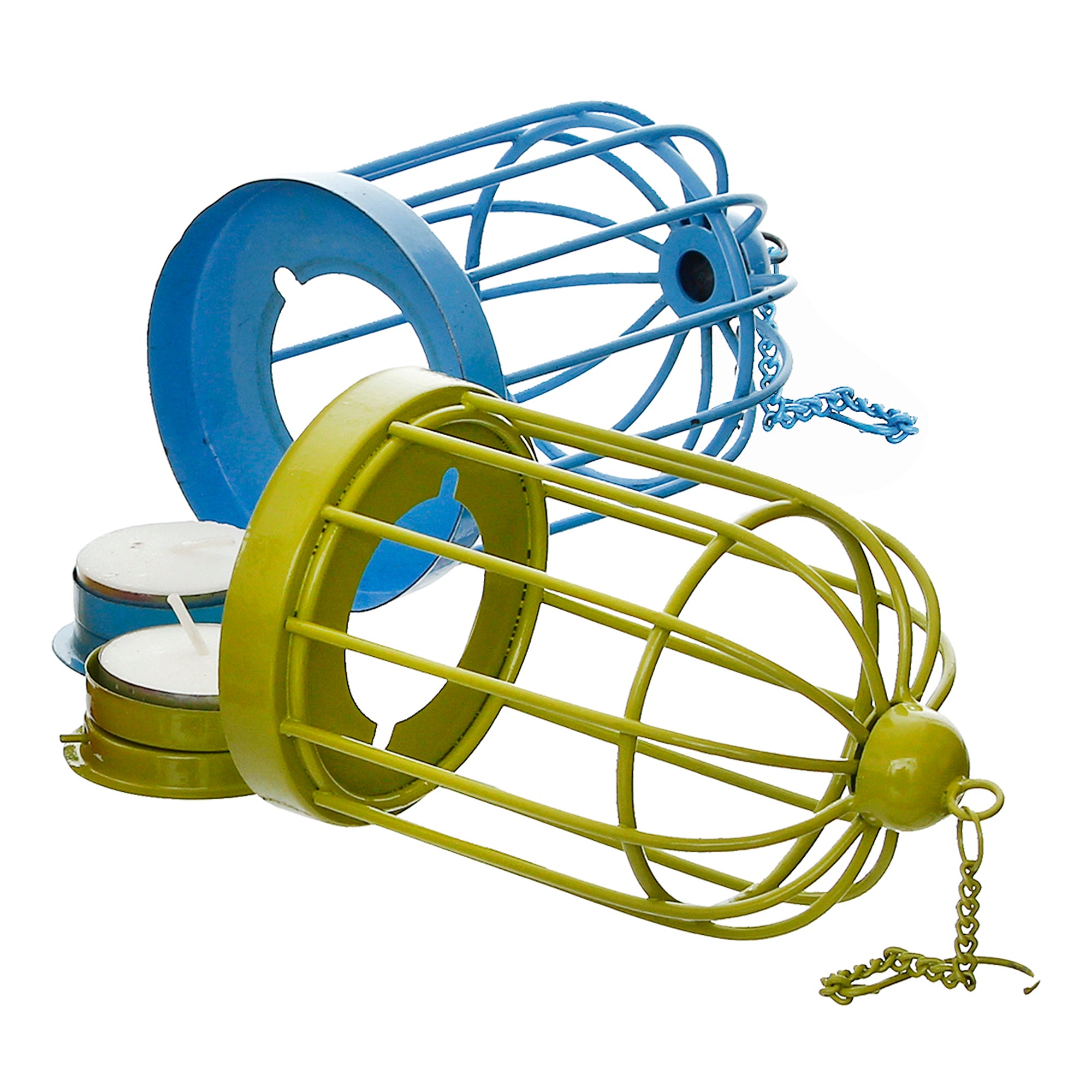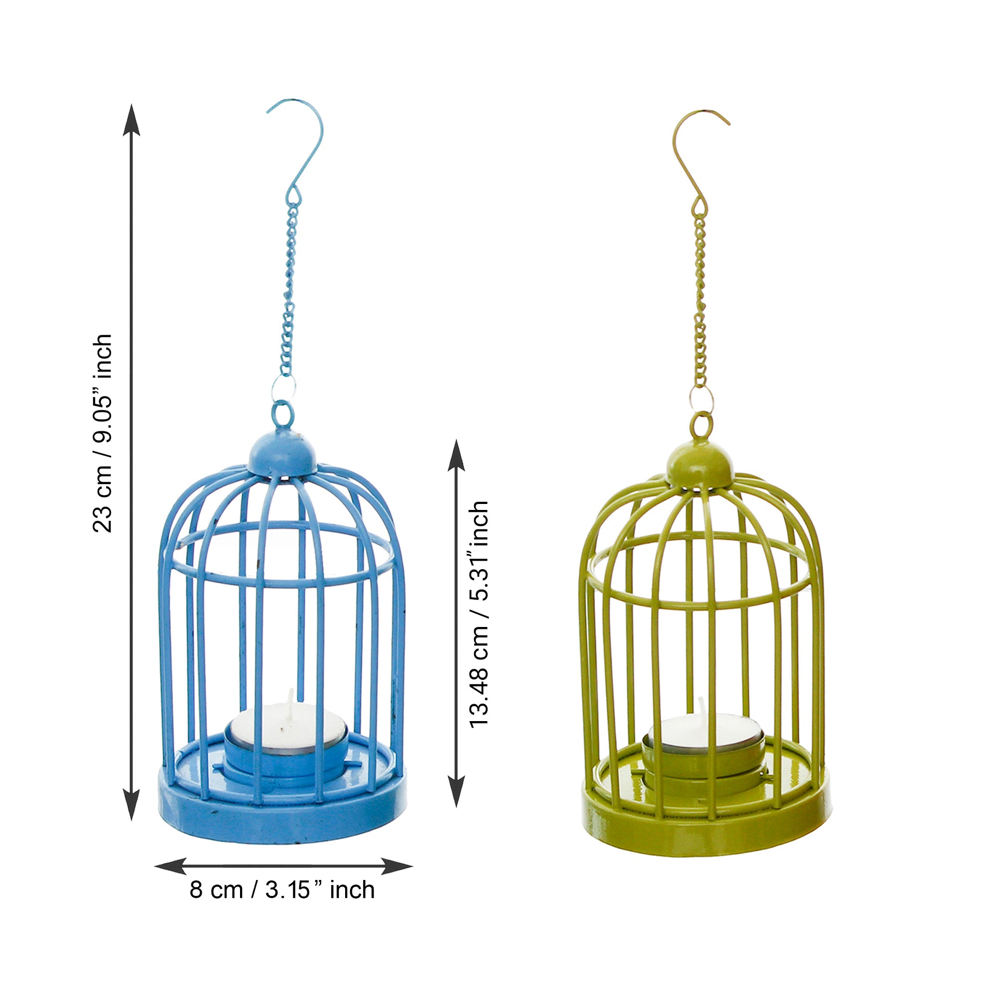 Package Content - One Set of 2 Blue and Green Cage Tea Light Holder With Hanging Chain