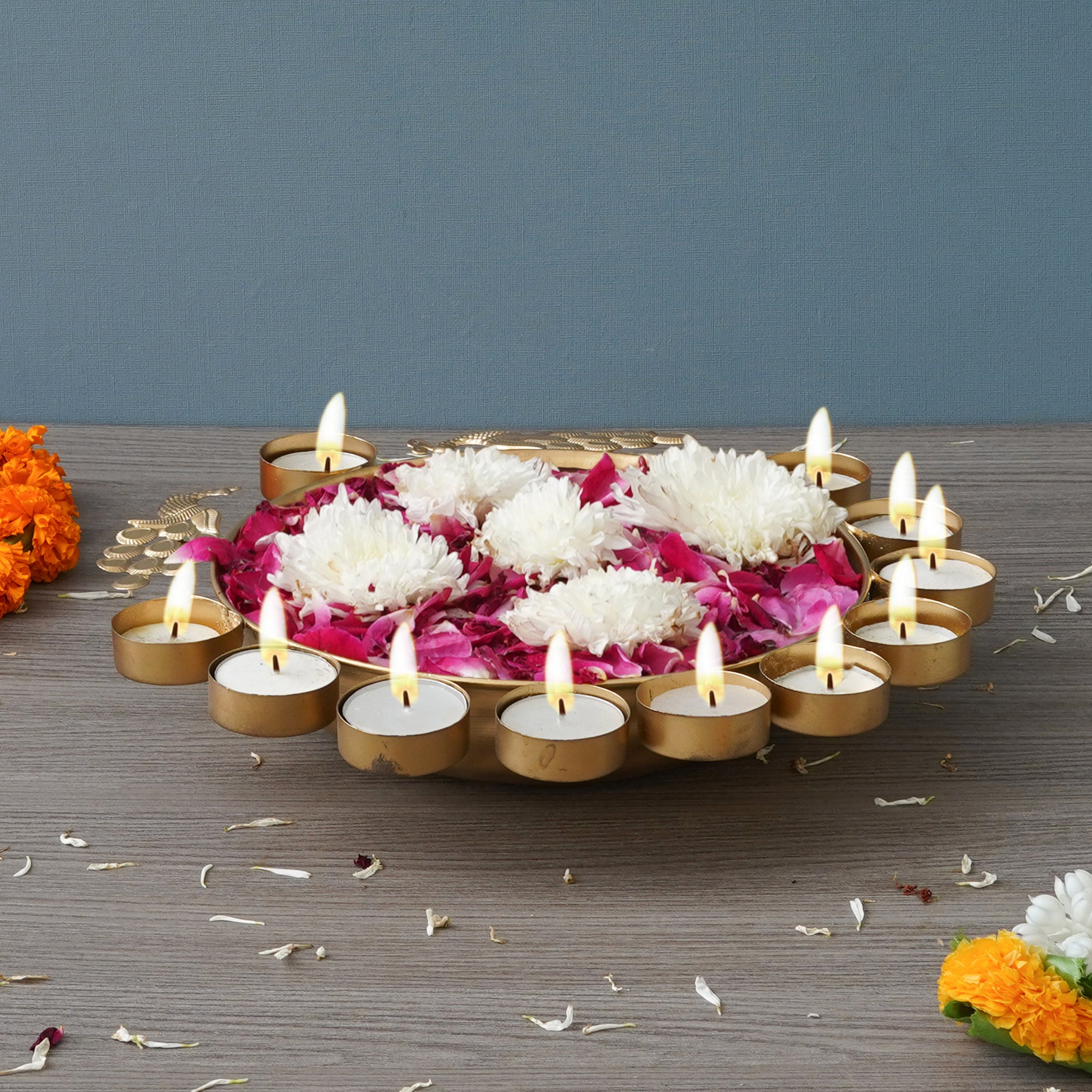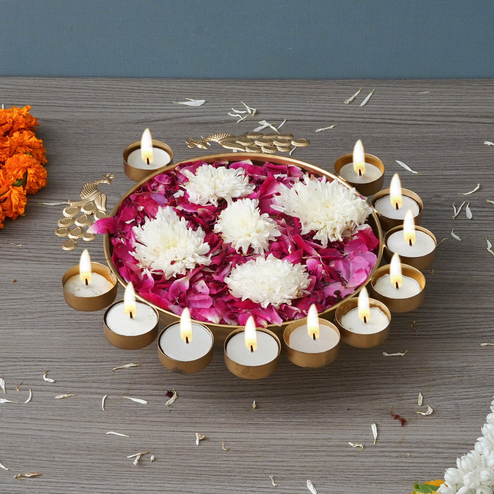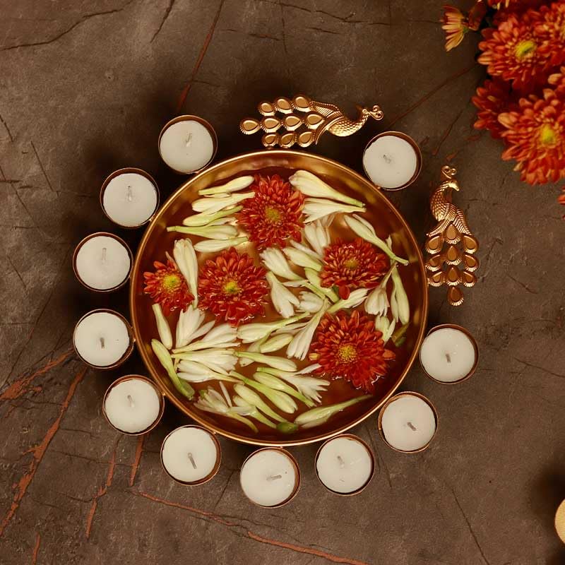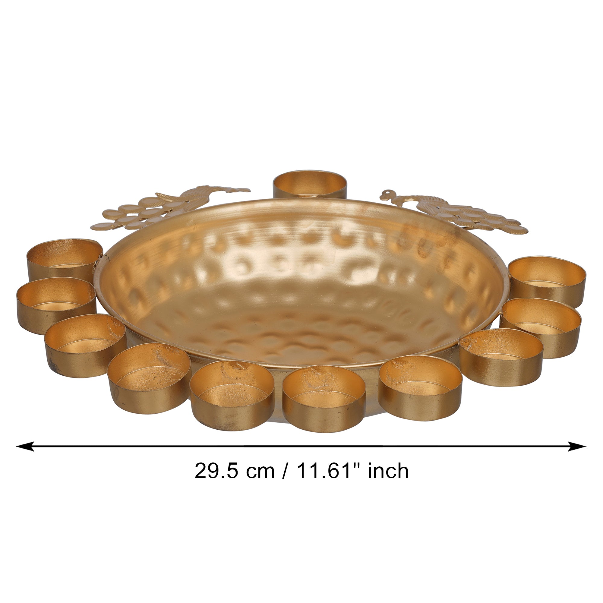 Package Content - One Golden Metal Traditional Peacock Designer Urli With 11 Tea Light Holders