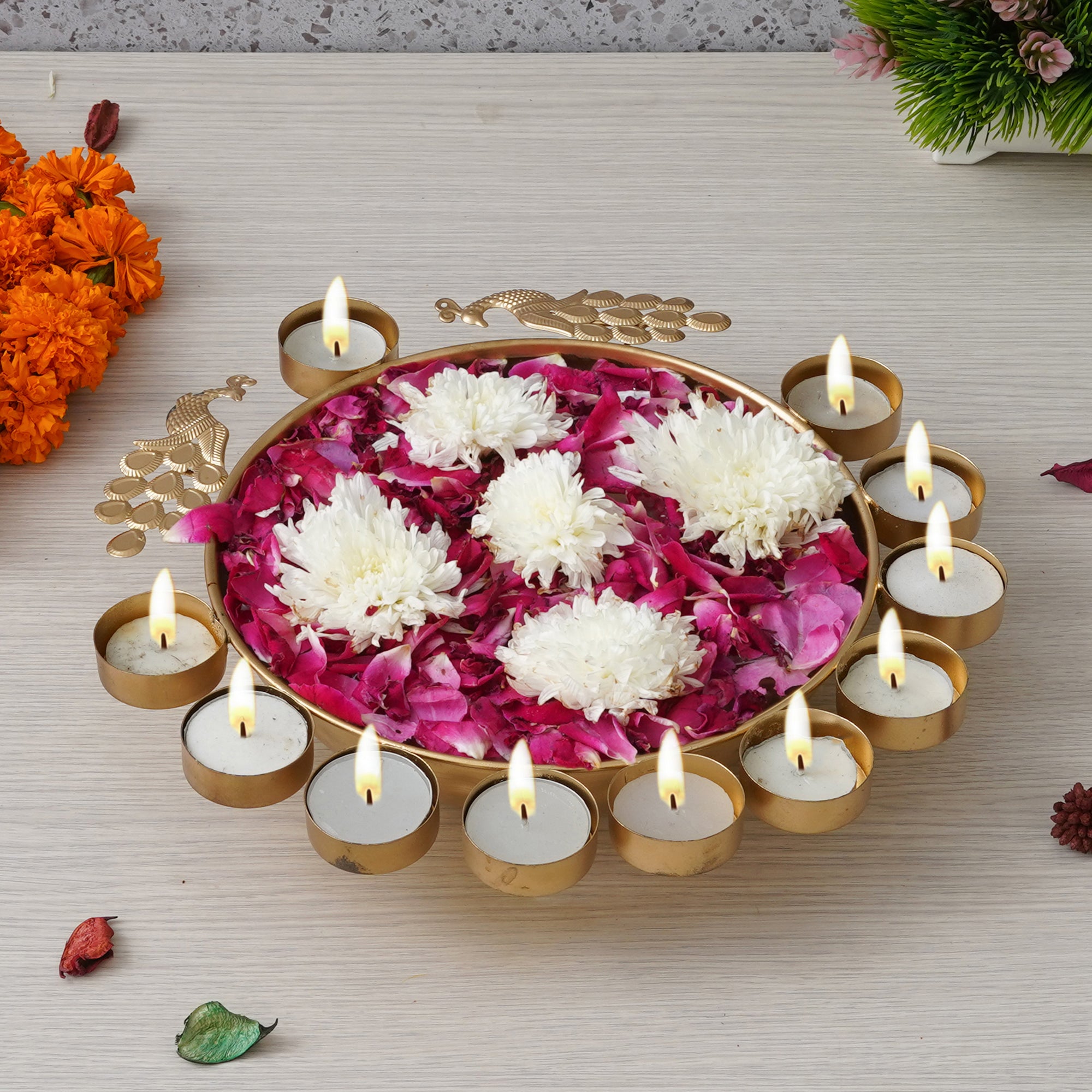 Product Description - Transform your space into a realm of opulence with our Golden Metal Traditional Peacock Designer Urli featuring 11 Tea Light Holders from eCraftIndia! This exquisite Urli seamlessly marries the timeless charm of traditional design with modern functionality, making it the perfect addition to your home decor. Place it in your living room, garden, or as a captivating centerpiece on your dining table to create an enchanting ambiance. It's an ideal gift choice for Diwali, the Festival of Lights, illuminating your loved ones' homes with radiance and festivity. Embrace the Vastu benefits it brings, ushering positivity and harmony. Elevate your decor with this golden peacock Urli and experience the magic it infuses into your living space.