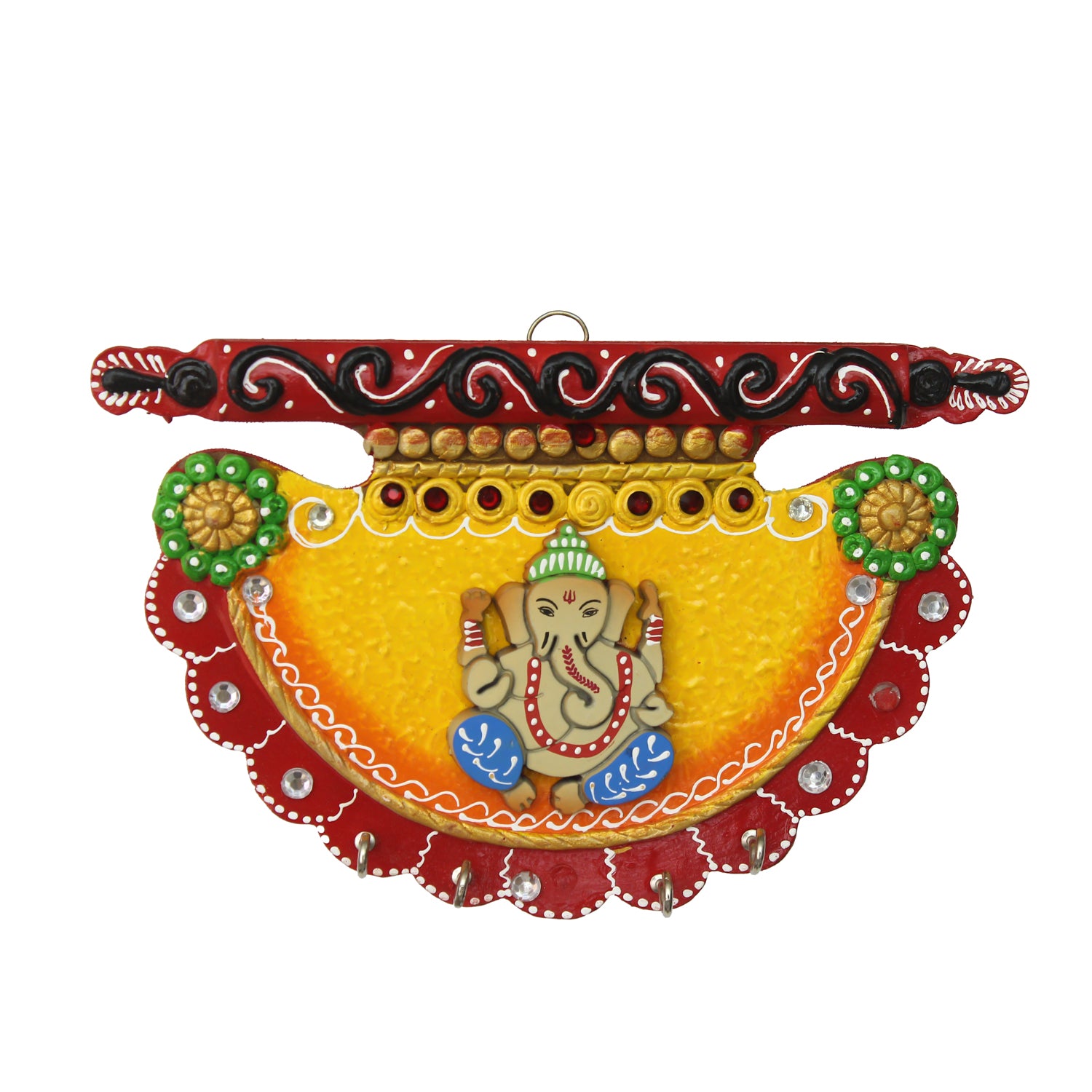Product Description - Place your keys on this beautiful "Papier-Mache Shahi Pankhi Key Holder" under the eyes of the Lord Ganesha who is sitting cross legged. The key holder has four hooks for your house, car, garage and other keys. The key knobs have been carefully designed to hold your keys. This key holder can be hung at any place in your house to keep keys secured and can also be used as a wall decoration piece. It serves as a great gift, especially around religious celebrations and festivities. Each Key Holder is diligently handcrafted by skilled artisans from the house of eCraftIndia using various traditional techniques.