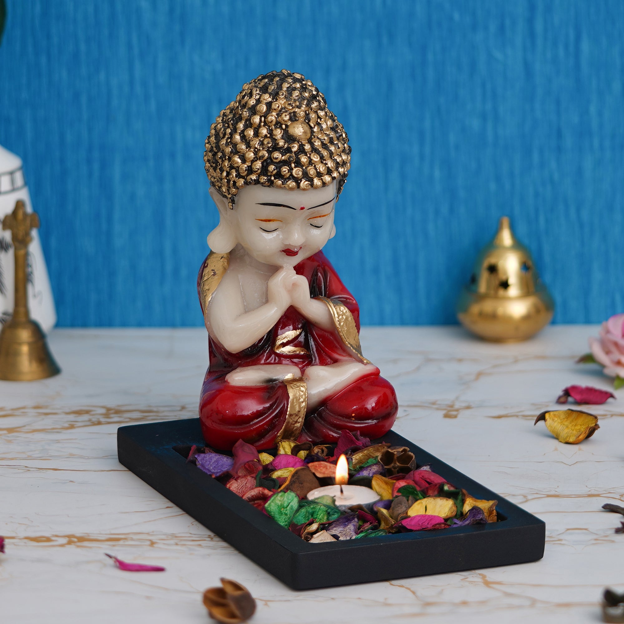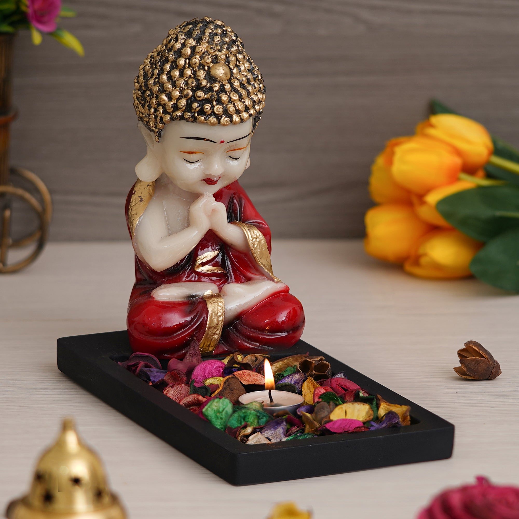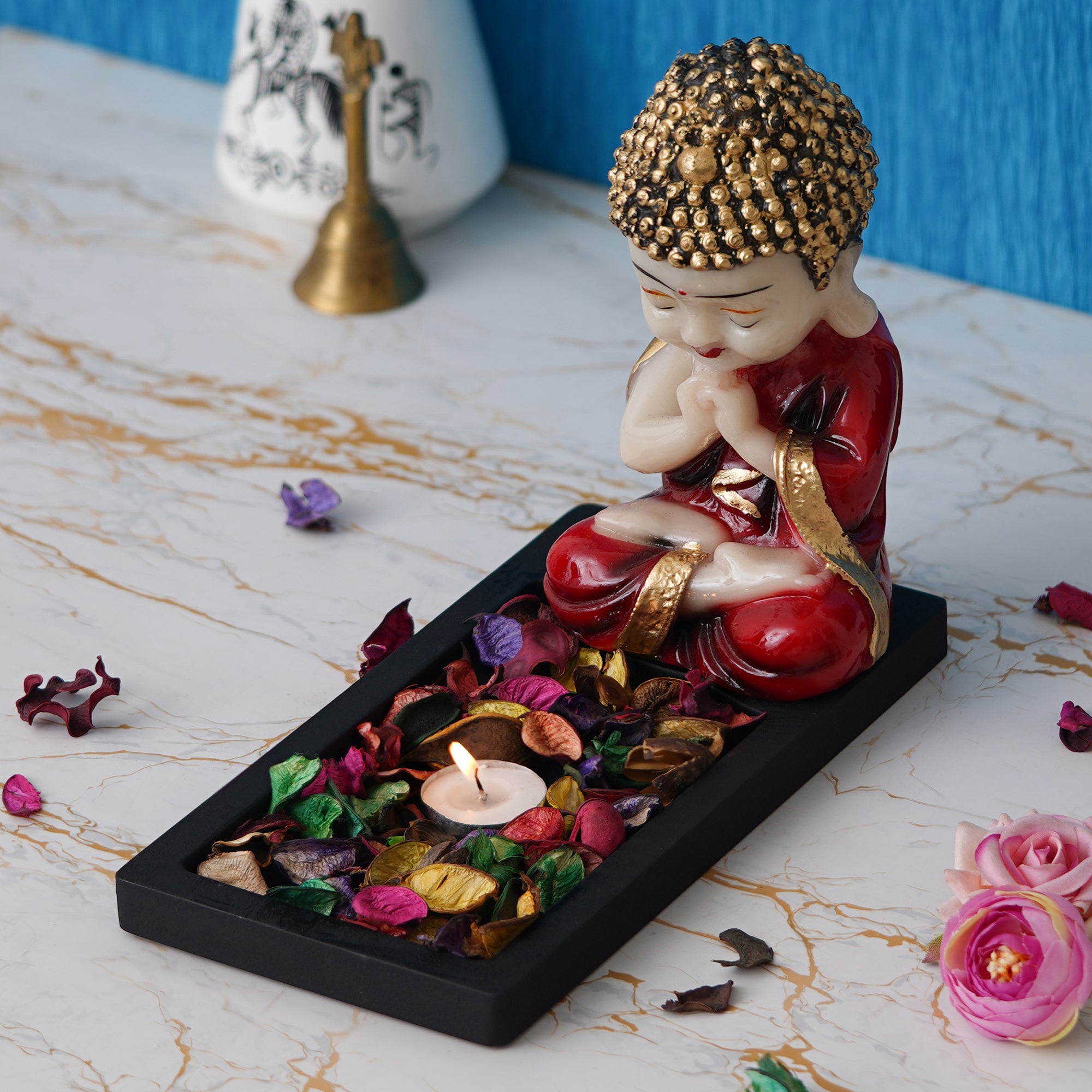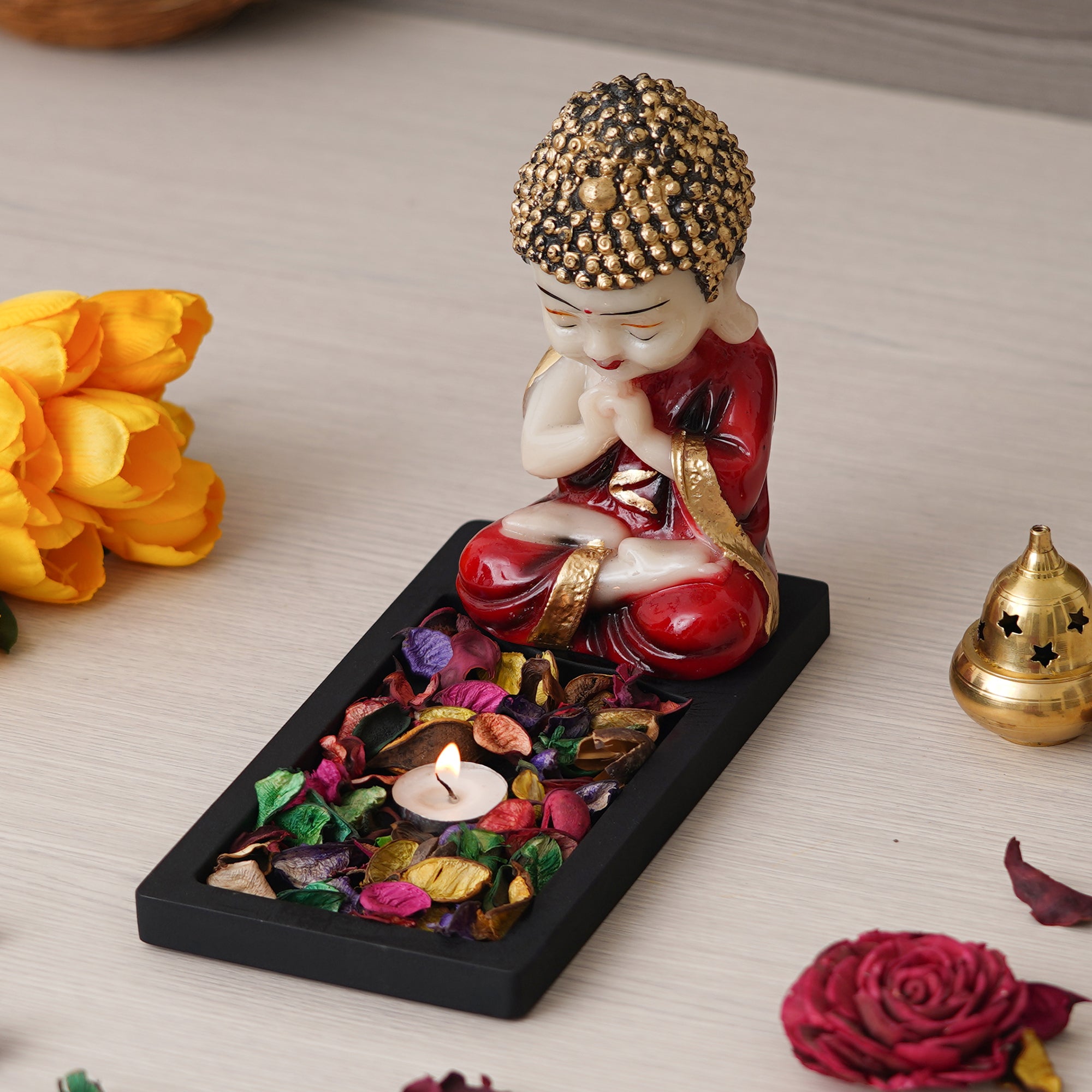 Product Description - No matter how tough your day has been, just one look at our serene Red, Gold & Black Polyresin Praying Monk Showpiece with Rectangle Wooden Base Plate, Fragranced Petals & Tealight and we can assure you that you will feel that stress slipping away. This particular polyresin God idol sits within the palm of a hand and has a wooden platform that allows you to place a tealight and some fragrant dried flower petals. The detailing on this dark-colored has to detail in gold color, that accords this piece finesse piece elegance. Choose one for your home or meditation space or consider this as a gift for a friend or loved one for their birthday or anniversary which is surely going to be adored & cherished for a lifetime.