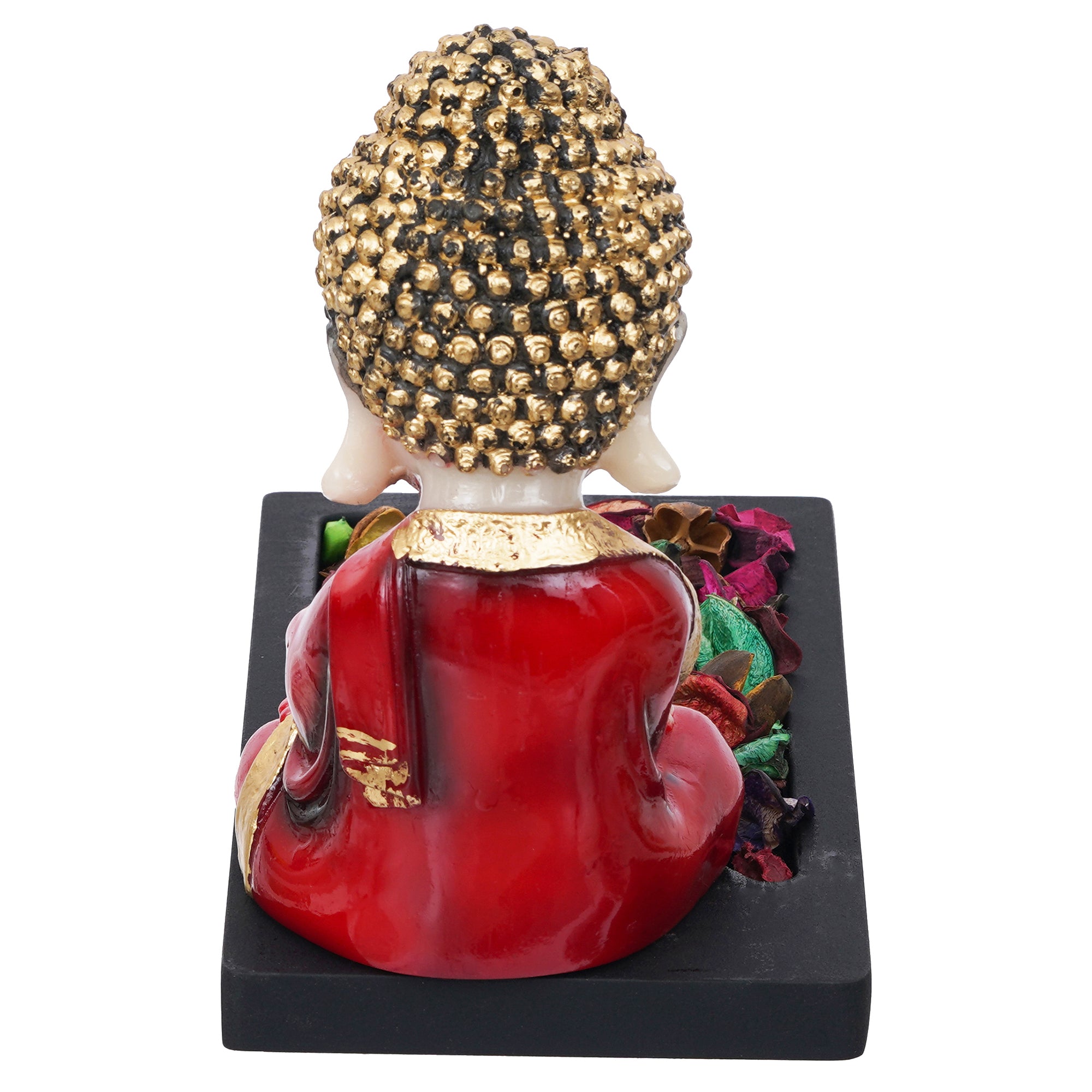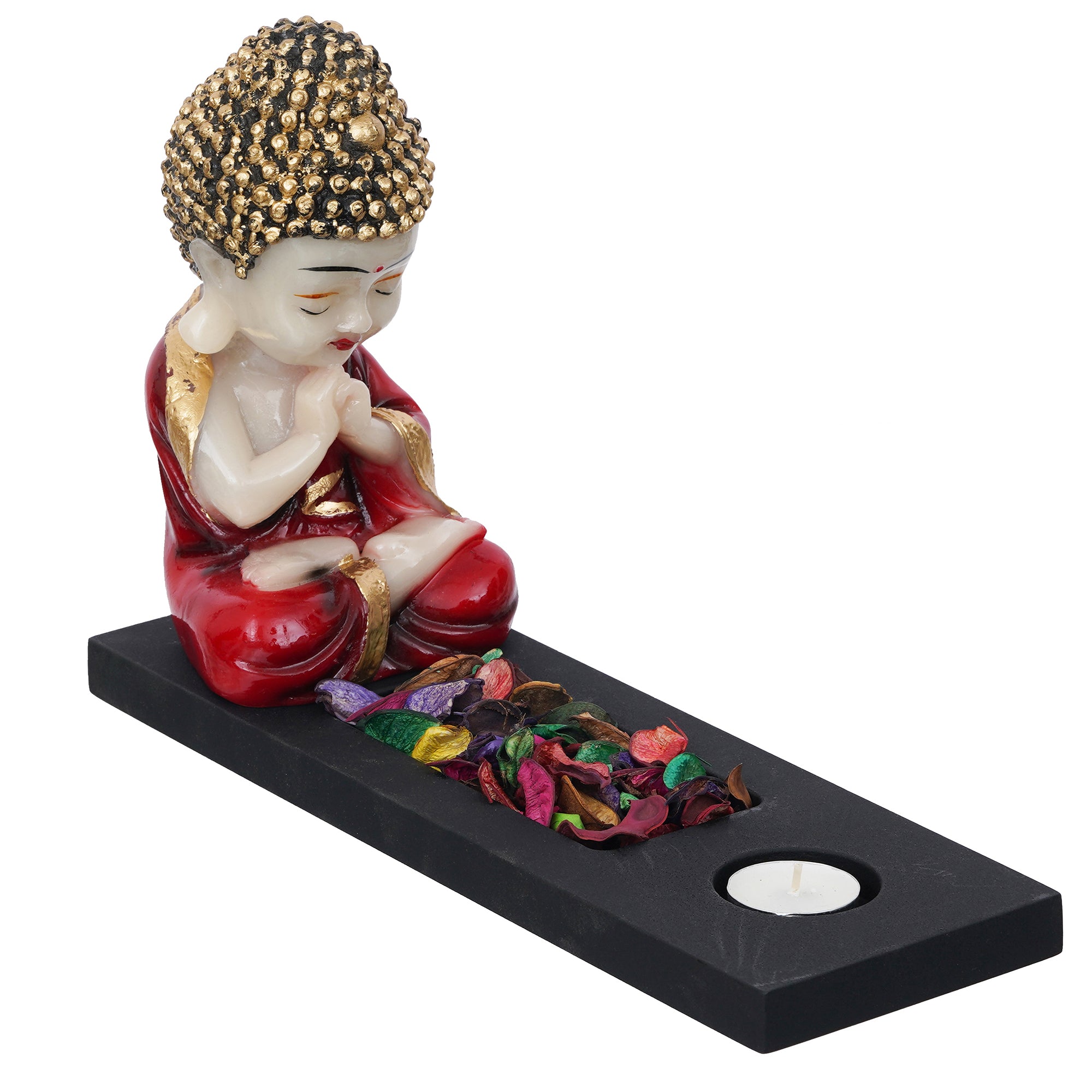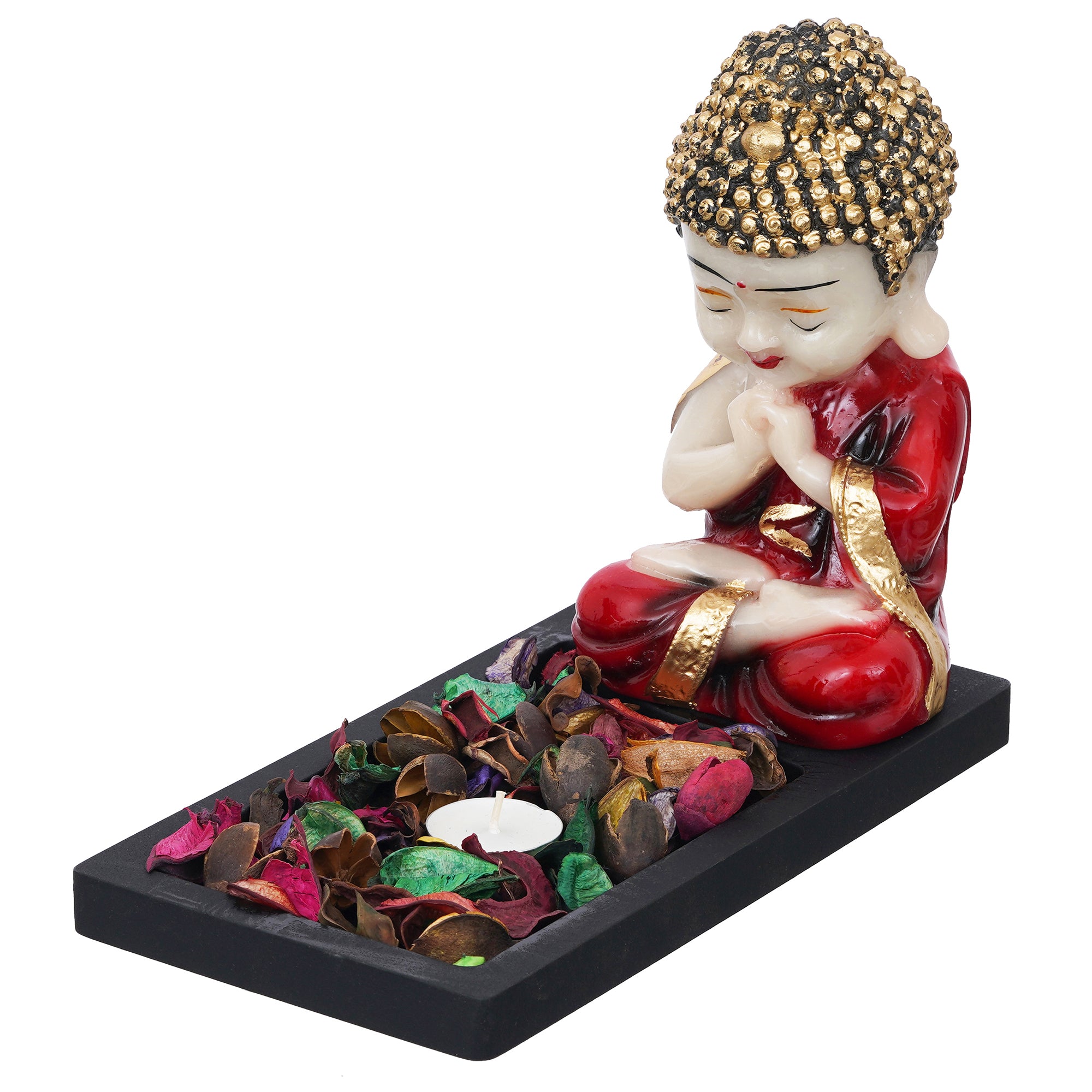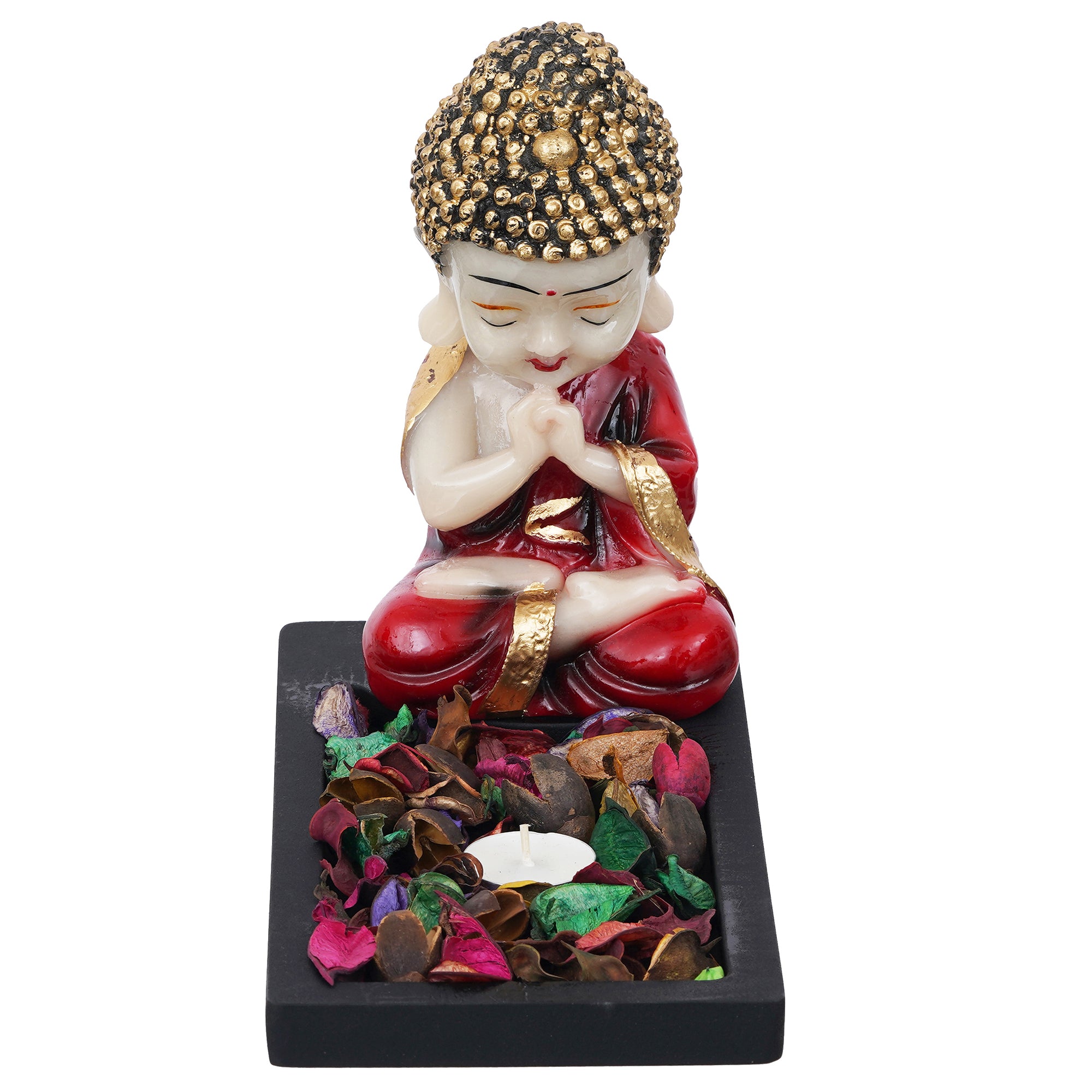 Product Description - No matter how tough your day has been, just one look at our serene Red, Gold & Black Polyresin Praying Monk Showpiece with Rectangle Wooden Base Plate, Fragranced Petals & Tealight and we can assure you that you will feel that stress slipping away. This particular polyresin God idol sits within the palm of a hand and has a wooden platform that allows you to place a tealight and some fragrant dried flower petals. The detailing on this dark-colored has to detail in gold color, that accords this piece finesse piece elegance. Choose one for your home or meditation space or consider this as a gift for a friend or loved one for their birthday or anniversary which is surely going to be adored & cherished for a lifetime.