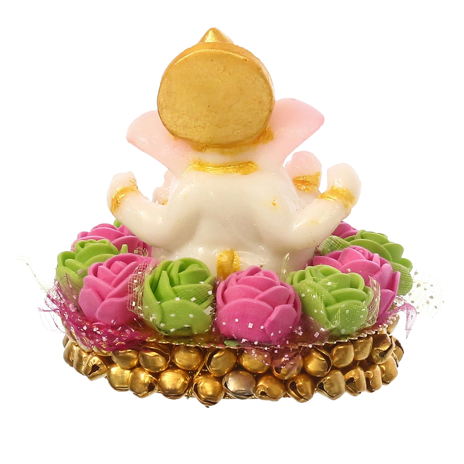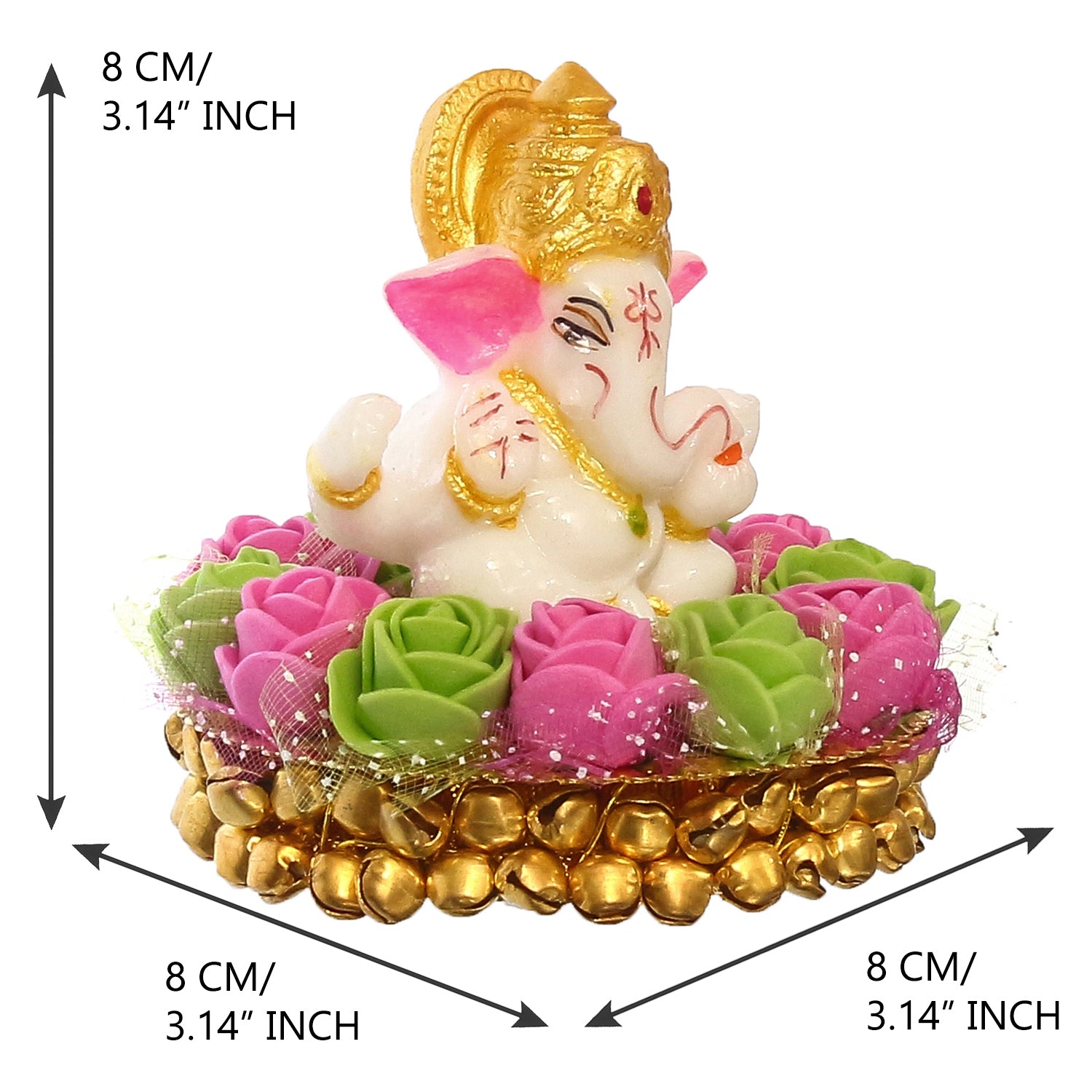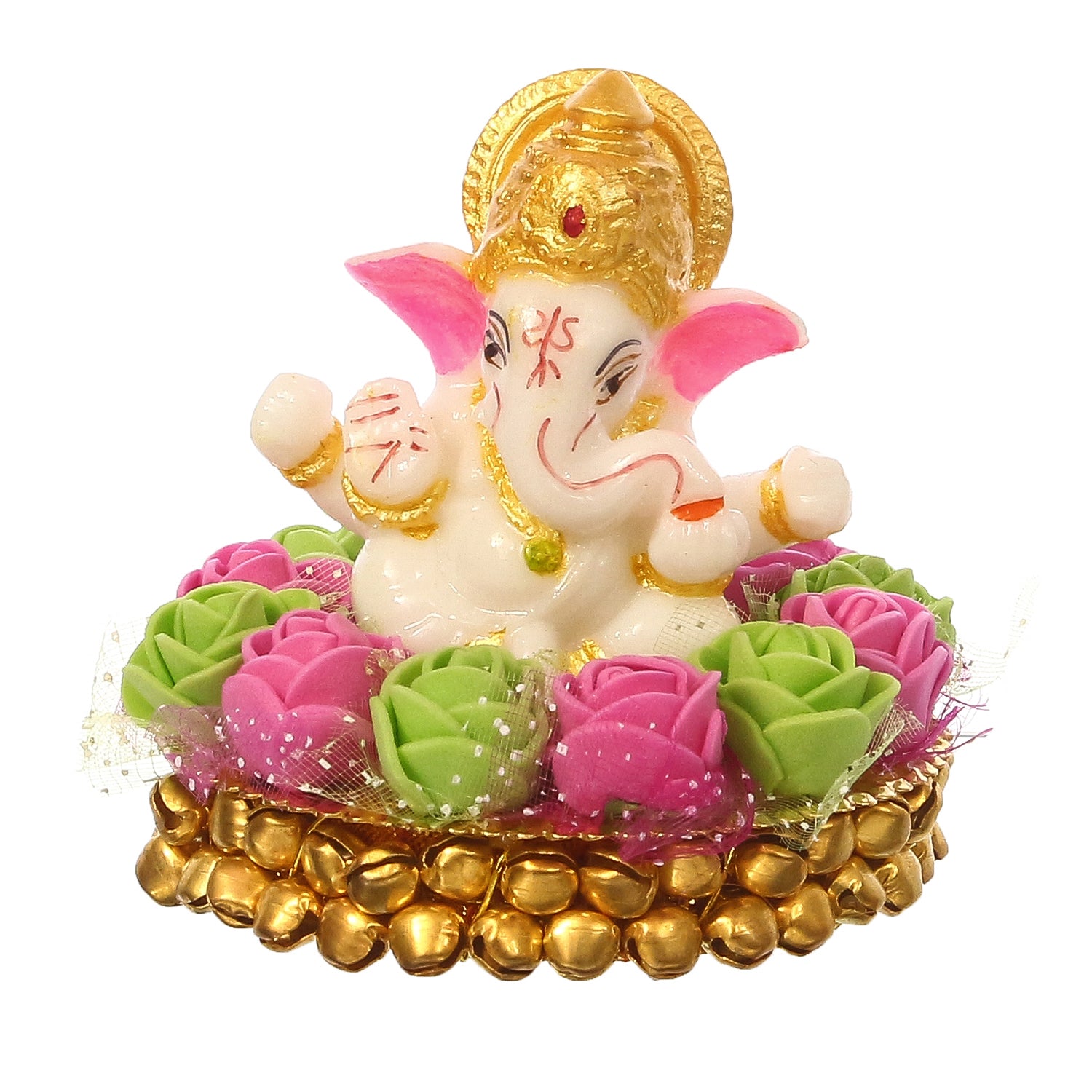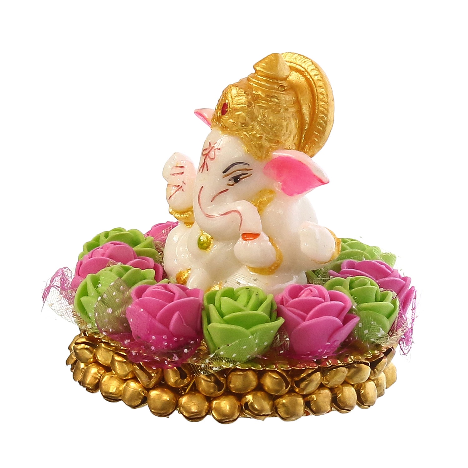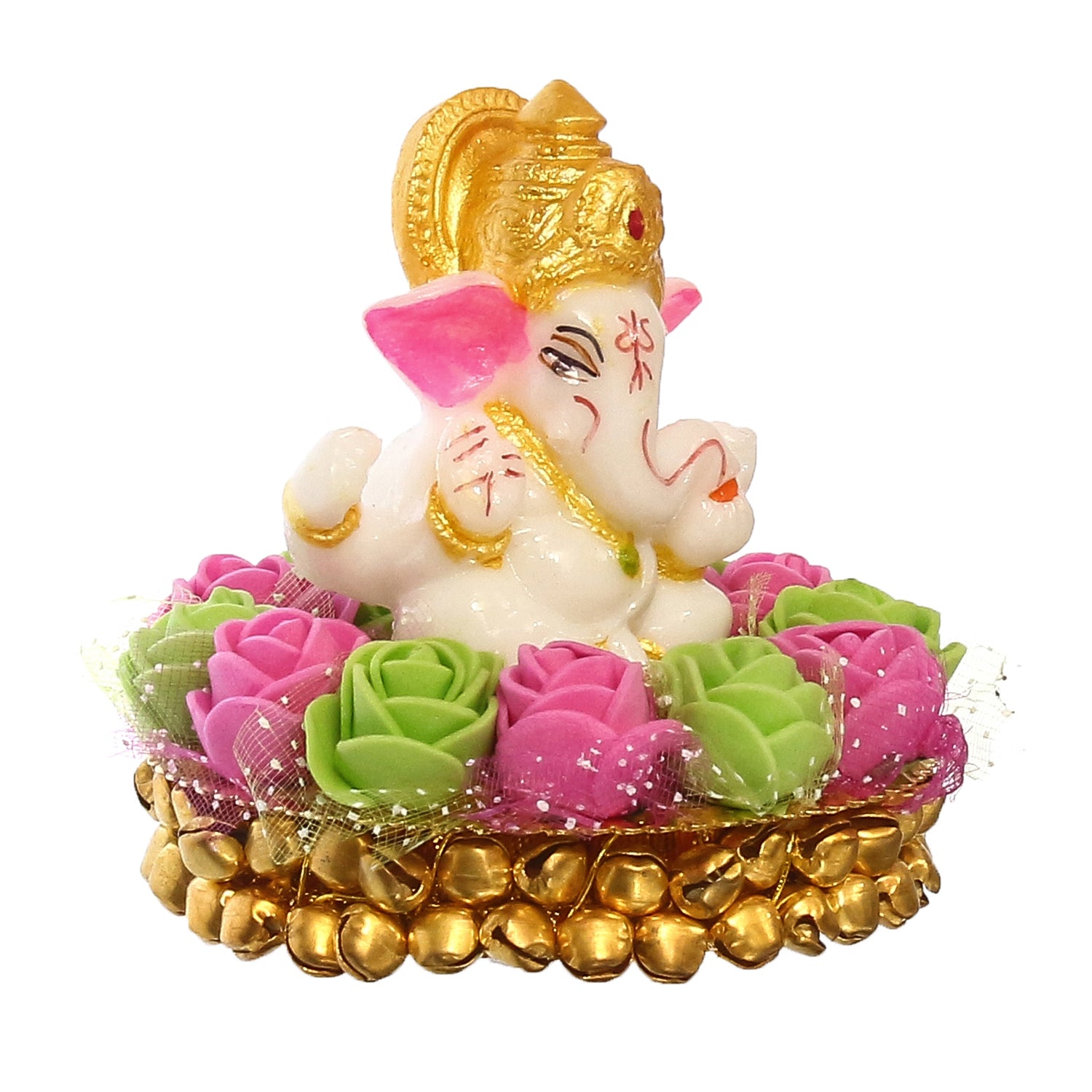 Package Content - One Lord Ganesha Idol on Decorative Handcrafted Plate with Pink and Green Flowers