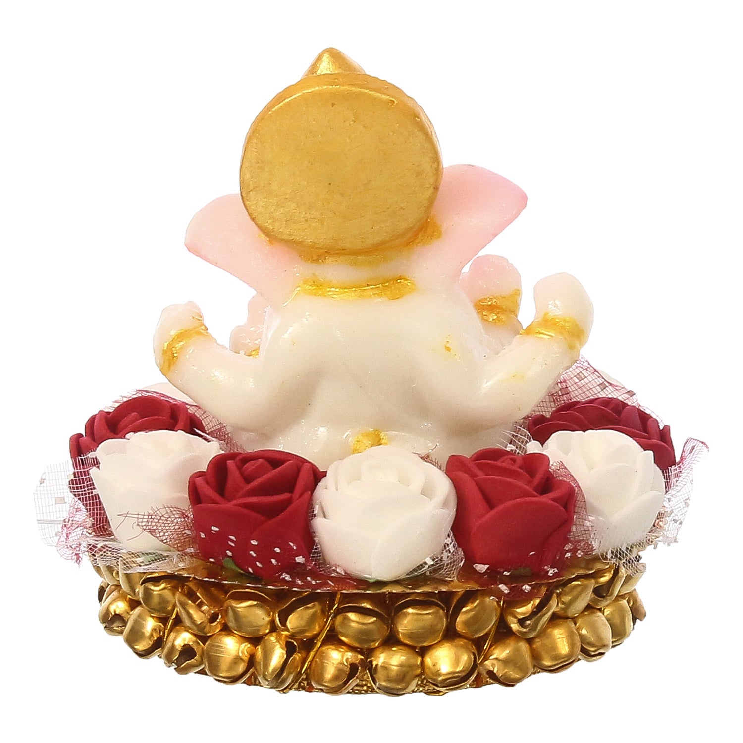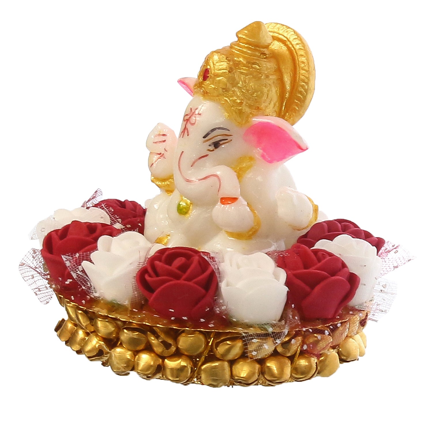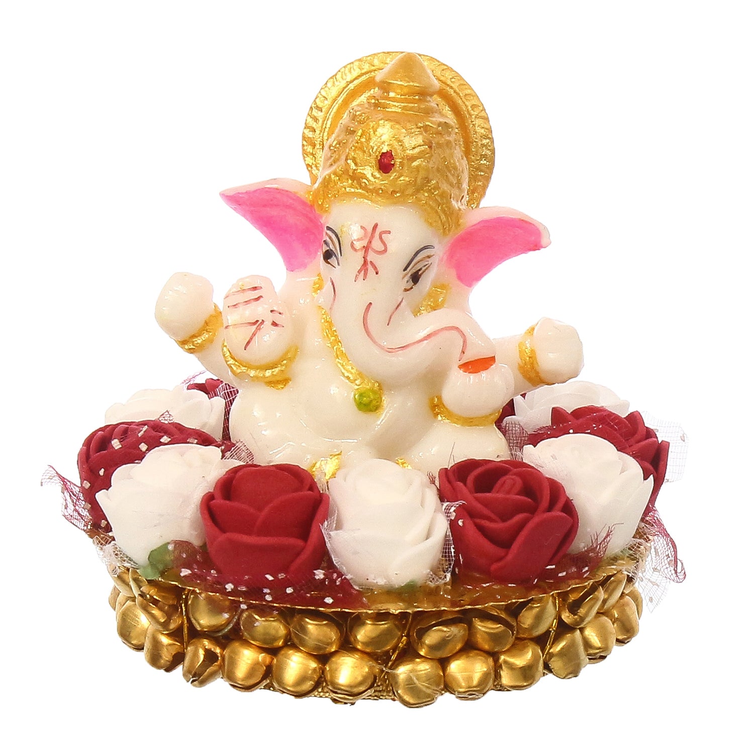 Package Content - One Lord Ganesha Idol on Decorative Handcrafted Plate with Red and White Flowers