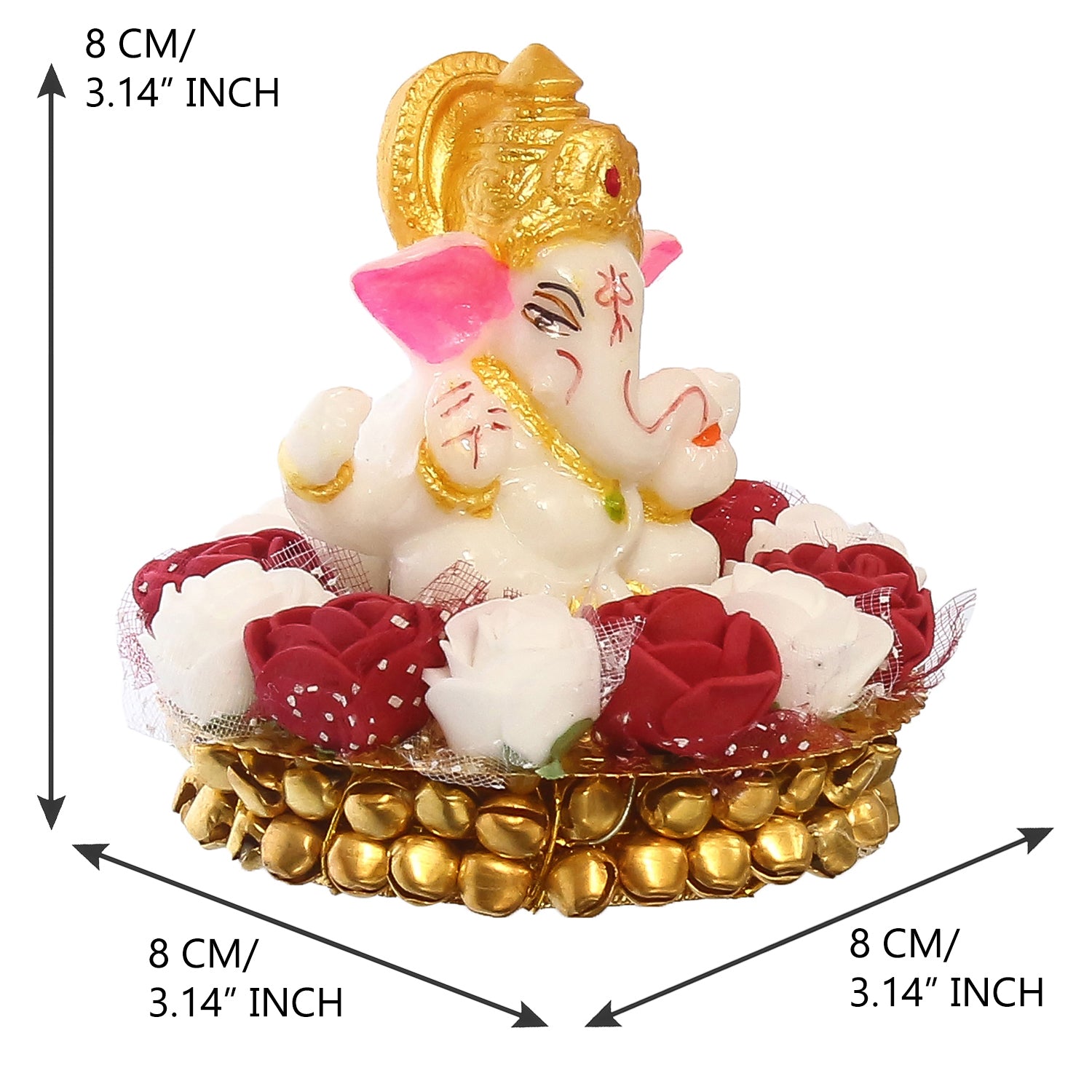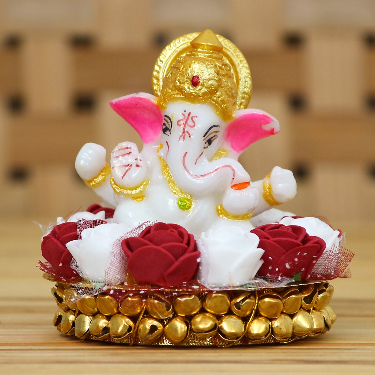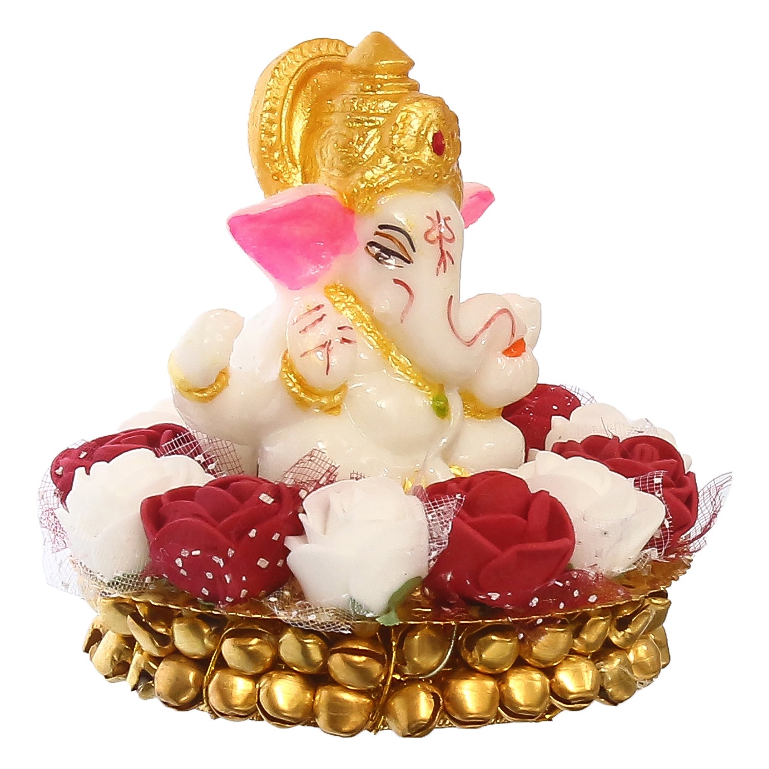 Package Content - One Lord Ganesha Idol on Decorative Handcrafted Plate with Red and White Flowers